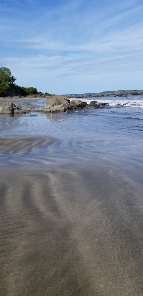 Facing the ocean, to the right was soft, sandy beach as far as the eye could see. To the left it was a little rockier.