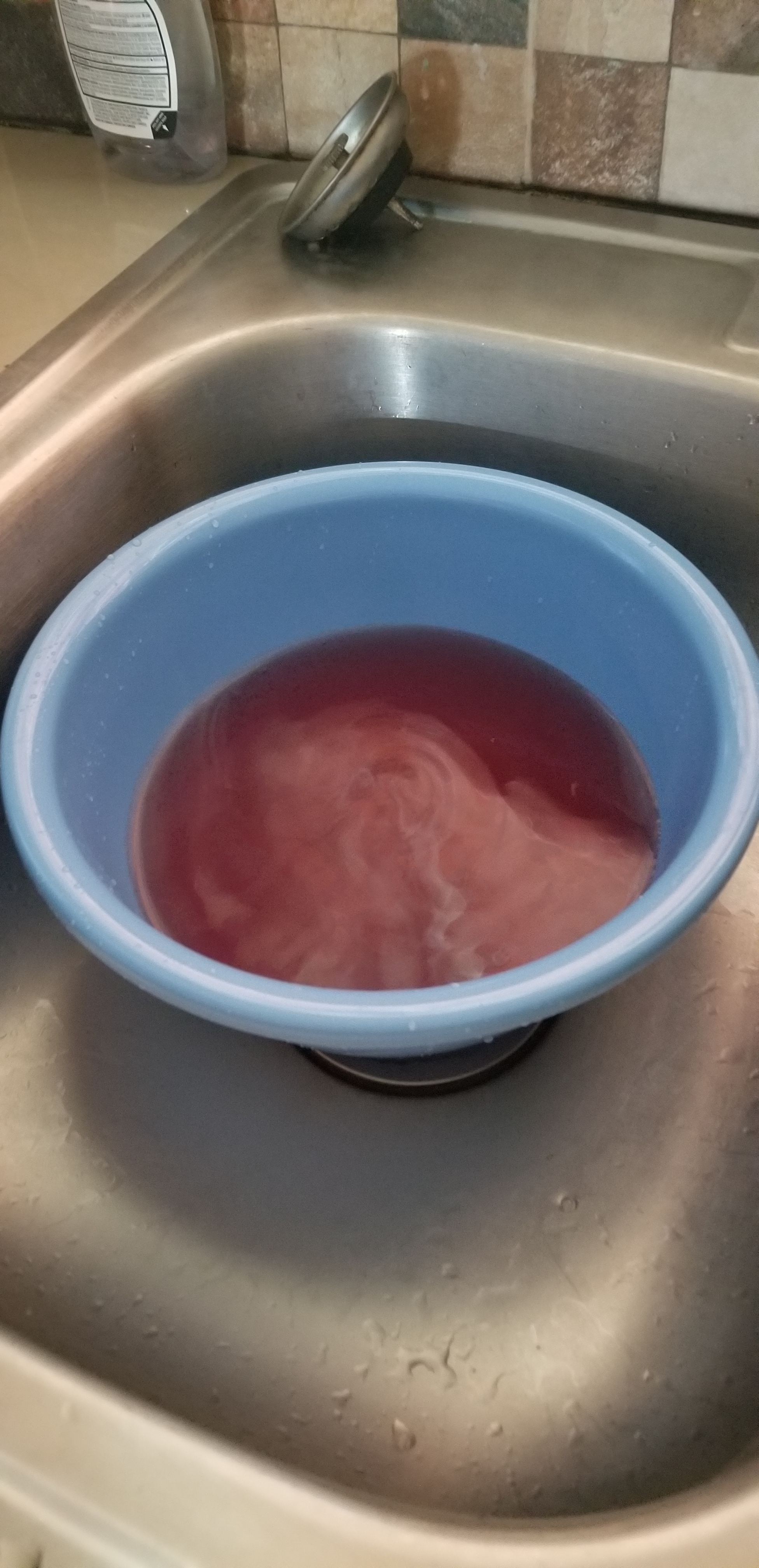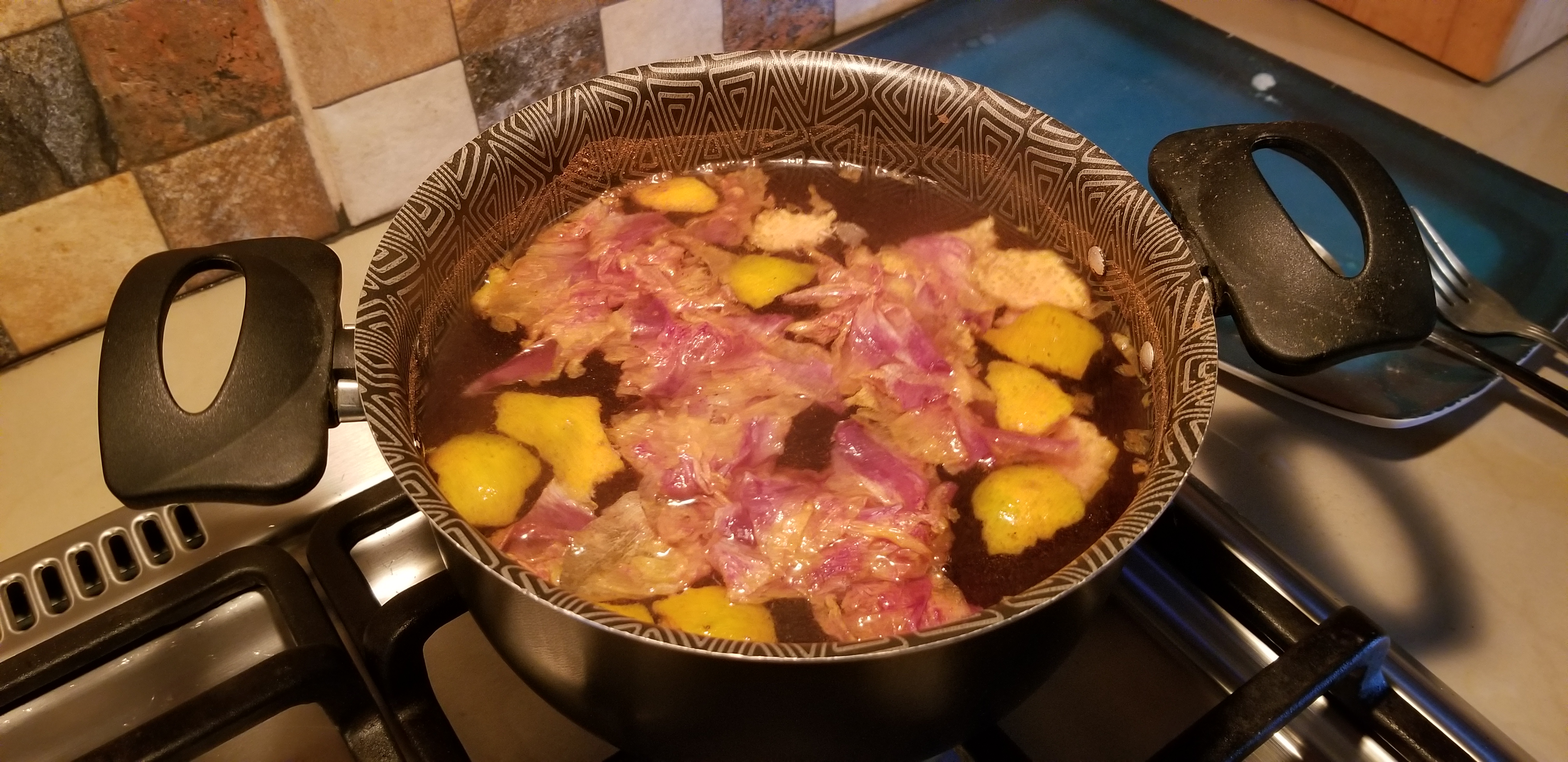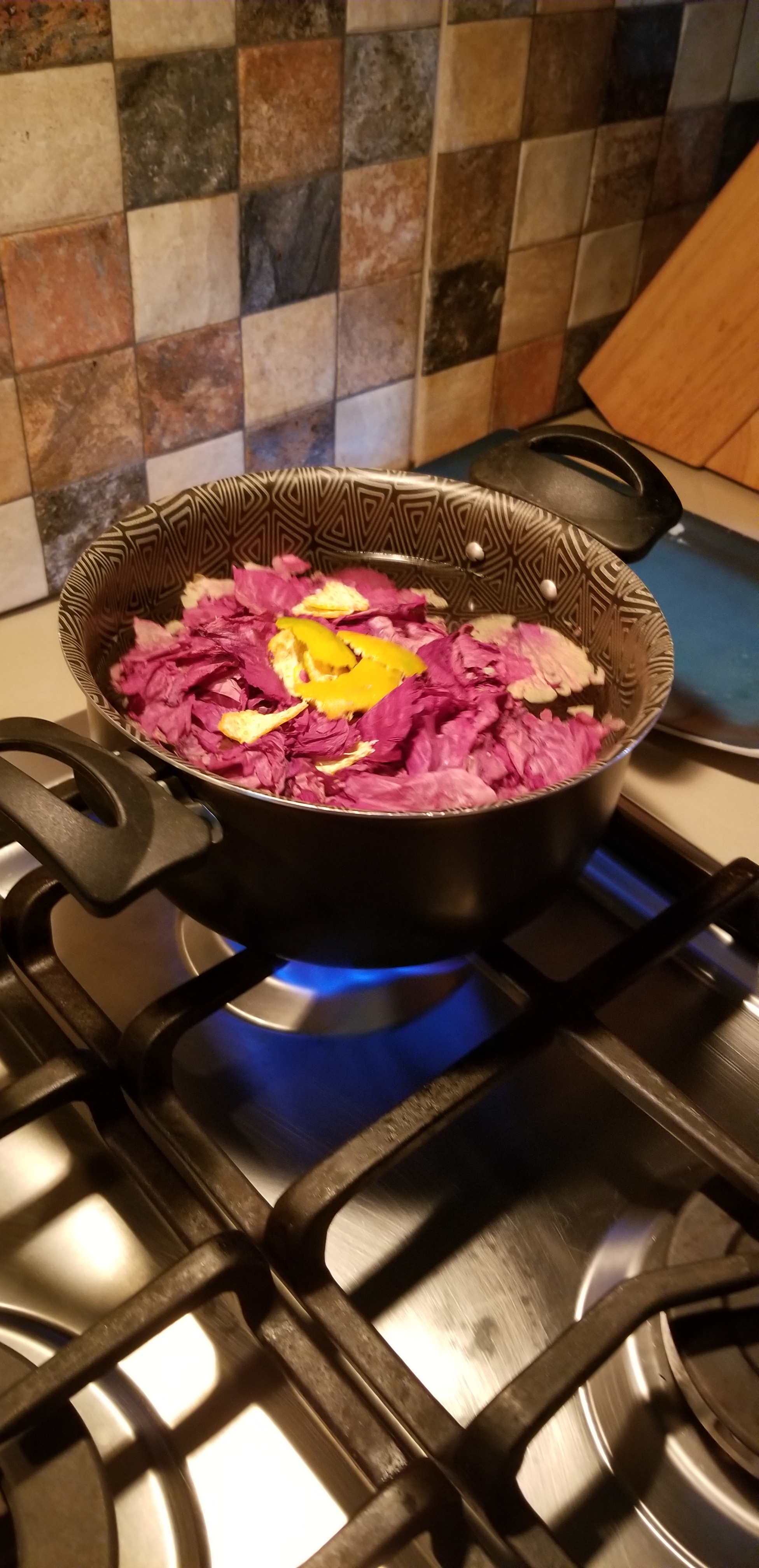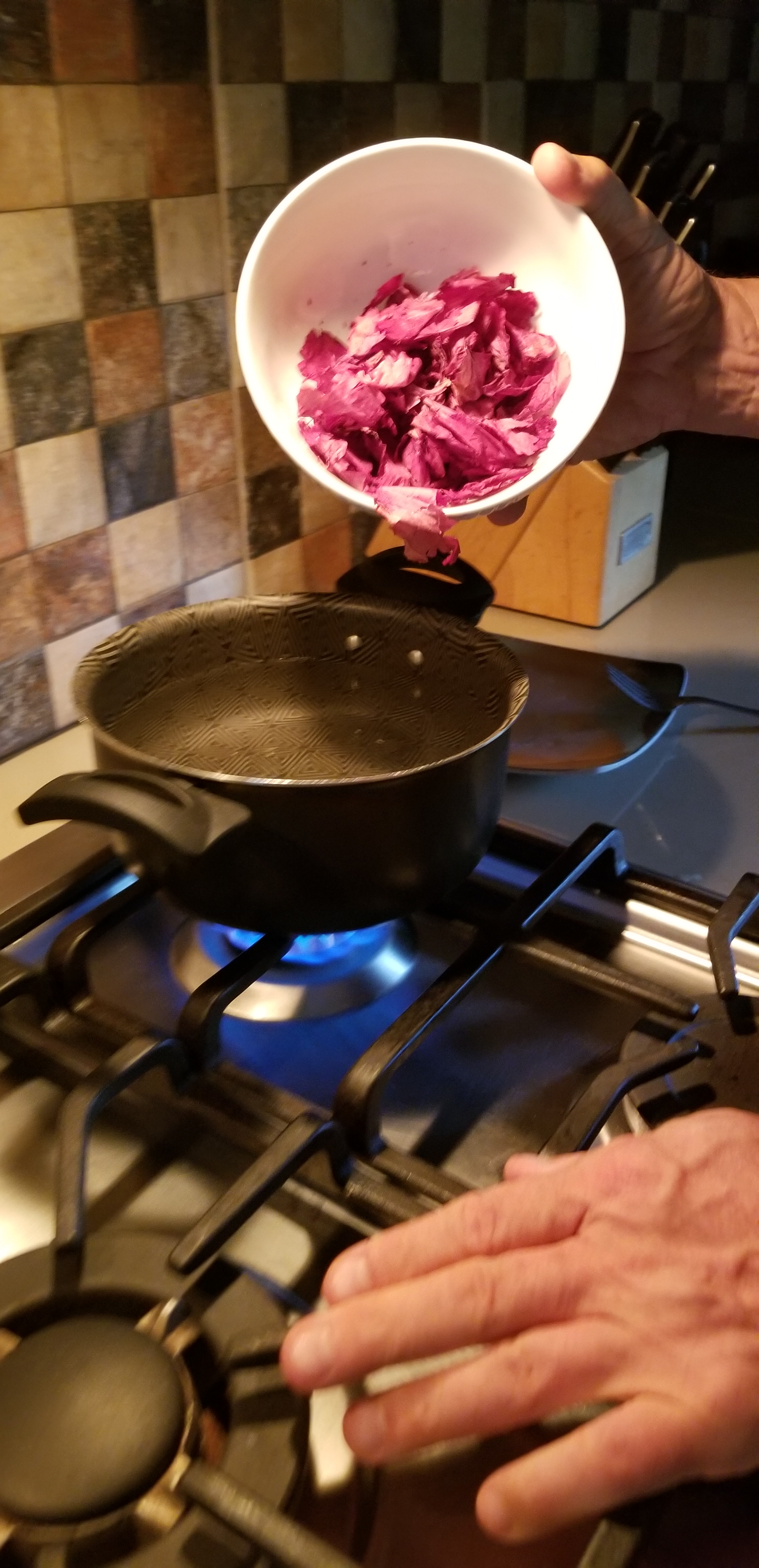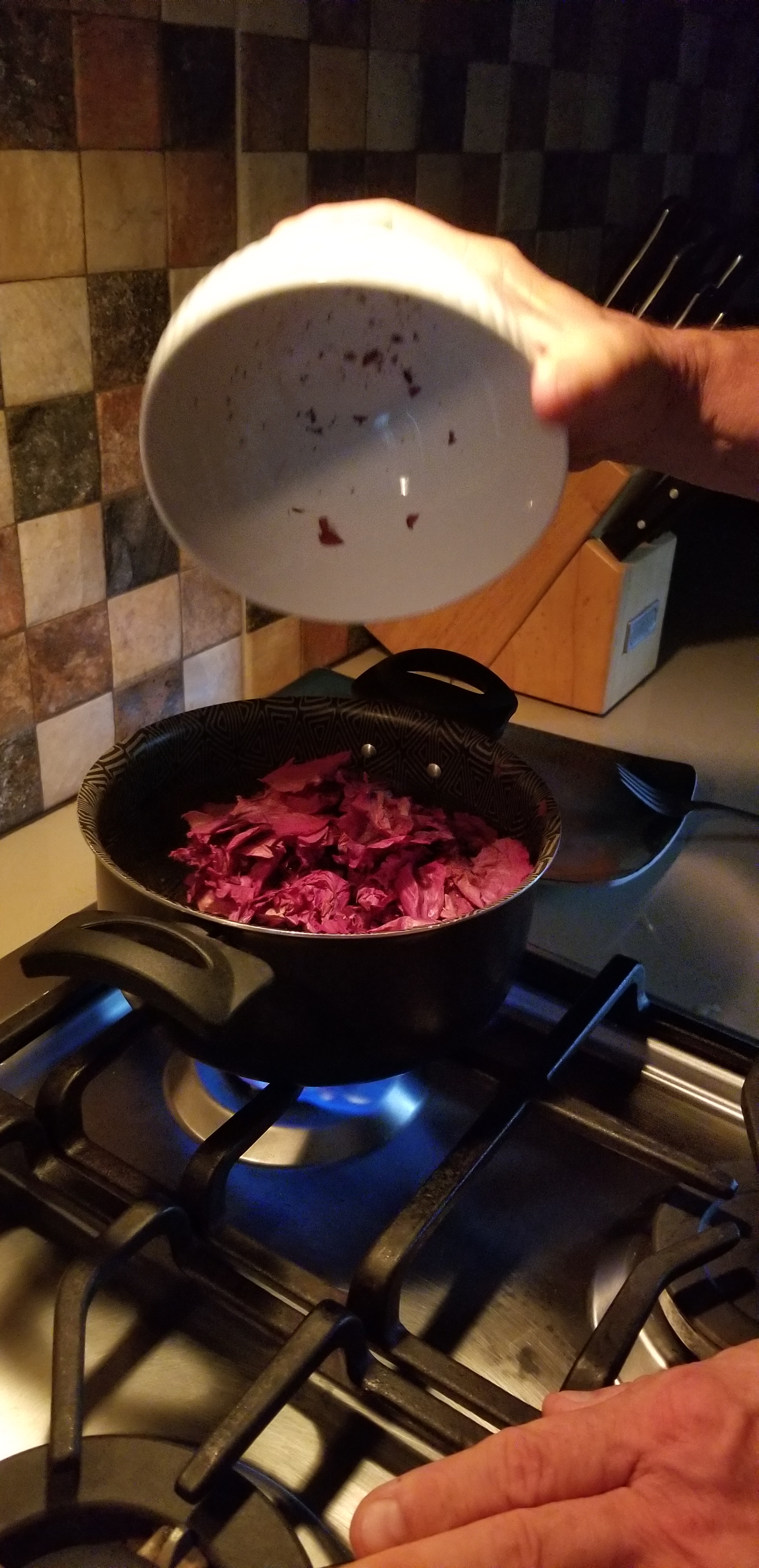 A little stirring, let it simmer for a bit, and we watched the color coming out of the Hibiscus leaves.