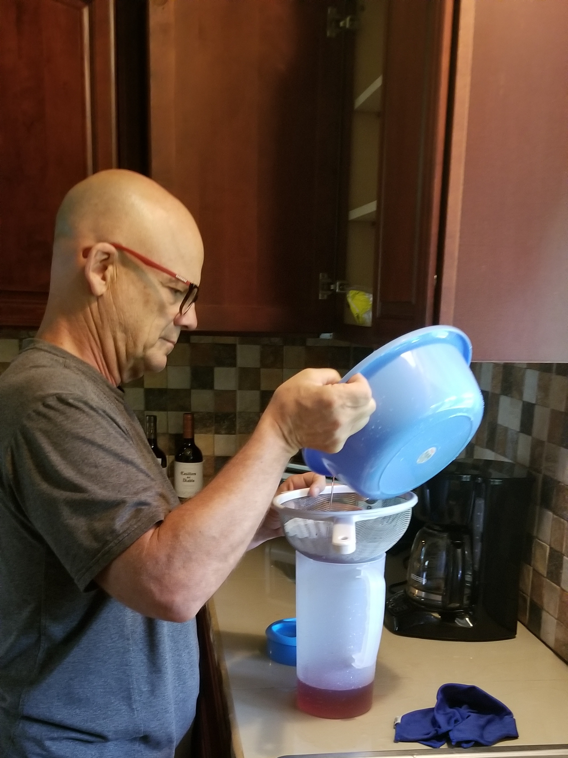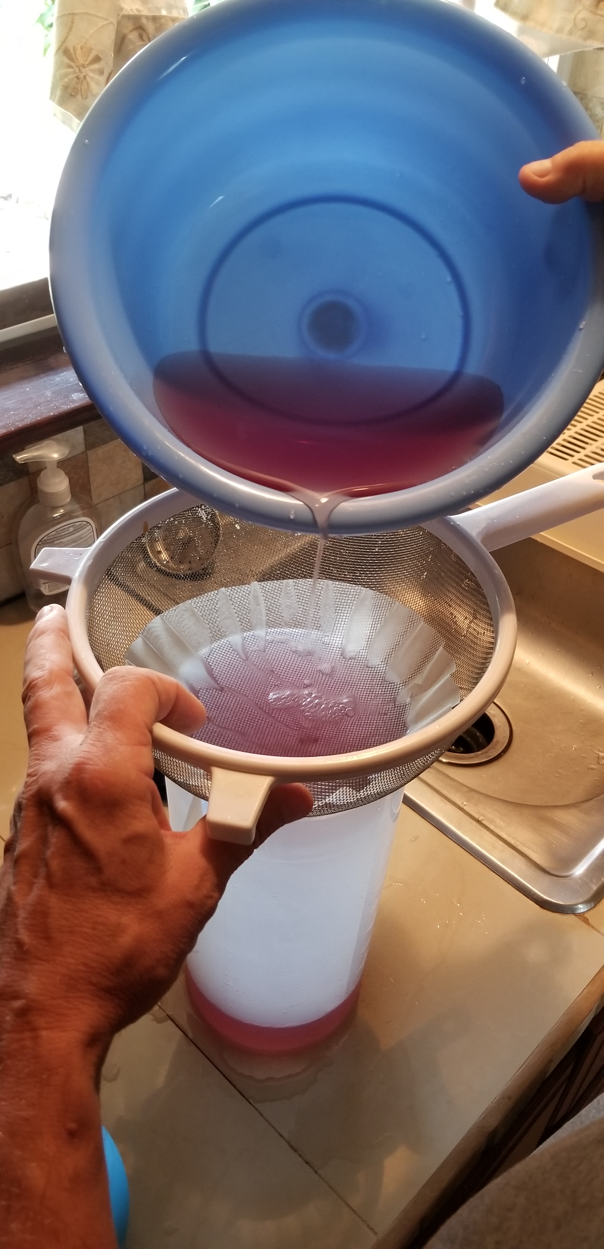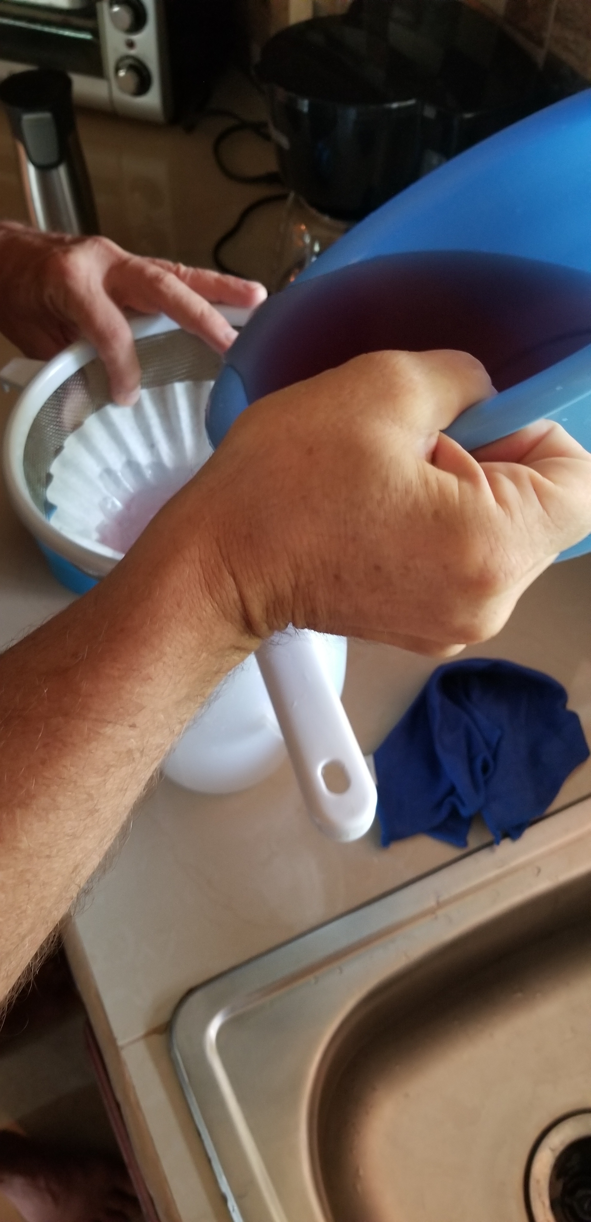 Next came the straining….we don’t have any fancy equipment so we used a coffee filter. It worked like a charm.