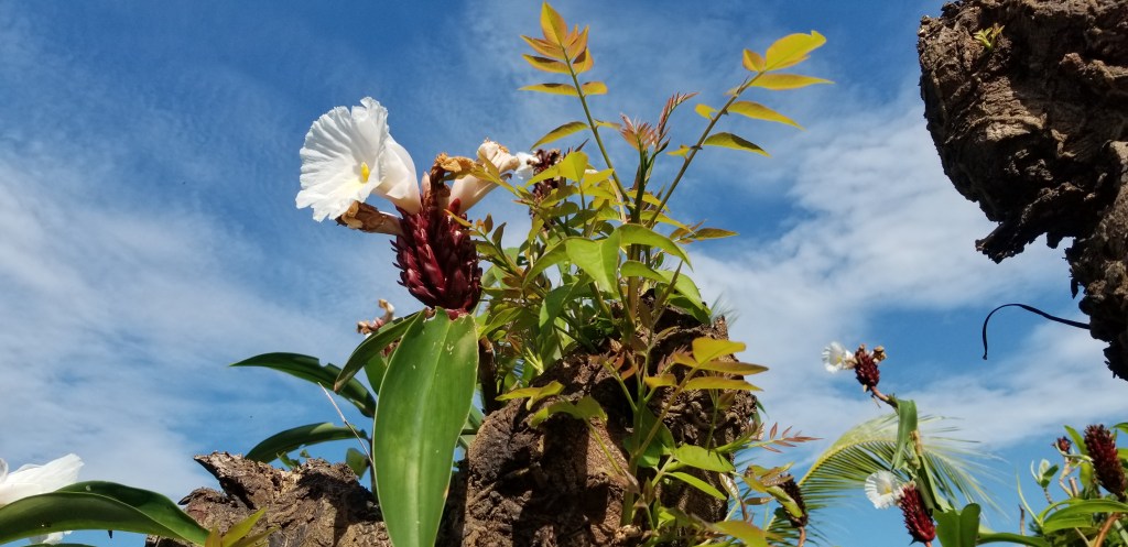 I initially thought this lovely white flower was growing out of the newly shorn ‘tree stump fence post’, but there is a plant behind it that has shot up.