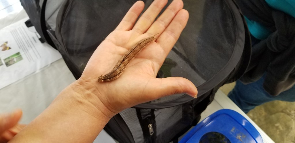 This young man had a lot of information to share, from showing us eggs on a leaf, to caterpillars, chrysalis, and the eggs covered in mesh bags for protection from predators.