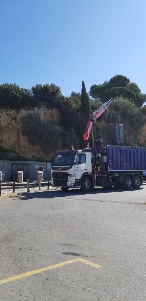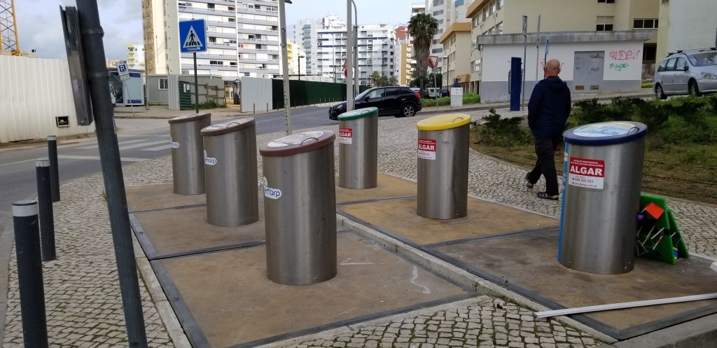 Garbage bins are underground. The truck comes around, lifts the bins up and the bottom opens up to empty! Seriously how cool is that. Not having to deal with snow or ice is an advantage here for sure.