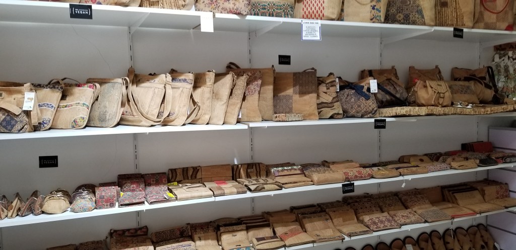 I haven’t done any shopping here, when you travel with only carry on luggage there is no space for extras. However, couldn’t resist going to a cork store and getting one item. Have to be careful though, not all cork is created equal and not all made in Portugal.