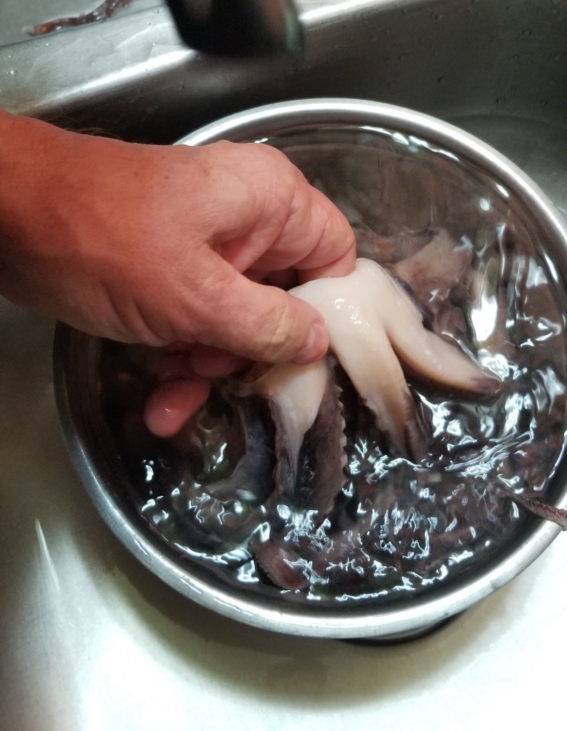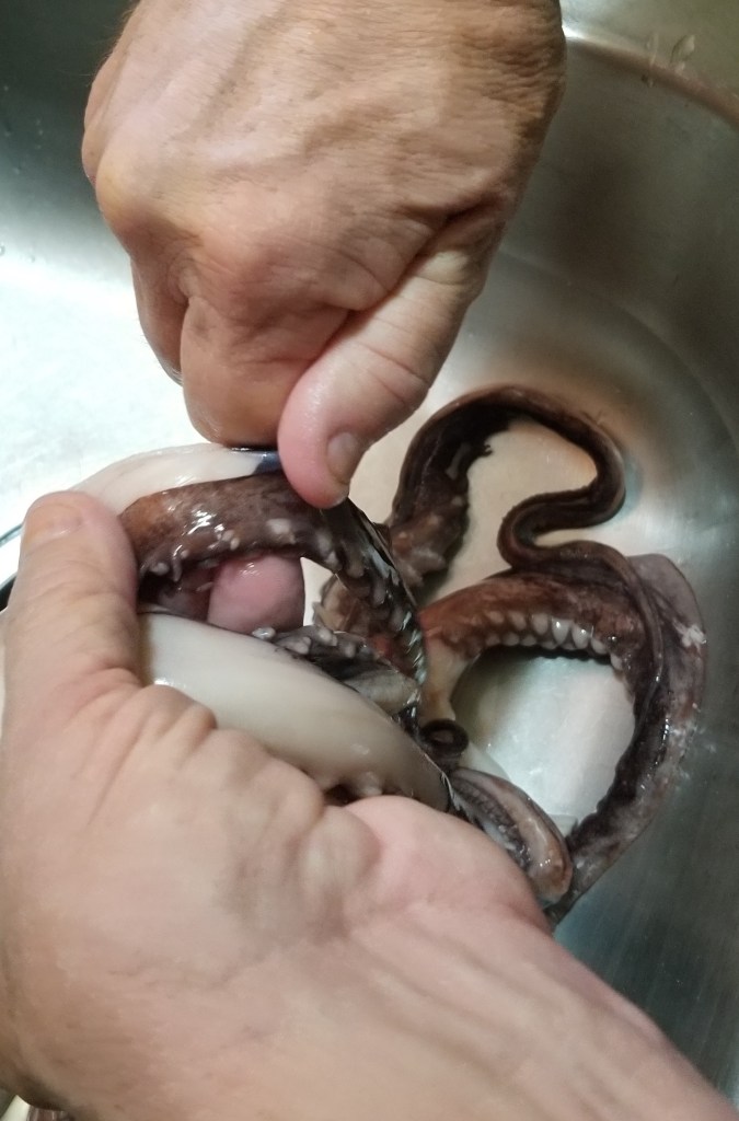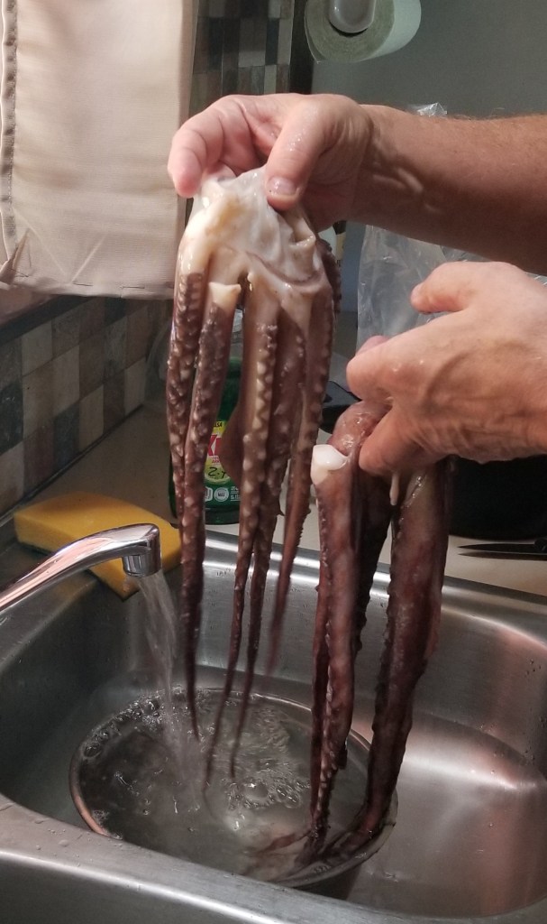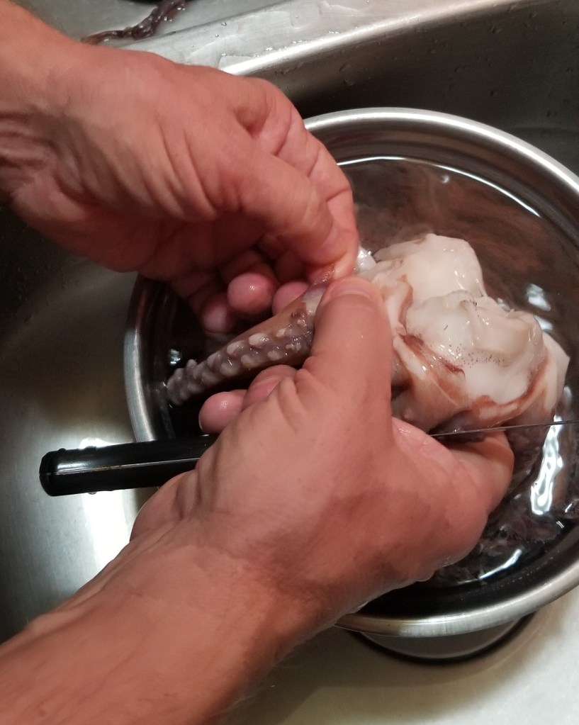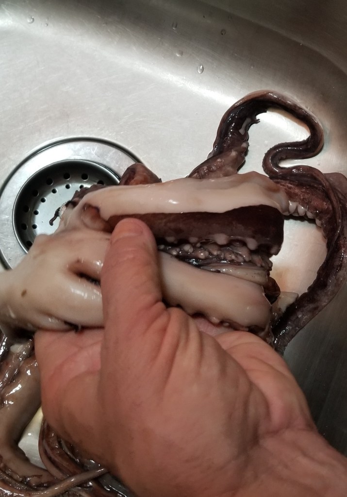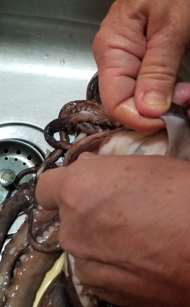 First we had to do a search of how to clean and cook those creatures. There is a ton of information on the internet with lots of differing suggestions. Luckily for us the head, ‘beak’ (whatever that is) and guts….oops I meant entrails, had been removed. Thankfully Daryl did the dirty work. Although if I am being truthful, Daryl did all the work and I took pictures.