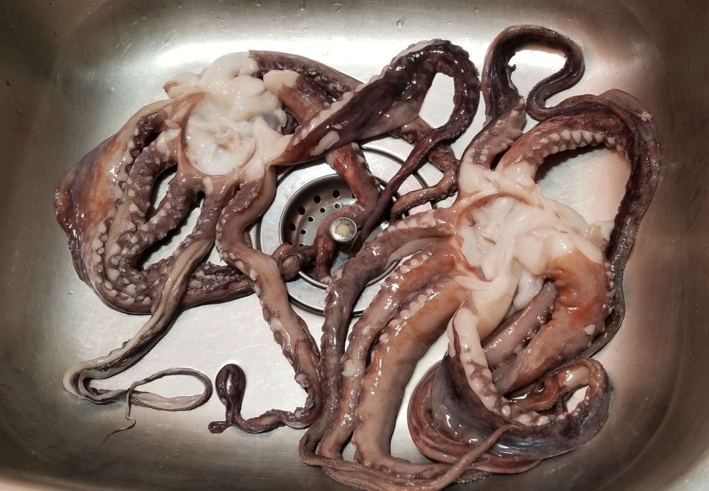 We now had two beautifully cleaned octopus….except for the skin. We tried removing that but it did not come off very easily.
