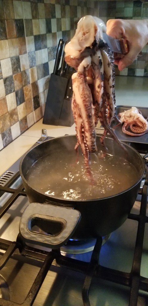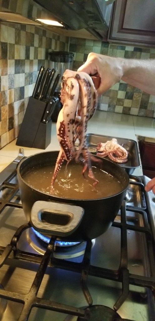 Pretty well everything we read said to dunk the cleaned octopus in a large pot of boiling water. I think the purpose of this is to curl up the tiny little ends. We did it, although it wasn’t clear if just the tips should be dunked or the entire thing…..so in it went.