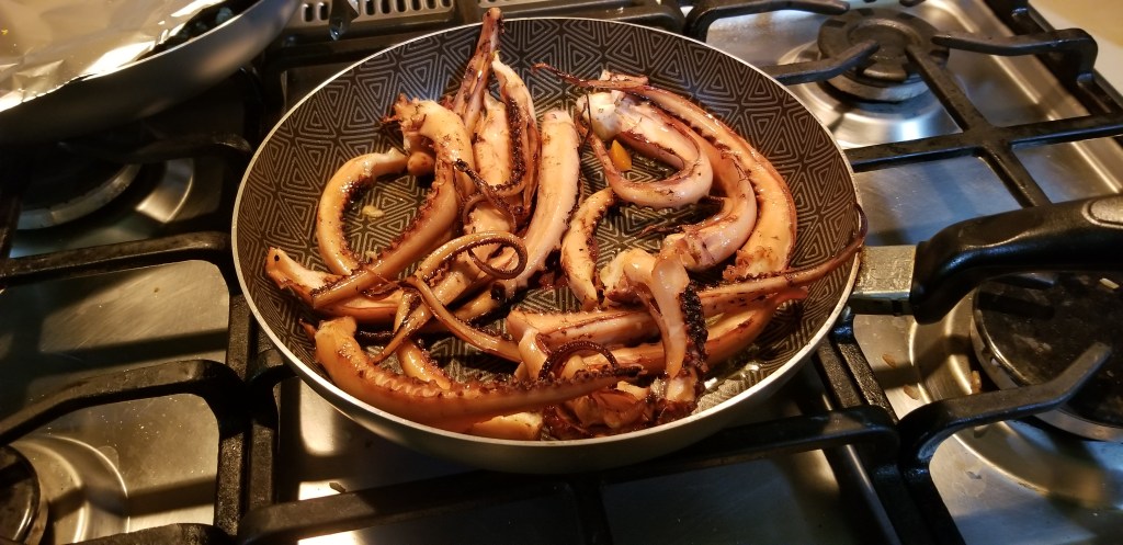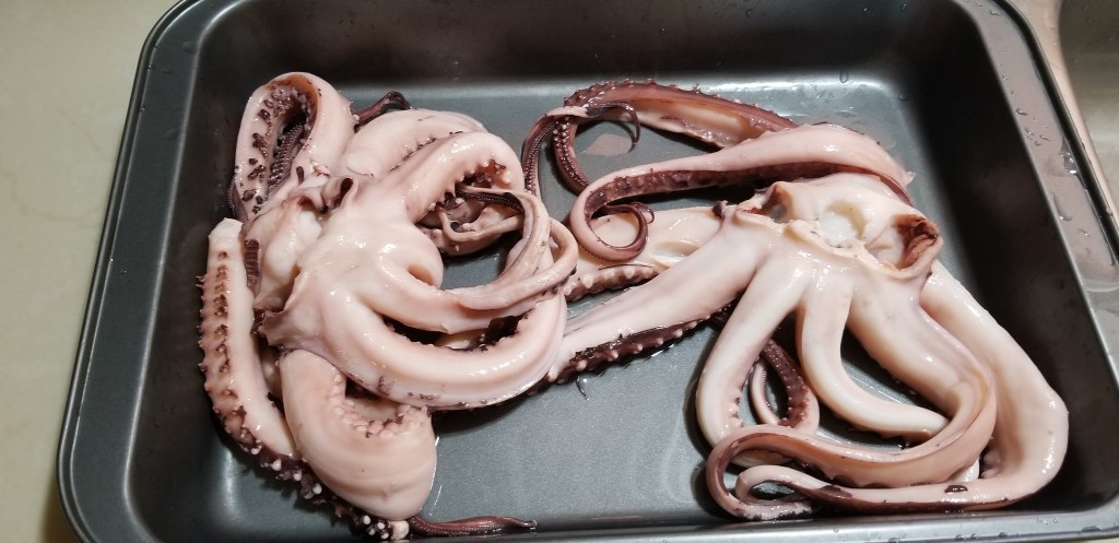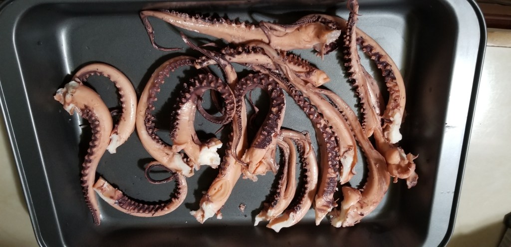 They were now ready to eat or to use in a recipe. We cut the octopus into tentacles because it seemed to be the most common thing to do. Although it didn’t look as pretty as when whole.