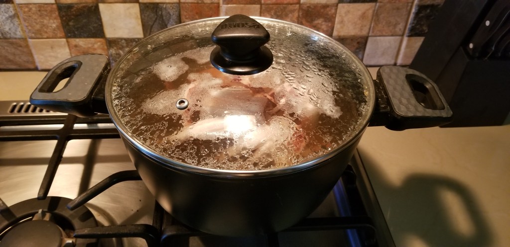 After dunking the skins came off much easier and the tips were nicely curled. Then back into the pot of water the octopus went to simmer for another hour and a bit. The information said to simmer until a fork inserted into the thicker part went in easily. I had no difficulty sticking a fork into the flesh at any time so we weren’t sure just how long it would take. We also could not get the gas low enough to keep the water from furiously boiling, so it was a constant “turn it on, turn it off”.