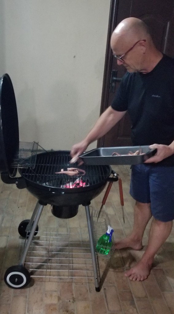 Several website suggested to put the octopus on the BBQ to char. We tried that, but no charring happened, only drying out. This BBQ was blazing hot and Daryl used his bare hands and not the tongs, so the smaller pieces would not go through the grill!!