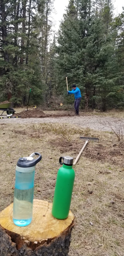 Take the pick axe and break the rocky soil enough to shovel it out…..over and over.