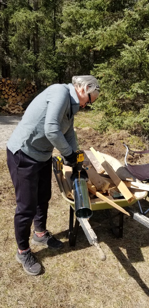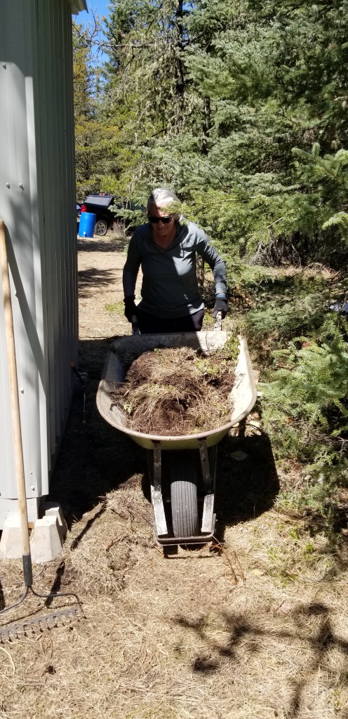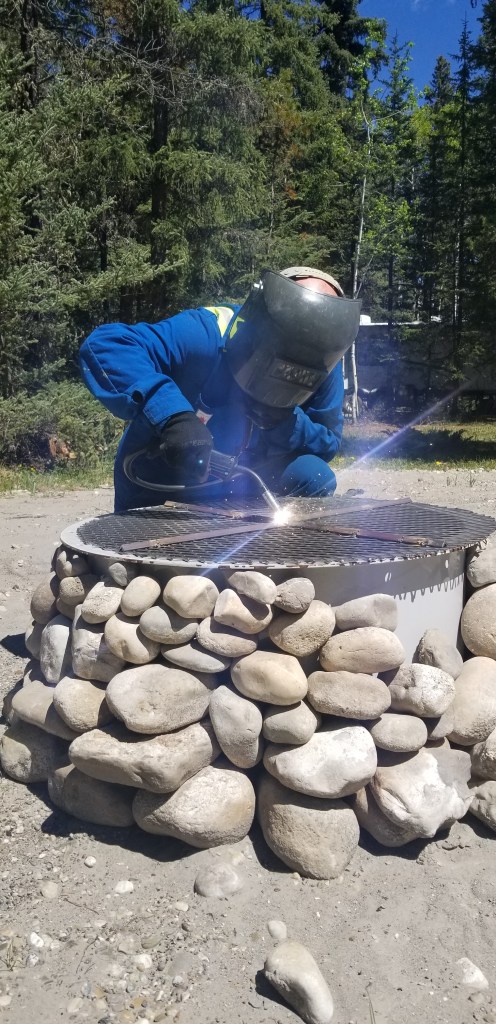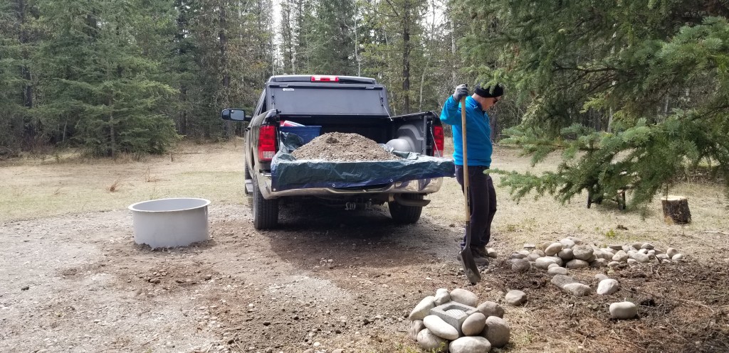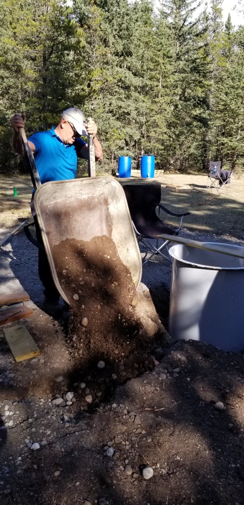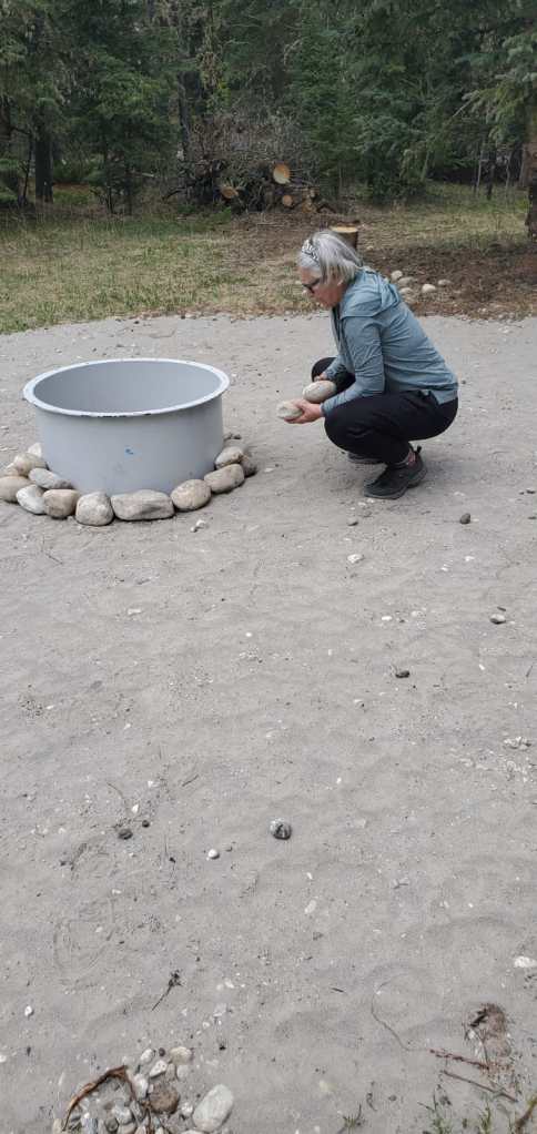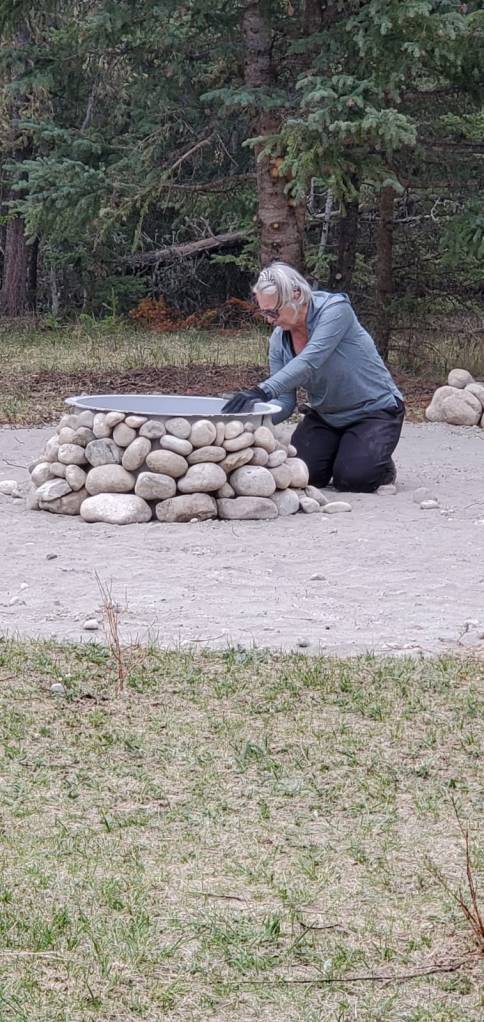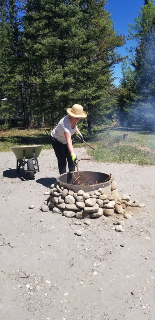 Daryl had this lovely idea that putting rocks around the pit would look good. As soon as the paint started burning off, the charred pit would not look very pretty. I agreed and went to work gathering rocks. While Daryl went off to get a load of gravel, I took the wheelbarrow and went to the road looking for the perfect size rocks. And then it hit me….I am here by myself in bear country. Every rock was slammed as hard as possible into the metal wheelbarrow. My hope was if I made enough noise no bear would come by!