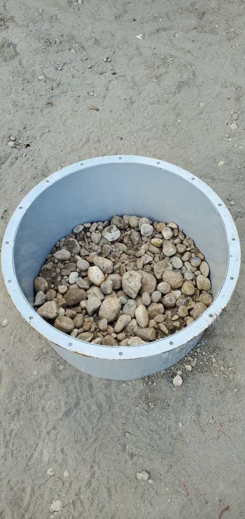 We put rocks in the bottom of the pit. This was to try and keep the ash out of the air vent. We use the ash mixed with peat moss in the outhouse (thank you Teresa) and found getting it out from around the rocks is a real pain. Next year we will do something different, probably try piling the rocks around the air vent. Hopefully that will make ash collection easier.