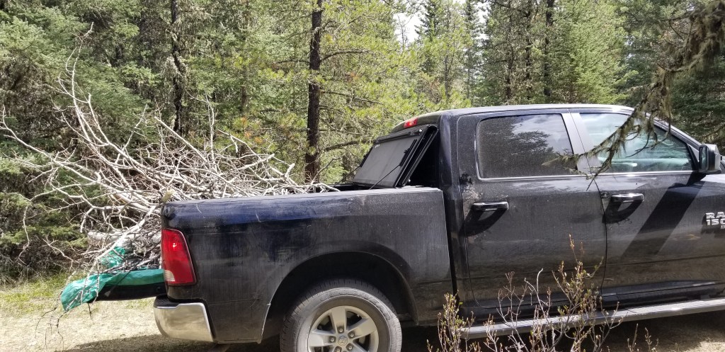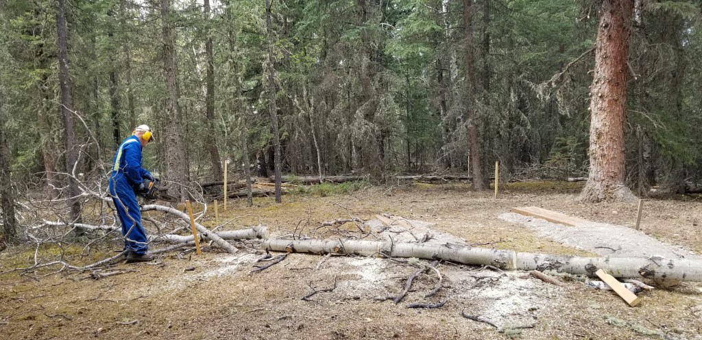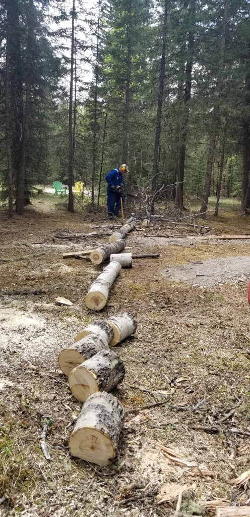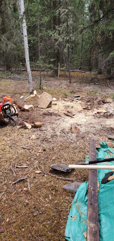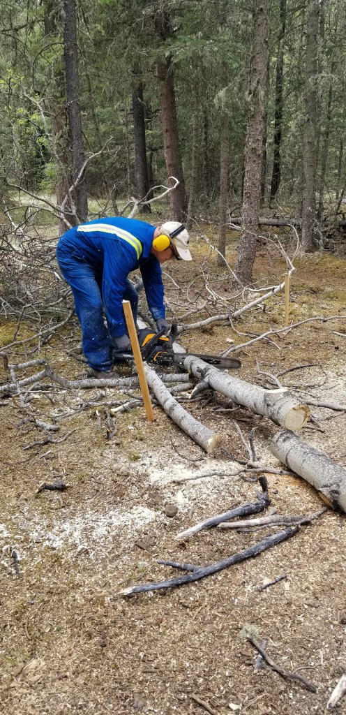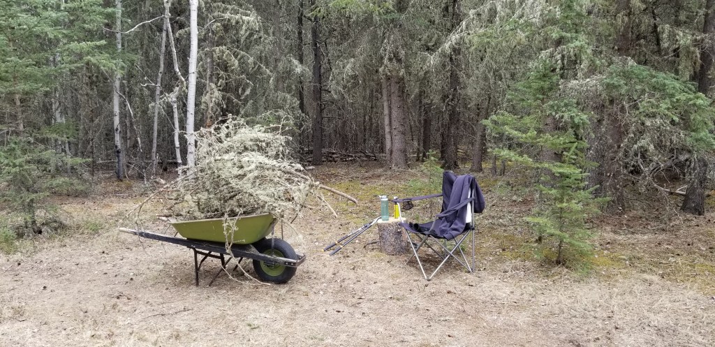 Daryl went to work cutting trees and brush. Some of it would be good for firewood, although we prefer spruce over aspen for burning, lots less ‘flankers’.