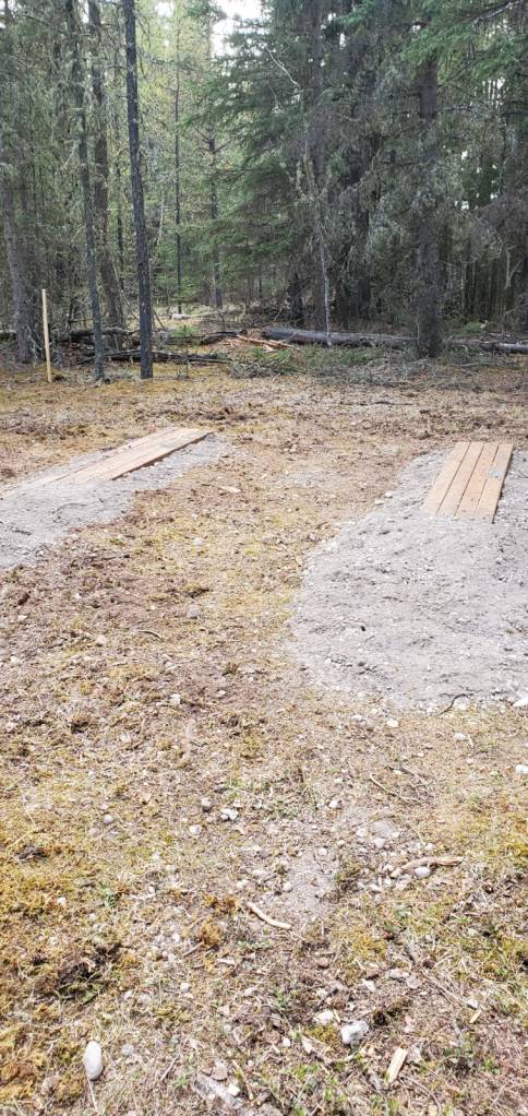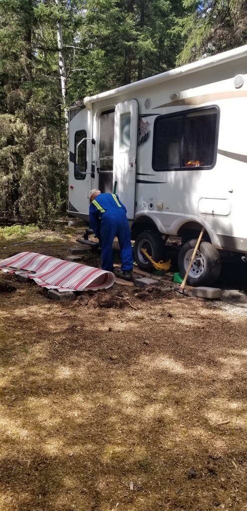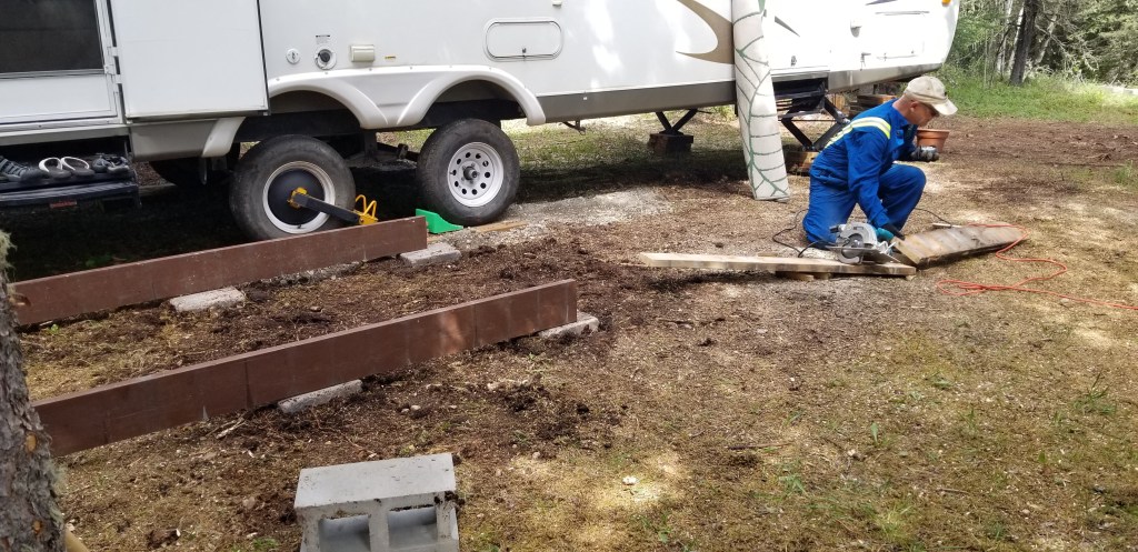 Getting the tree stumps out of the ground was a real challenge without a ‘stump remover’. Daryl said it took hours. After building a sturdy base, it was time to bring the trailer up and park it. Then we could stay overnight.