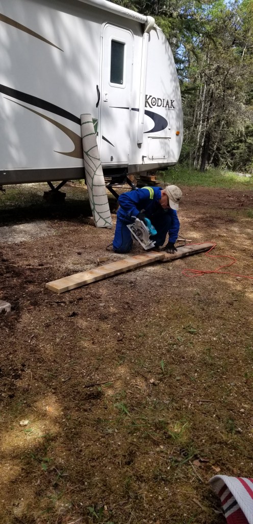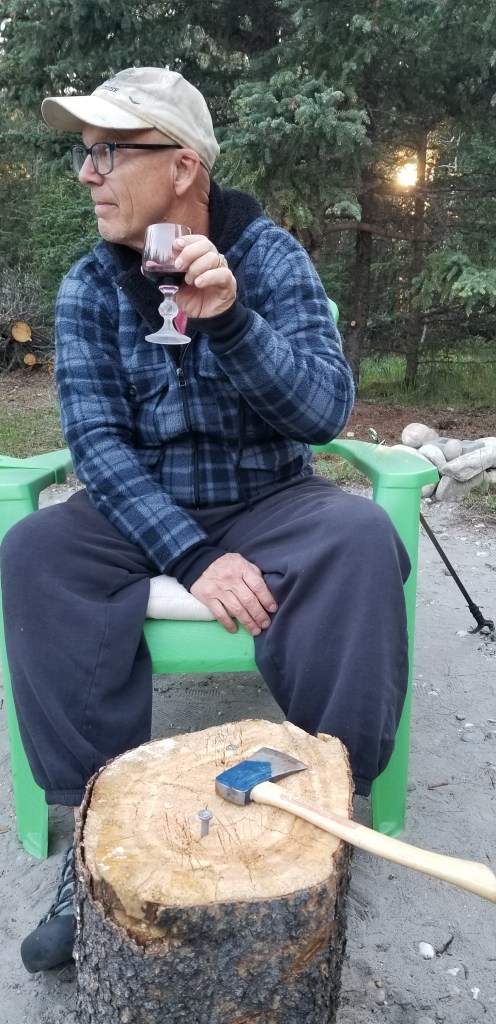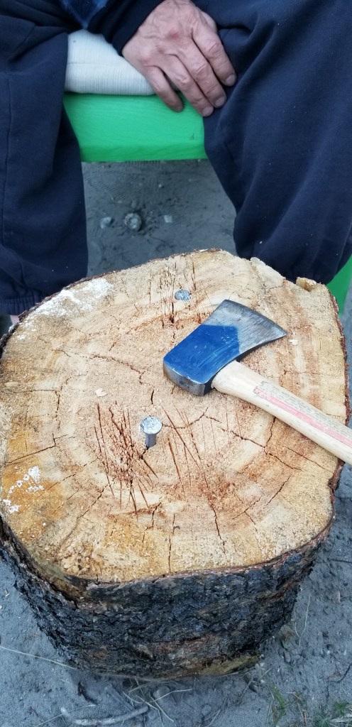 When we were in the Okanaghan earlier, our friends had shown us a camp game. Sounds crazy but it is fun….and competitive. You take the sharp edge of a hatchet (use an old one), a good size stump and a 4 inch nail. Then take turns getting one smack at the nail, no mulligans. Sadly, Daryl was the winner this game π