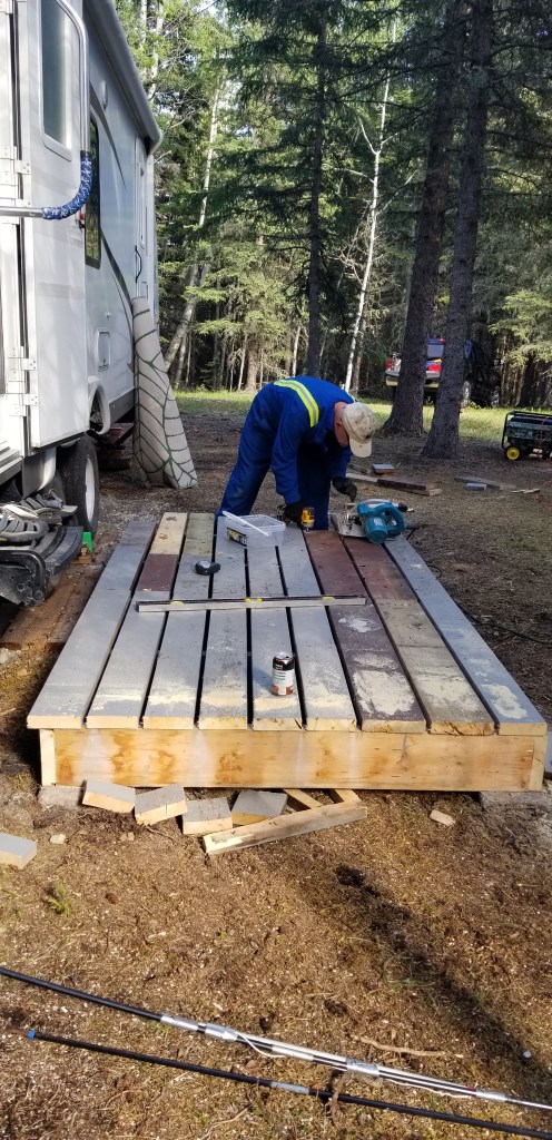 Another rule is no permanent structures….except the storage shed, outhouse, wood shed and waterhouse….. which meant no deck. So we built a very large ‘step’.