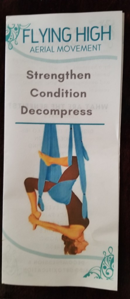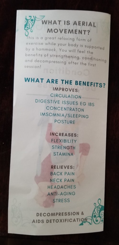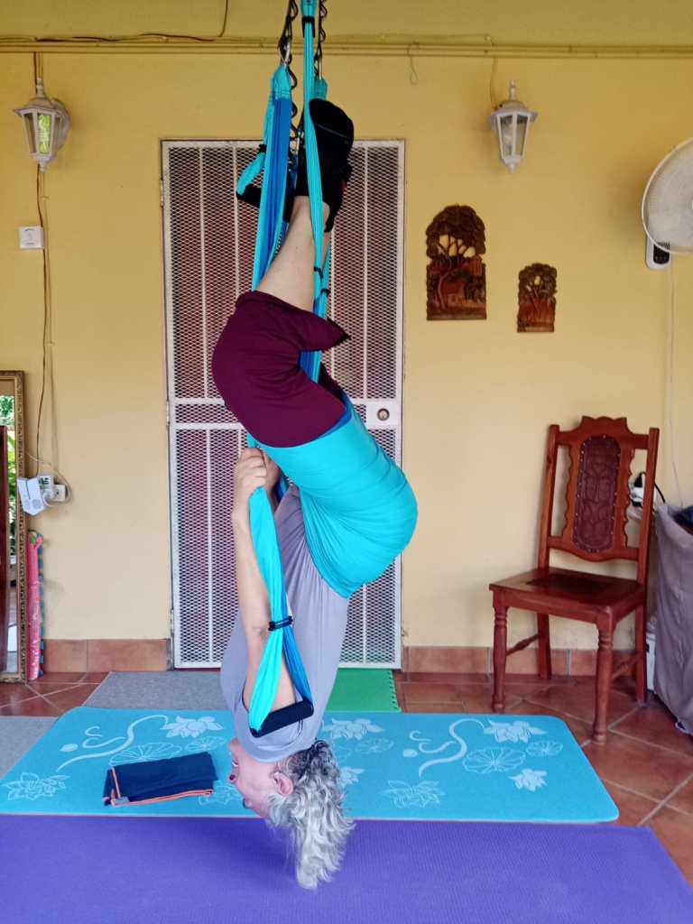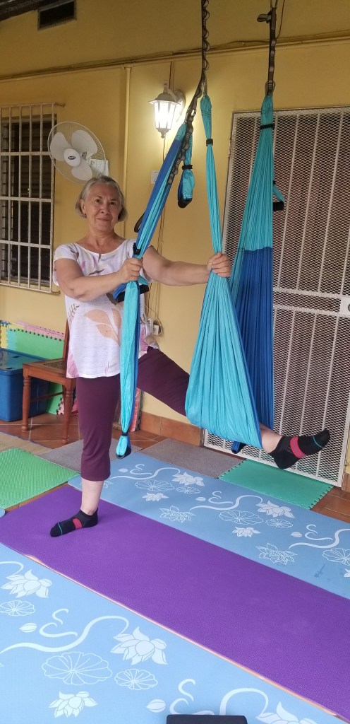 So far I have been to three classes, all private. The first was 90 minutes showing how to use the hammock while incorporating ‘normal’ yoga poses. The other two were an hour each. I don’t know the proper names of the different poses but the basics is pretty well the same as I have done previously. Being able to hold onto the hammock or a strap sure helps with balance! You are also supposed to get a deep tissue massage from the pressure of the hammock.
