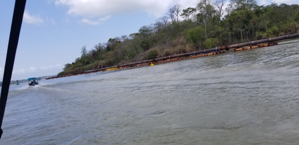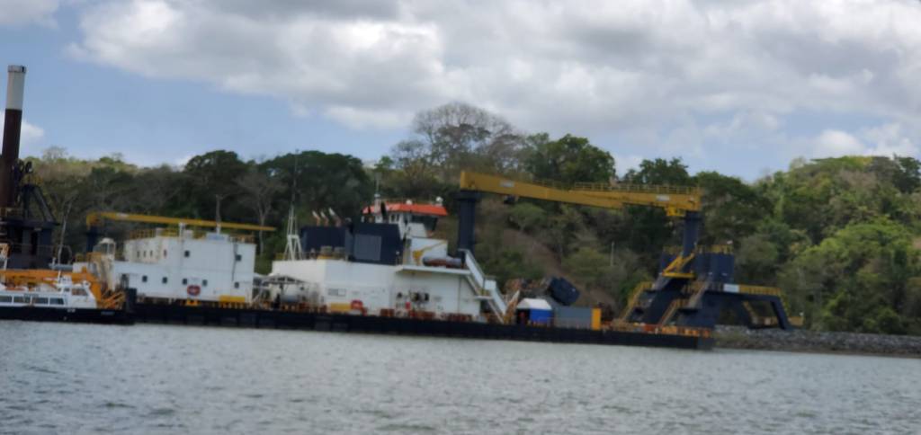 The canal is maintained at a depth of 17 meters, and is constantly being dredged. The material that is collected flows through the pipes below and is used to make new islands, or anywhere else silt is needed.