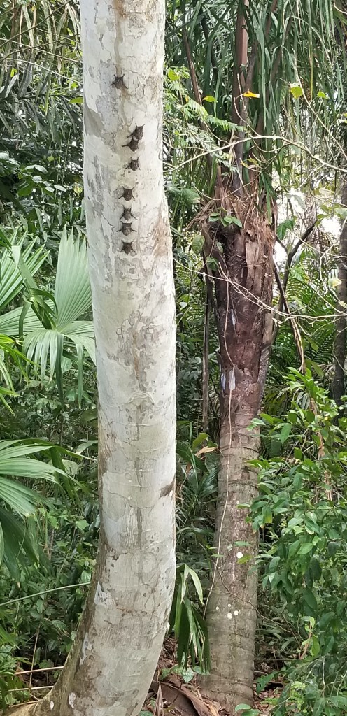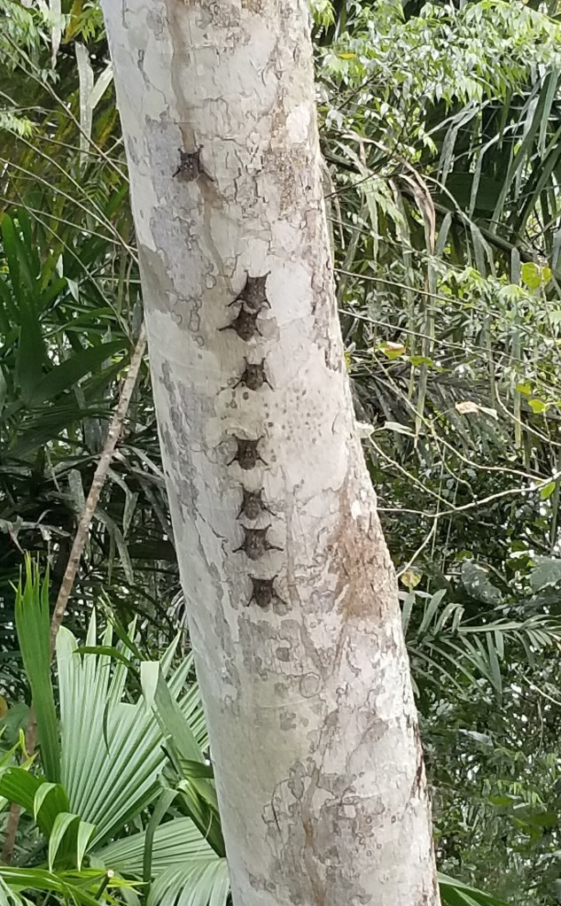 Those little critters are some kind of bat, they are all lined up having a nap to get ready for evening hunting. Apparently they go back to the same tree every morning.