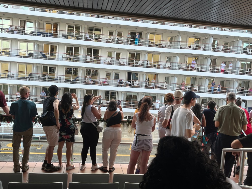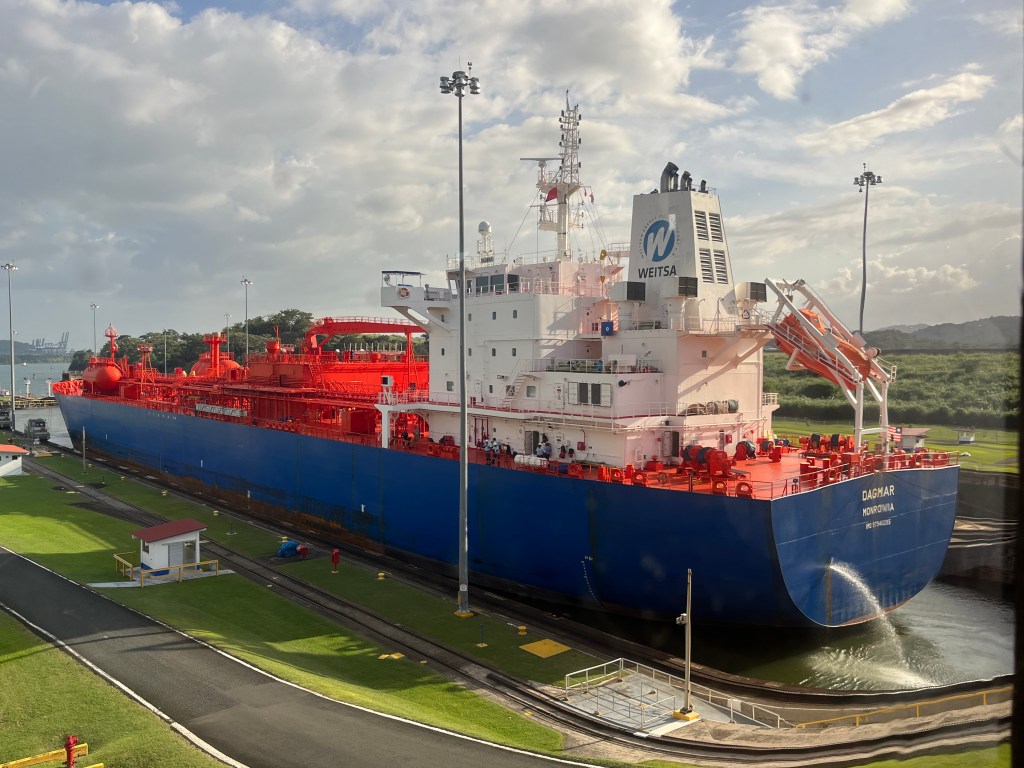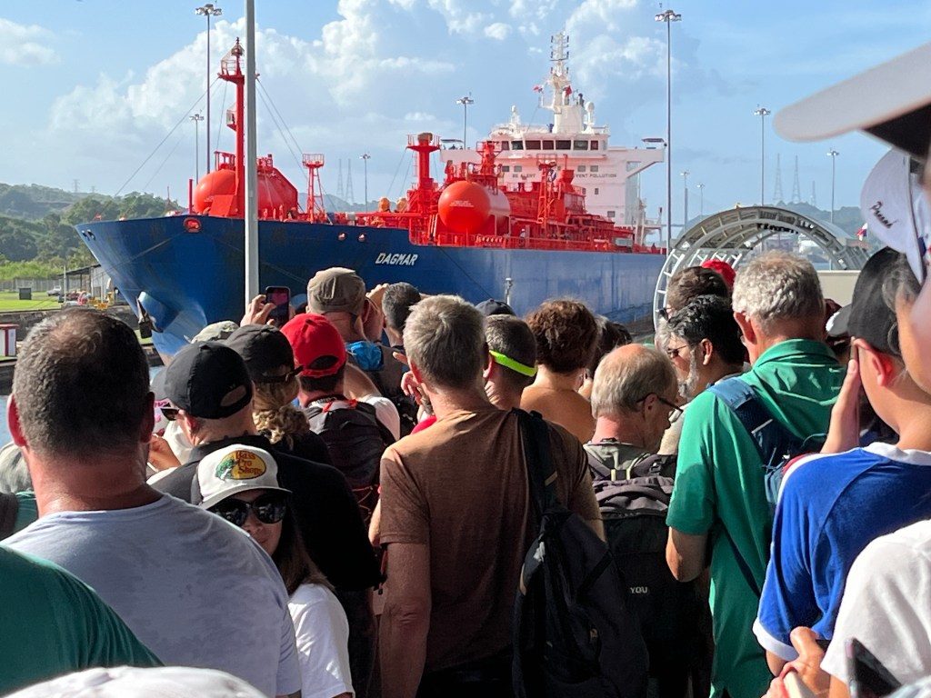 The locks run 24 hours a day, going half a day in each direction. When we arrived the change over was happening. We had time to go to the Imax theatre before seeing our first ship. Morgan Freeman narrated a 3D movie about the Panama Canal history and operations. It was well worth seeing.