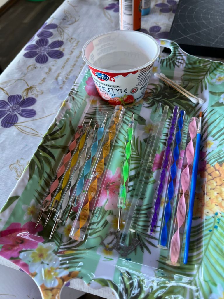 Start with a centre dot and work out. You need to follow the pattern pretty closely. However if you make a mistake, you can erase it if you are quick enough before it dried. A bit of water on a little brush and a Q-tip should get rid of the mistake.  Then a dab of black paint and good as new.