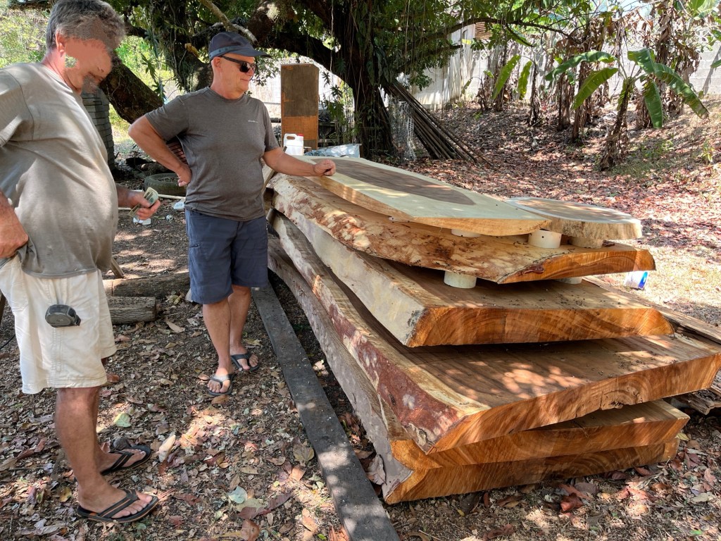 The wood got a chemical treatment to keep termites and other creatures from eating it. Now it has to sit for a year or so to dry out. Then the real work starts. I am good with doing the table top, Daryl will make the legs.