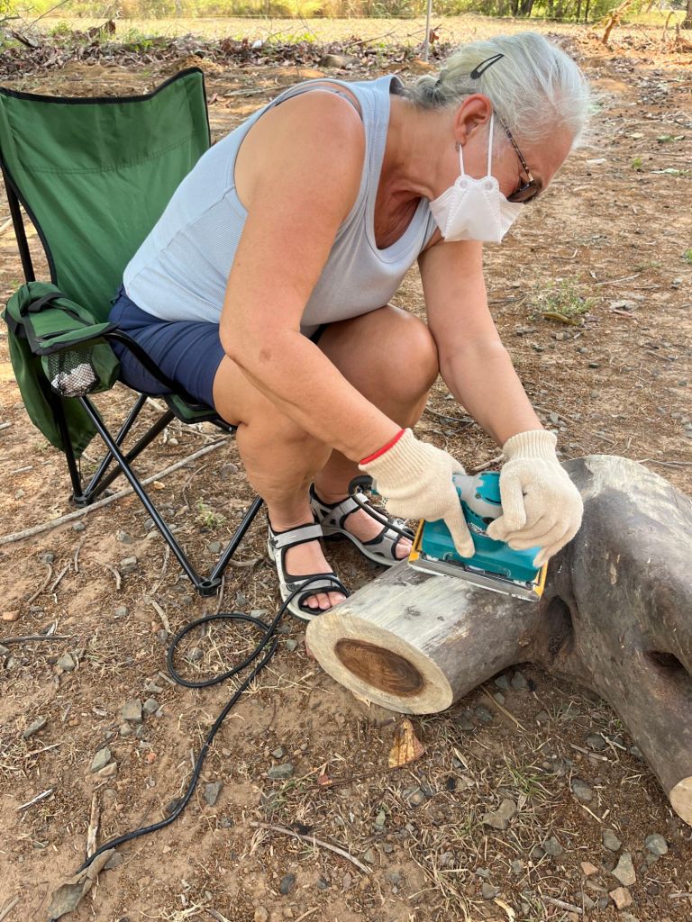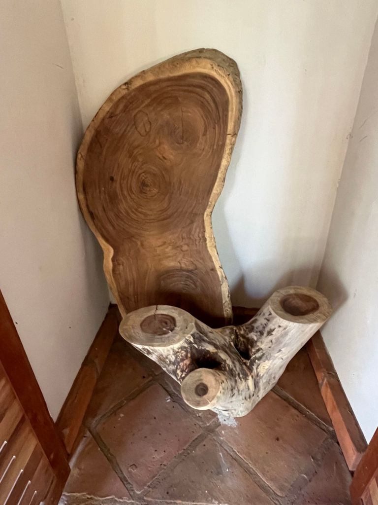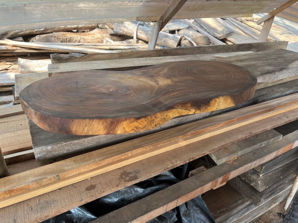 Ours is somewhere in the middle of this pile. We will probably need a forklift to move it. It has a beautiful dark centre with light colour around the edges. There is also enough wood in the slab to make the legs.