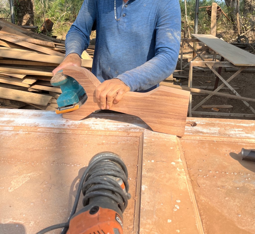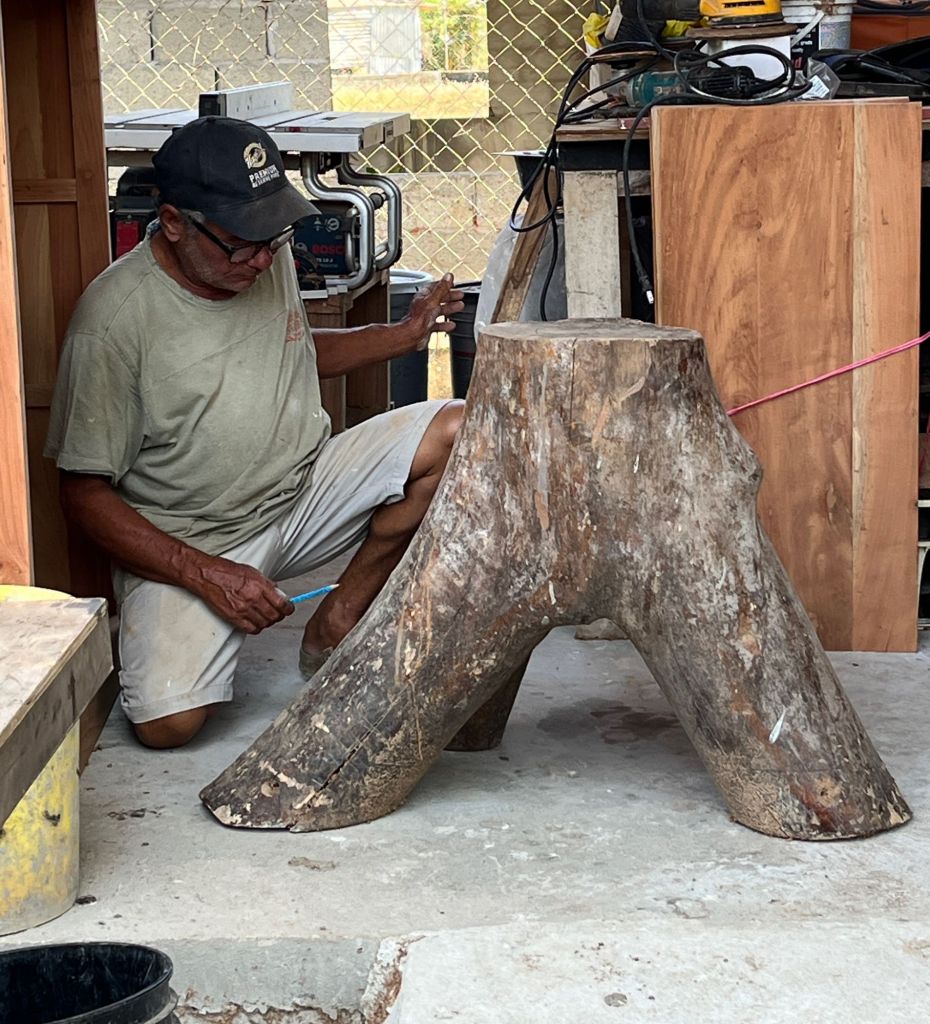 It would not have been my choice for table legs, however this man is an artist at work. This table only needs the legs stained and a clear sealer. The beautiful tabletop is all natural.