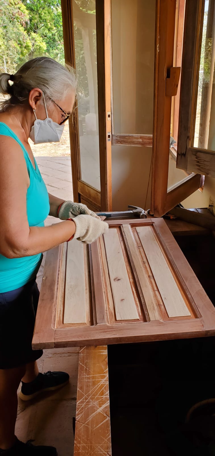 All the woodwork including counters, windows and doors needed to be sanded and stained. That we have been able to do. Apparently if one does enough hard physical labour, one doesn’t need to go to the gym!!