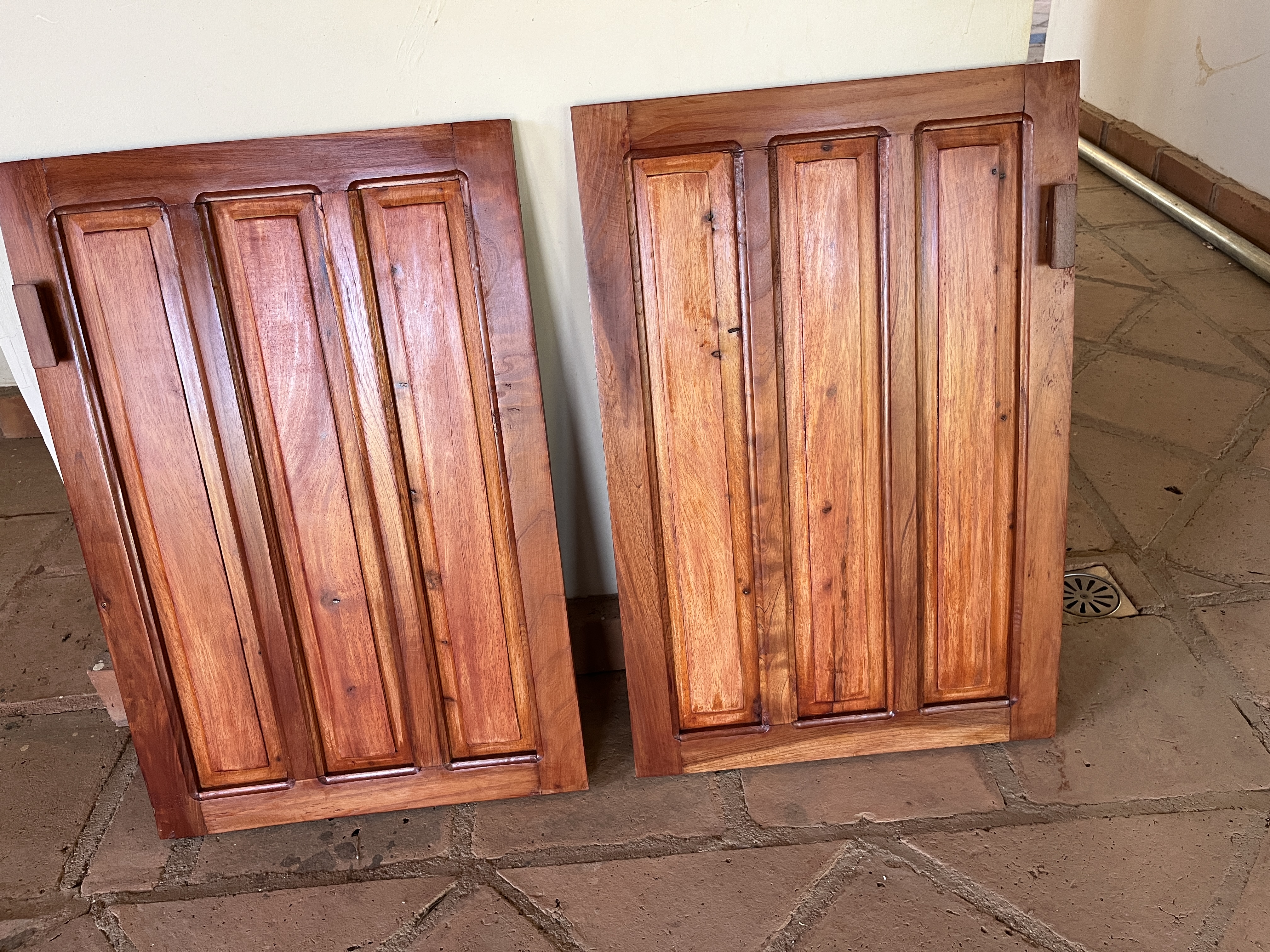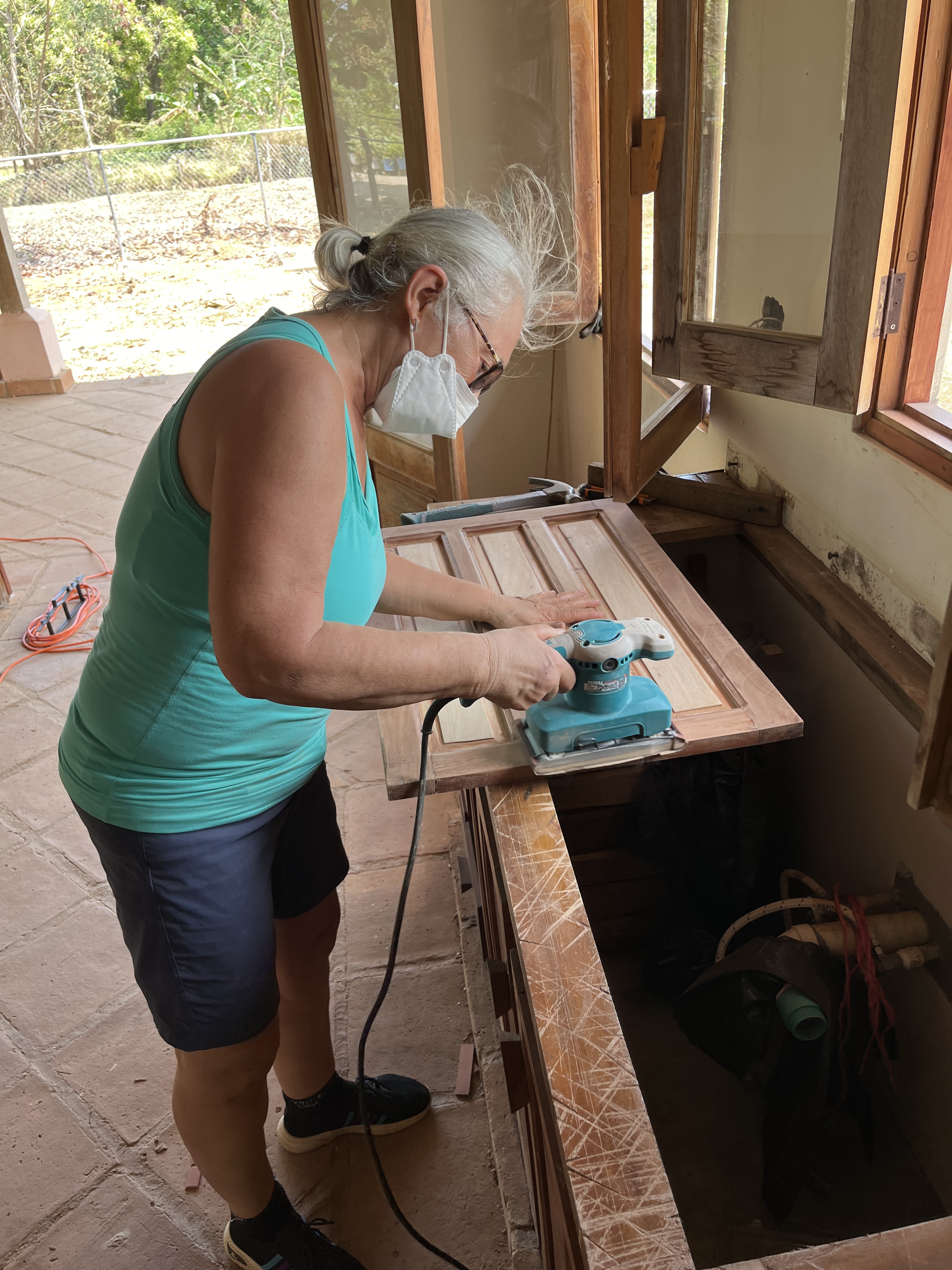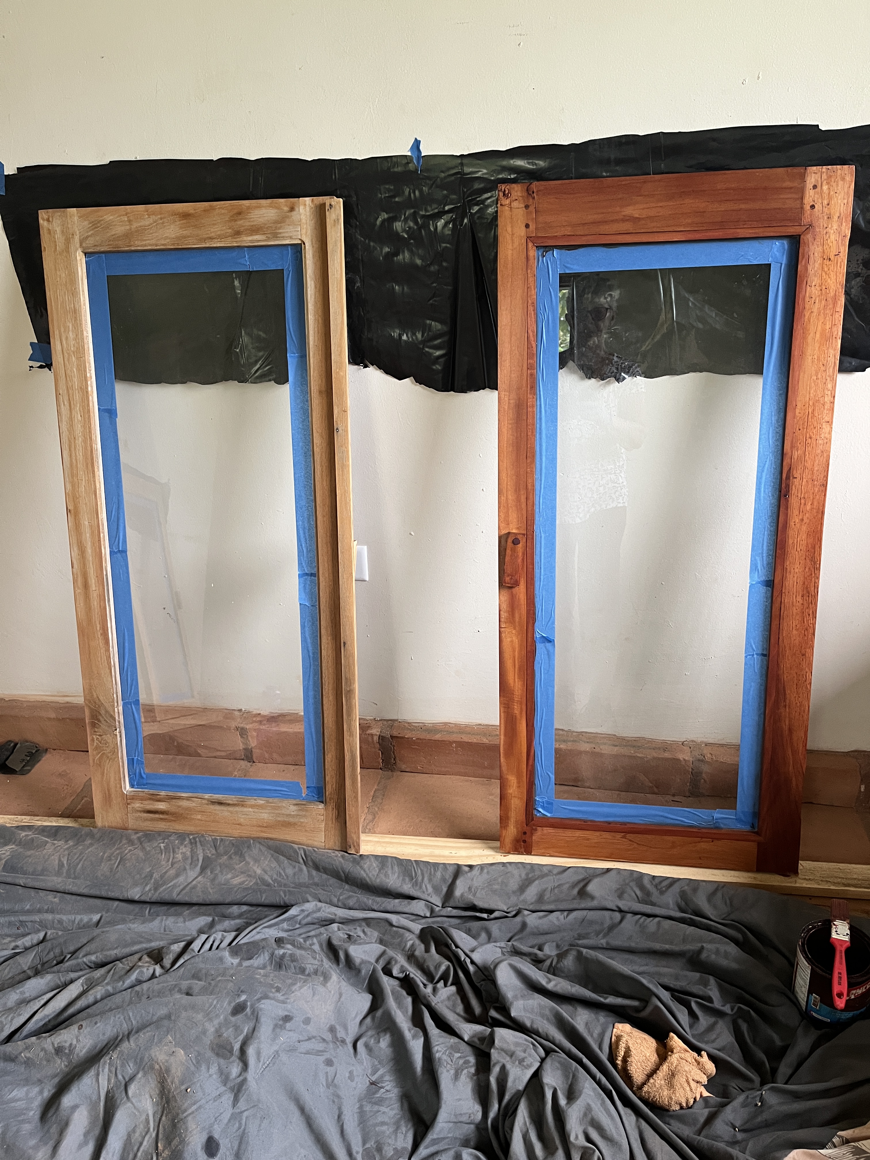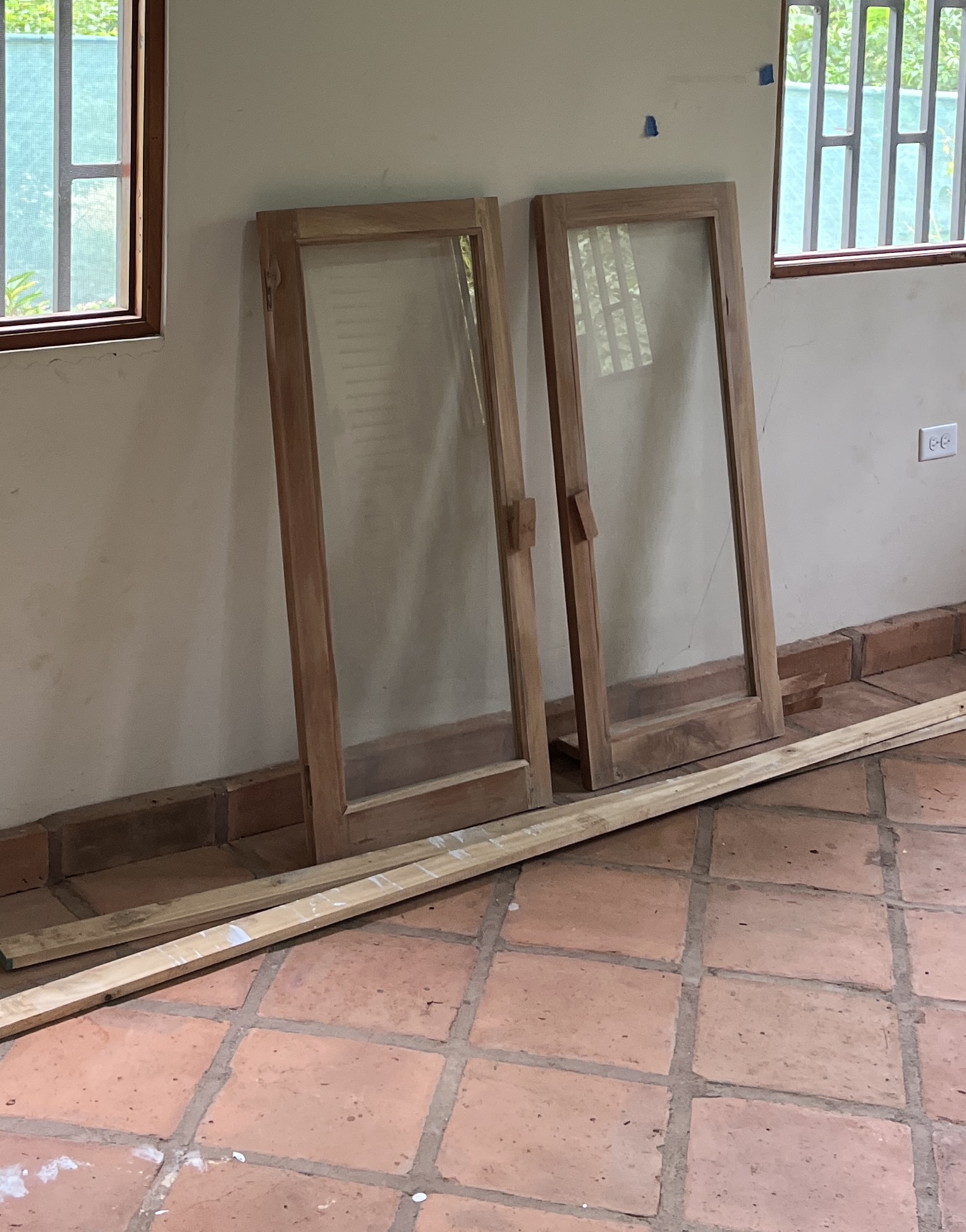 The windows and doors have been sanded and stained. On the outside of all of them, we finished with marine clear coat, to see if that will preserve them just a bit longer, especially during rainy season.