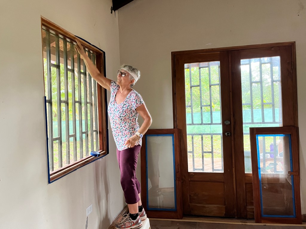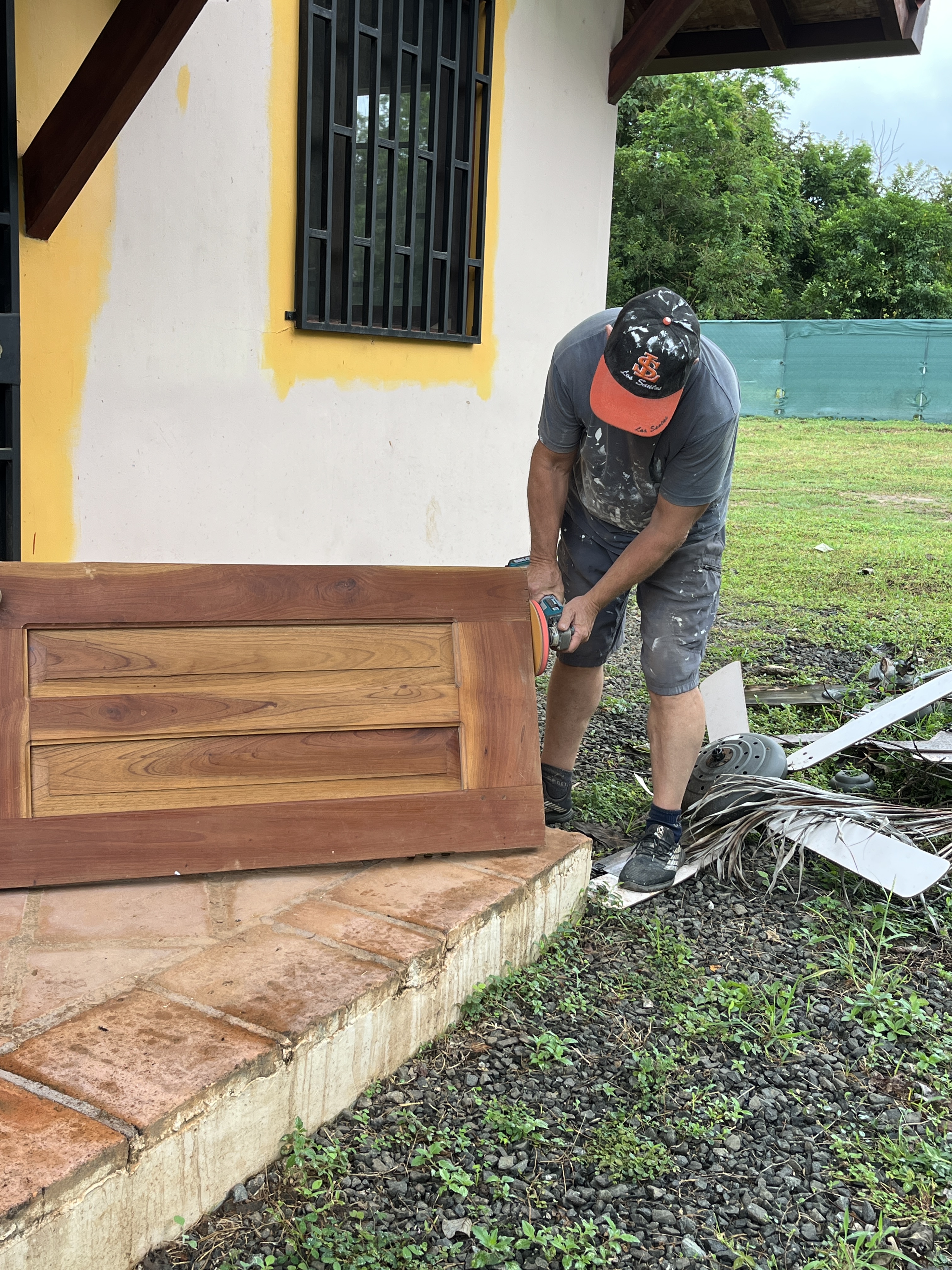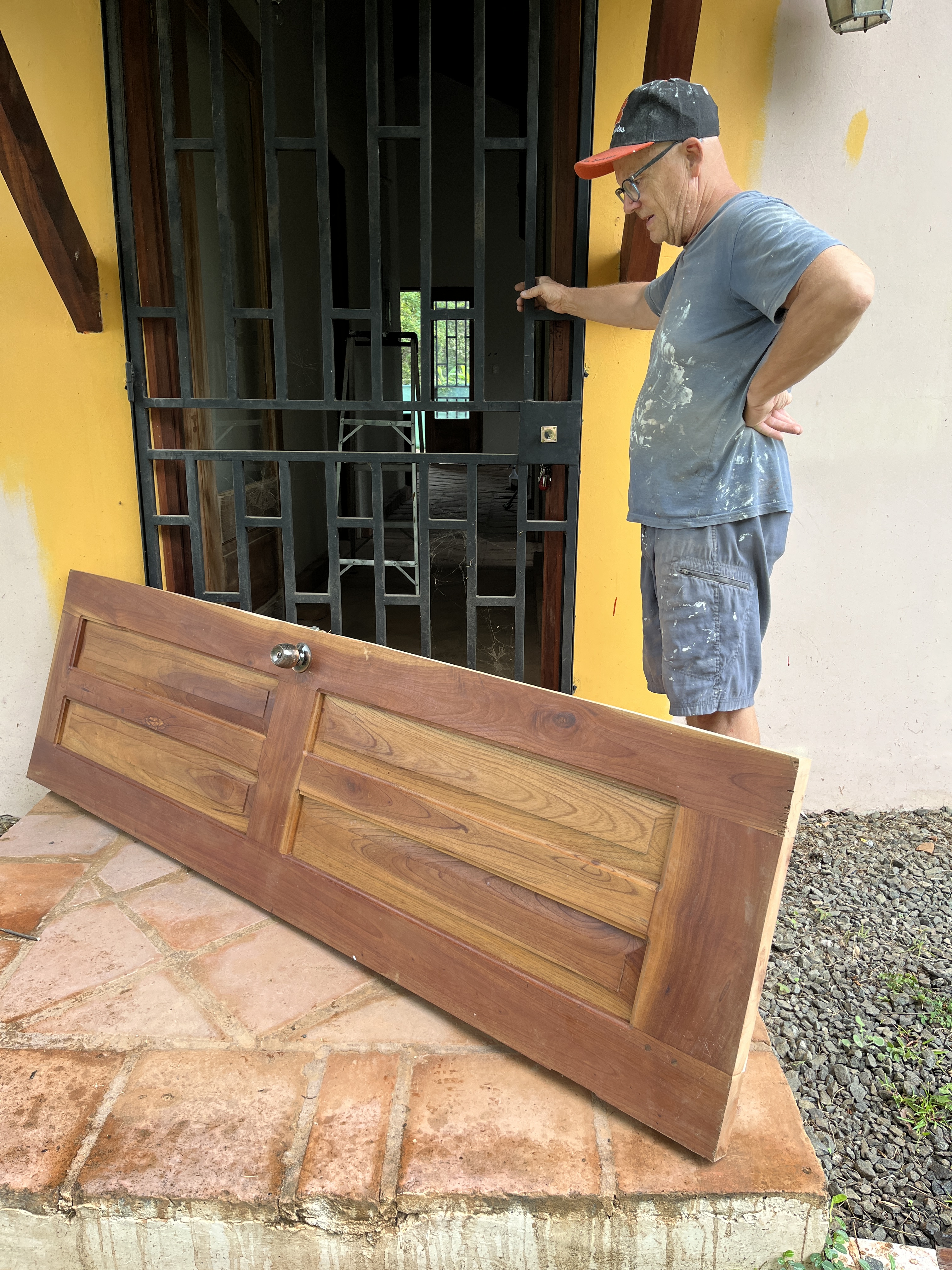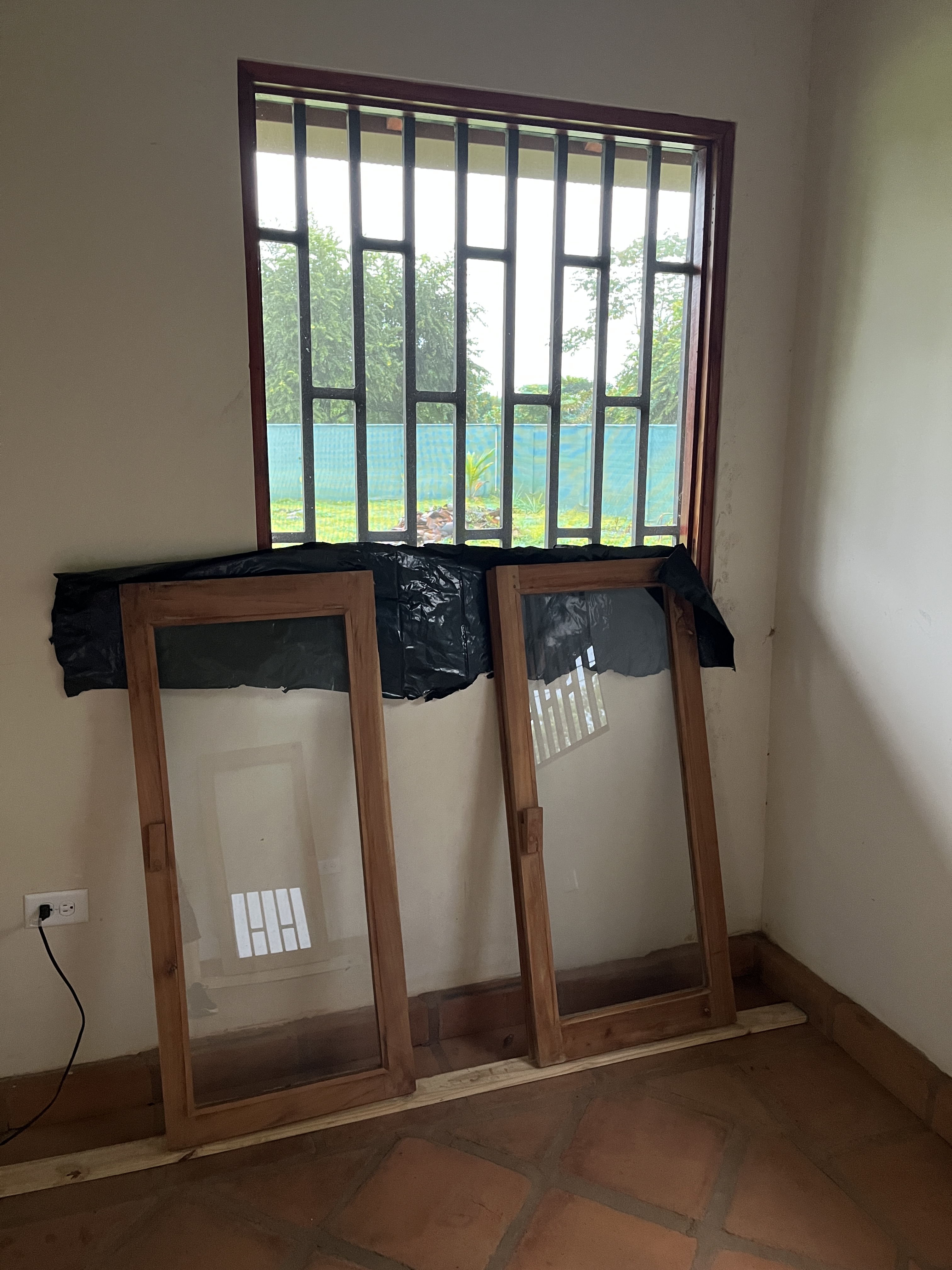 The windows and doors have been sanded and stained. On the outside of all of them, we finished with marine clear coat, to see if that will preserve them just a bit longer, especially during rainy season.