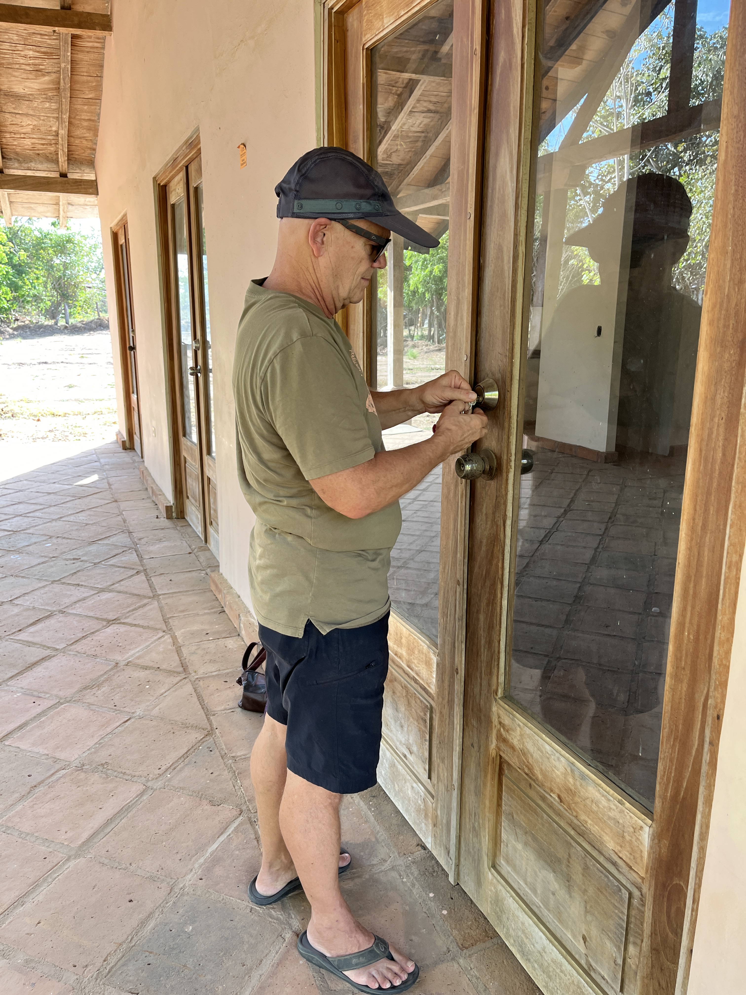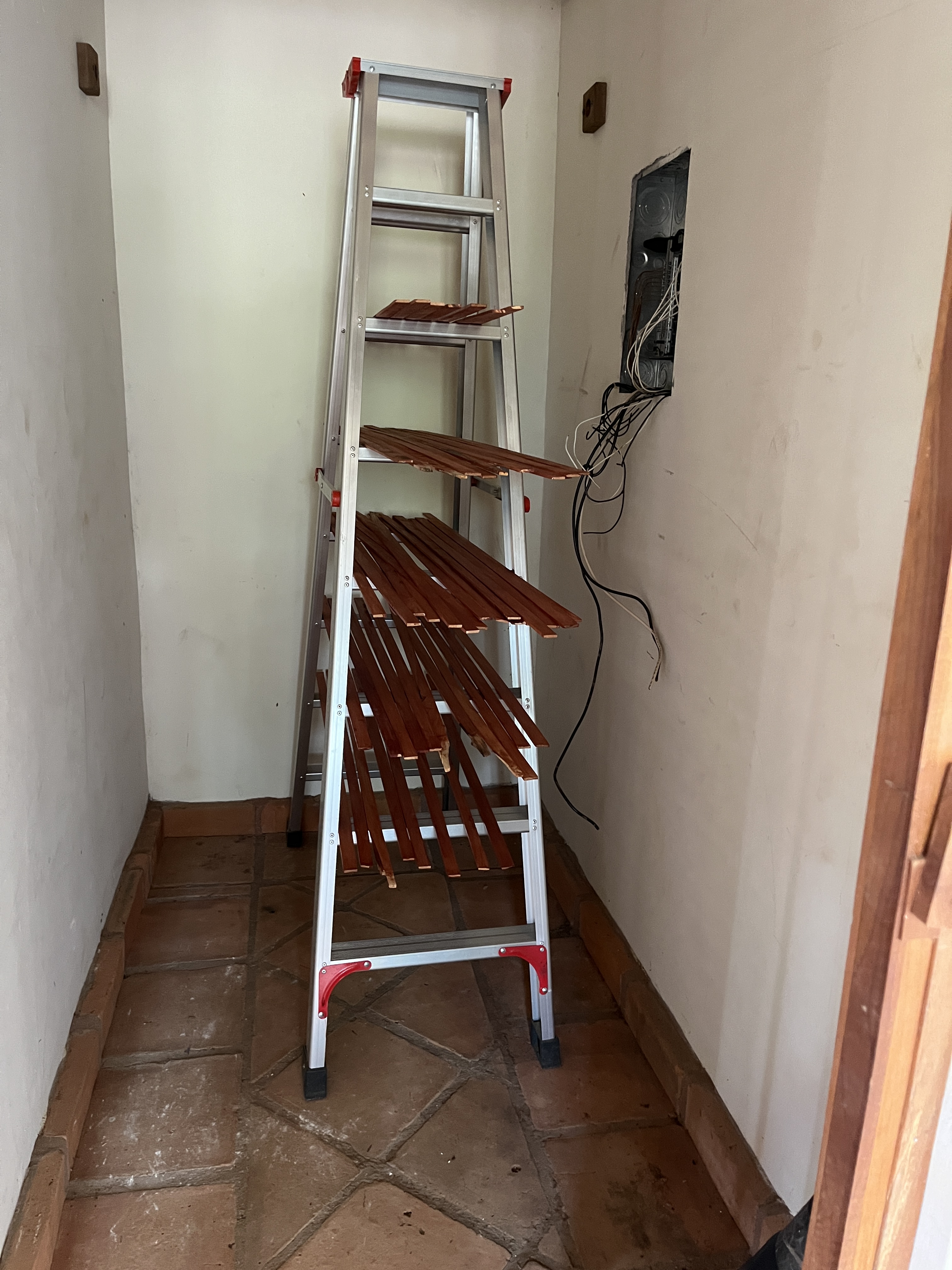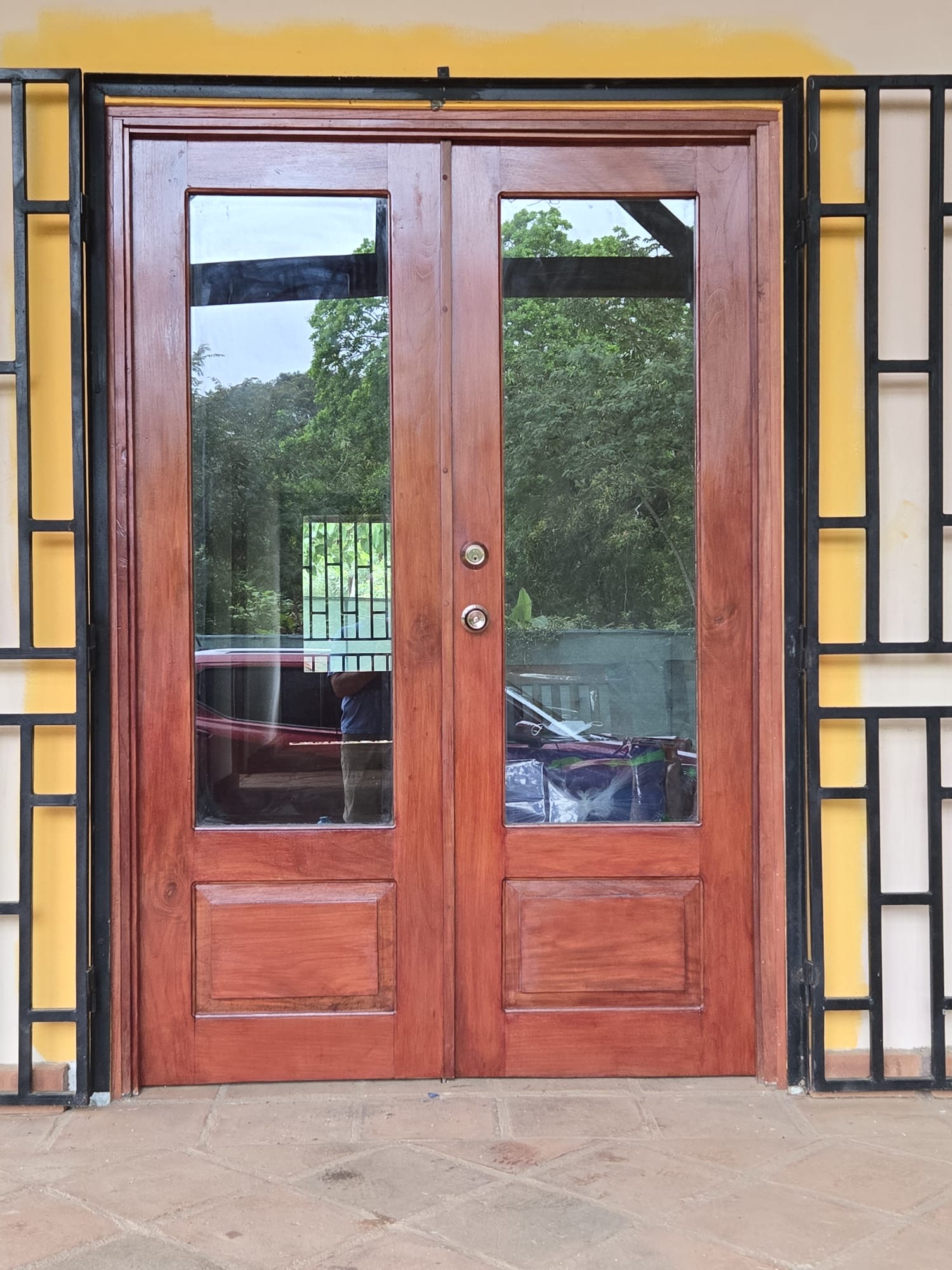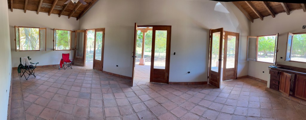 The windows and doors have been sanded and stained. On the outside of all of them, we finished with marine clear coat, to see if that will preserve them just a bit longer, especially during rainy season.