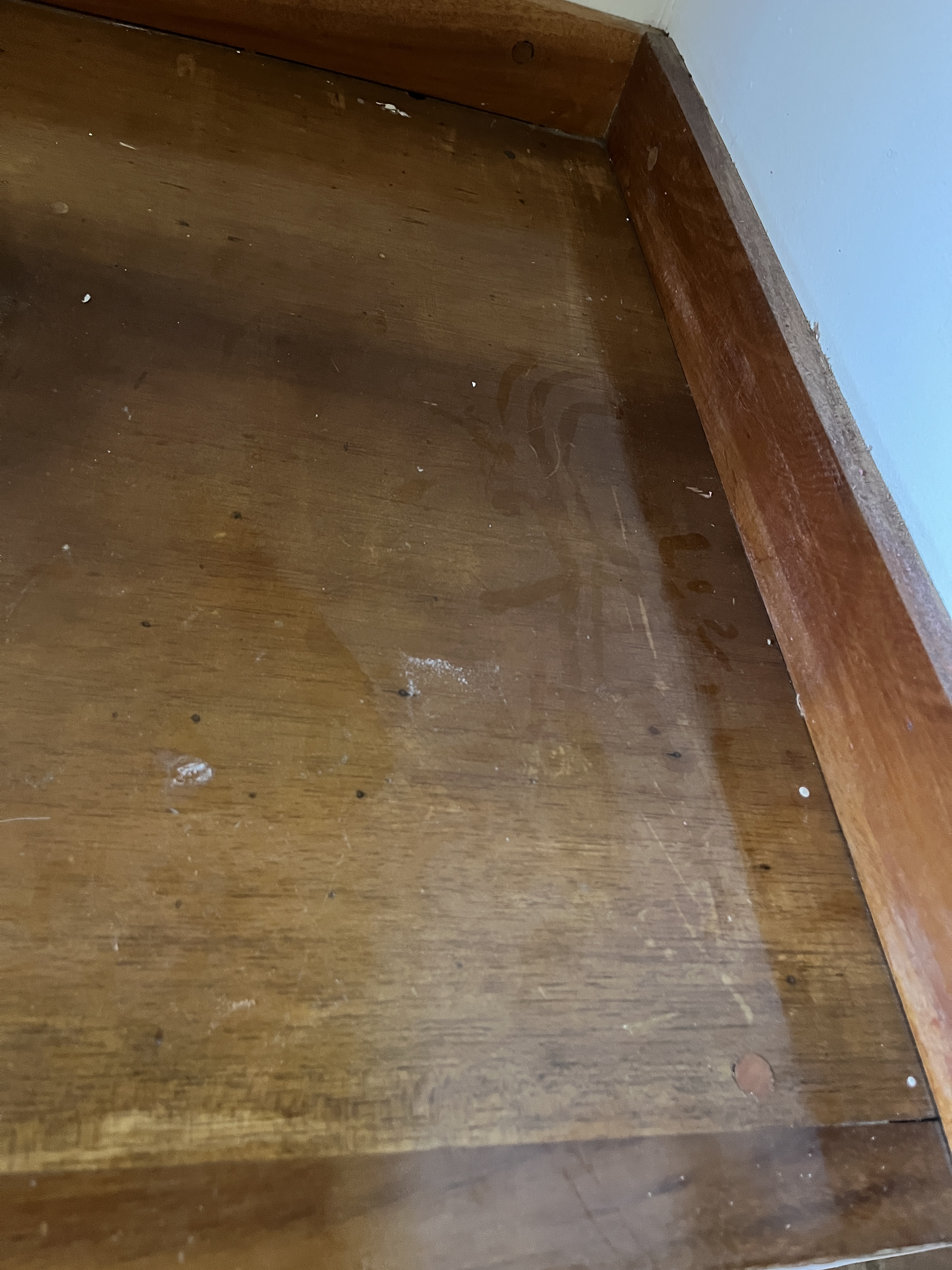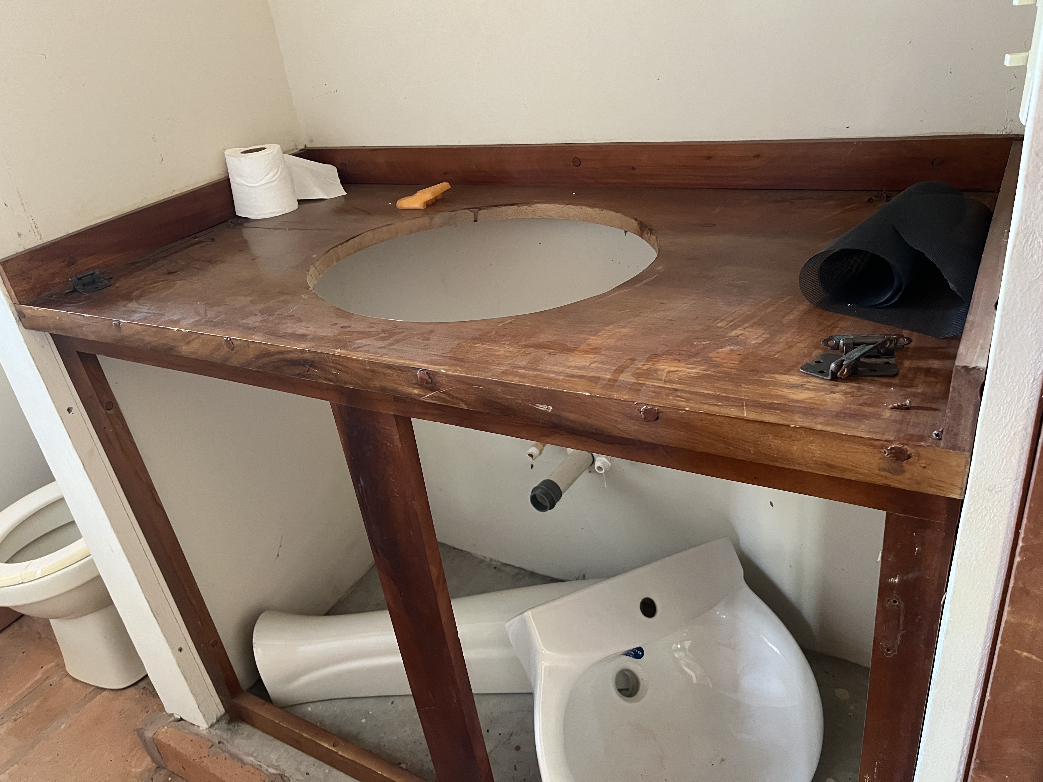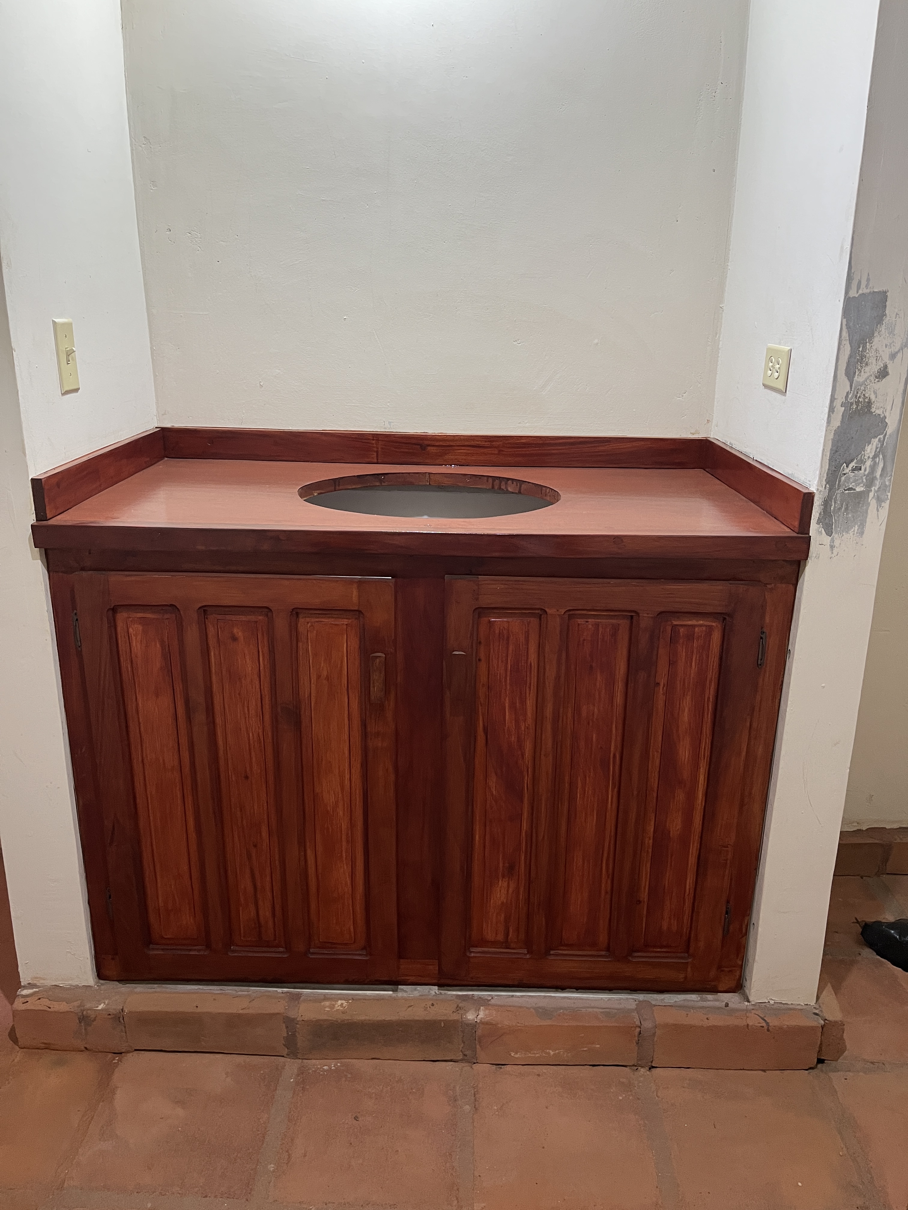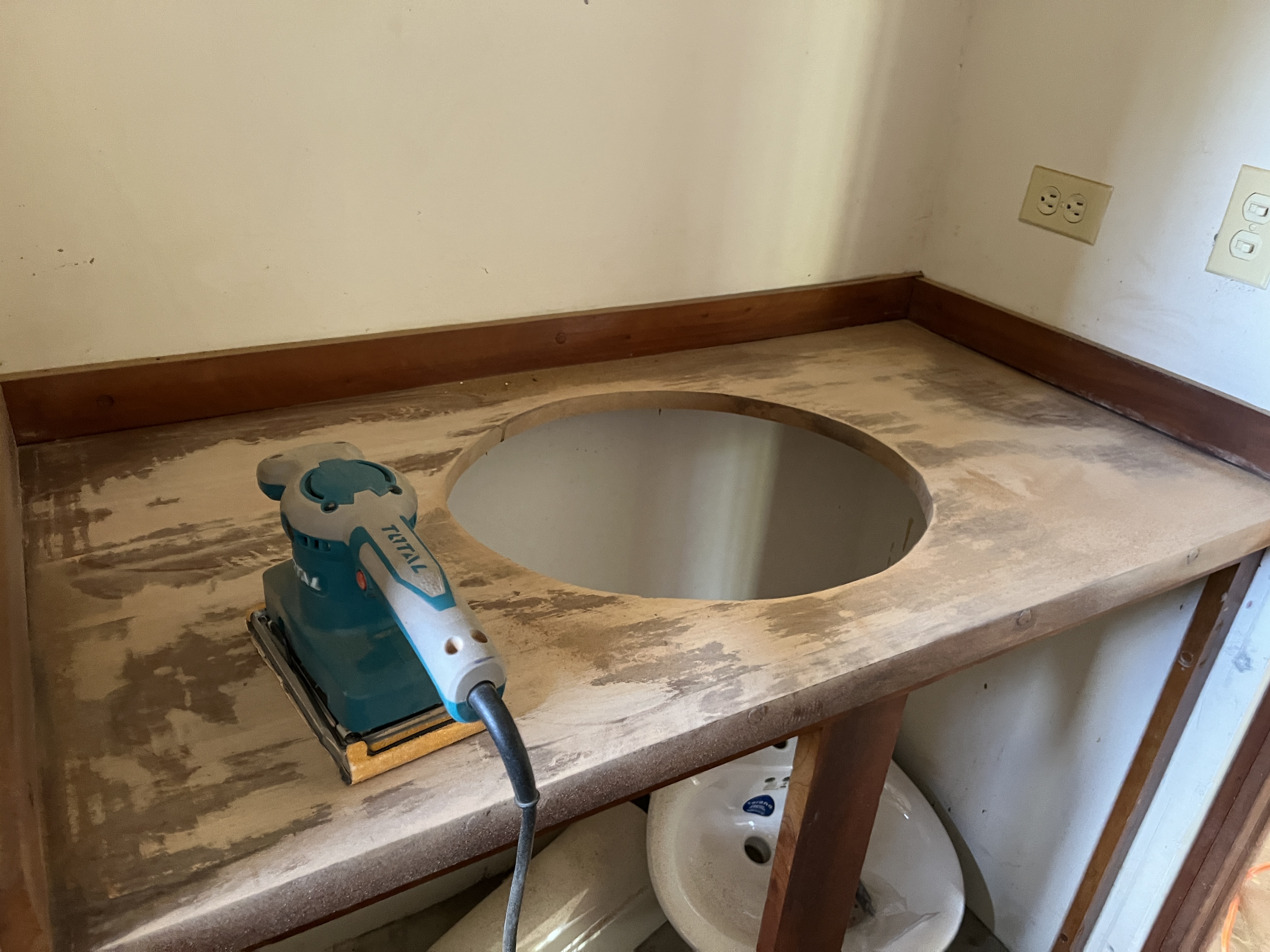 Spring of 2024 we also started cleaning up the bathroom cabinets. It looked in rough shape, but had good bones. Amazing what can be accomplished with sanding and a can of stain.