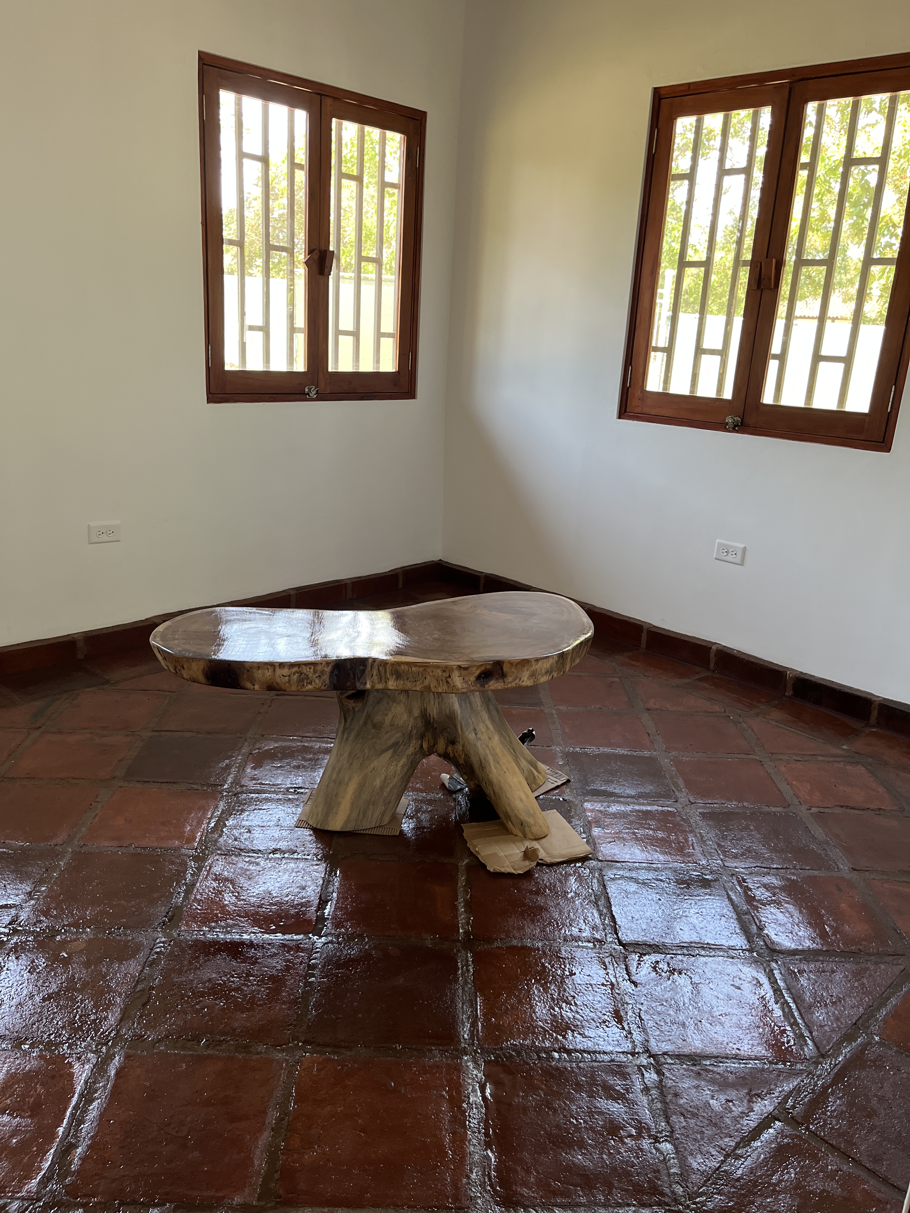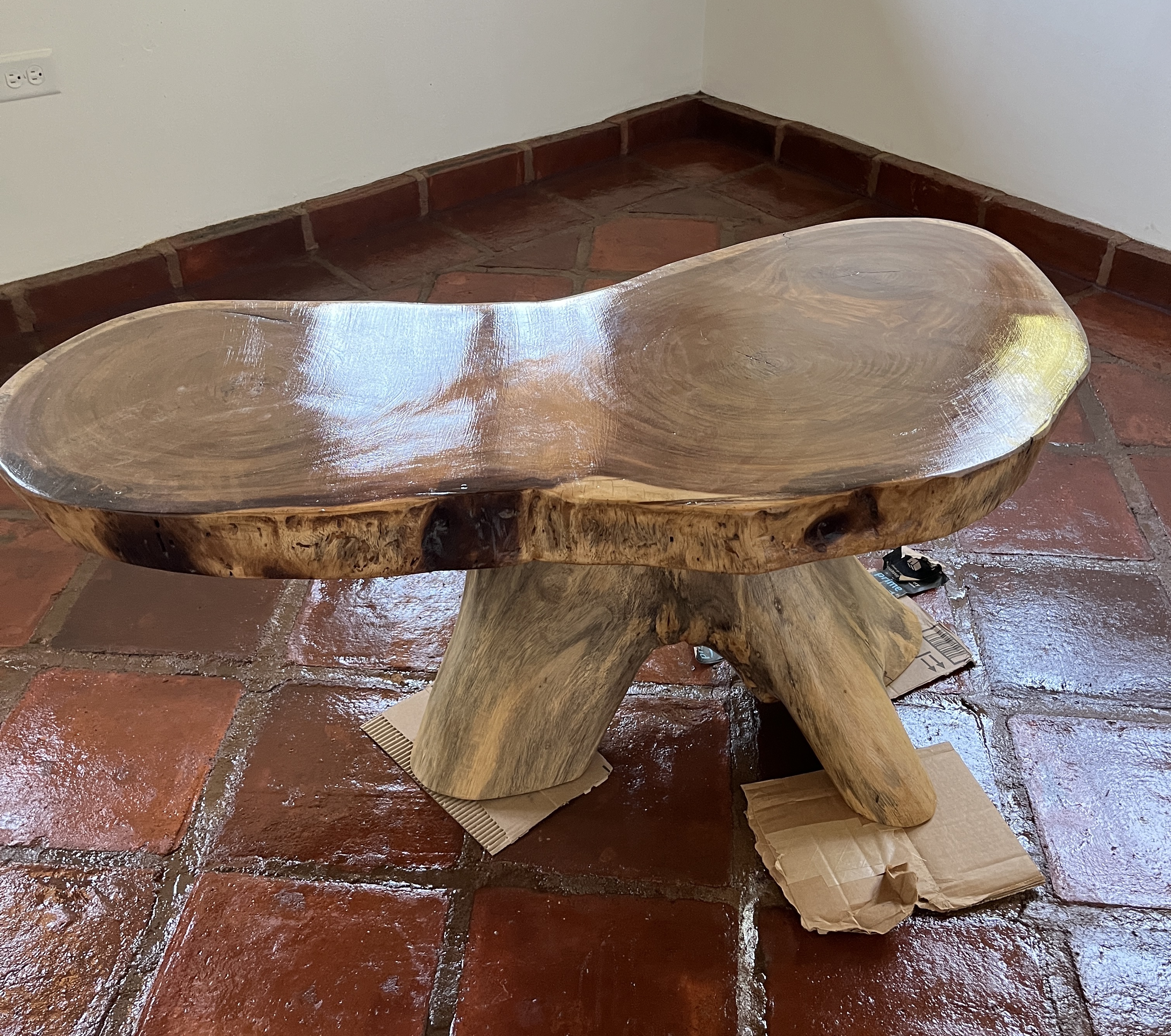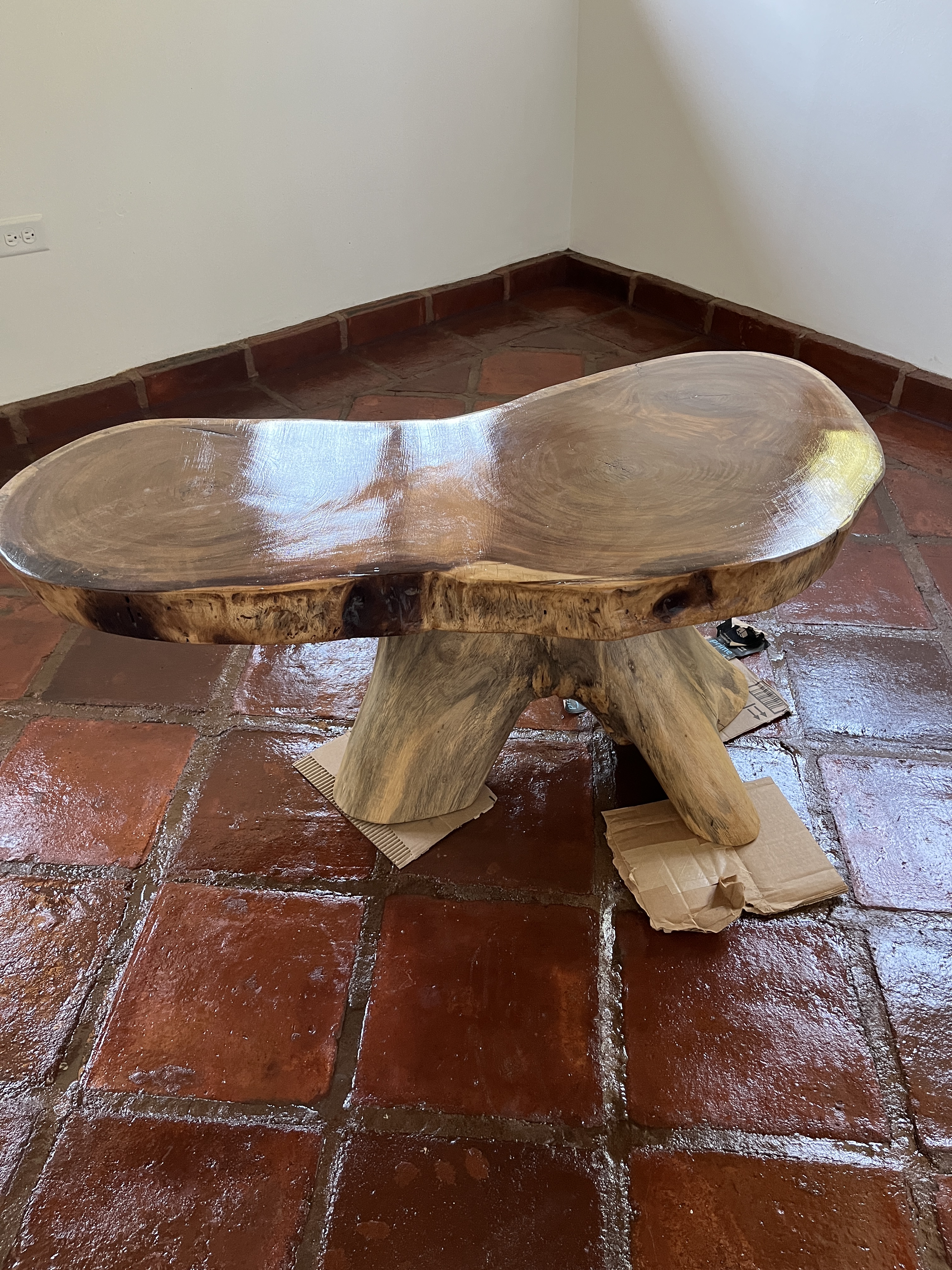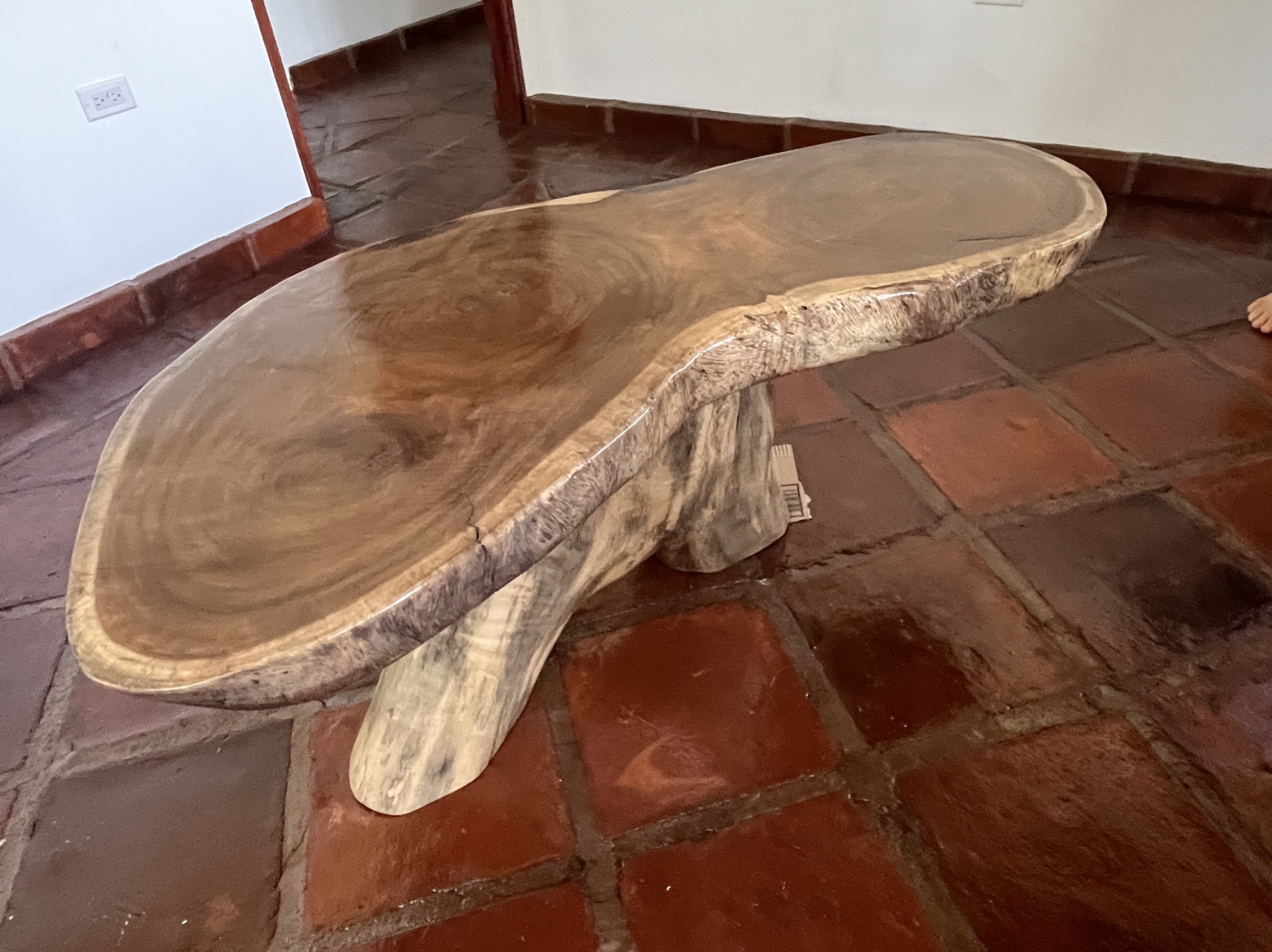 A year ago, March 2024, Daryl and I had the opportunity to purchase an old Corotu wood stump with a slab that could be used as a coffee table. We got the wood cut to height and brought it to our totally unliveable house.