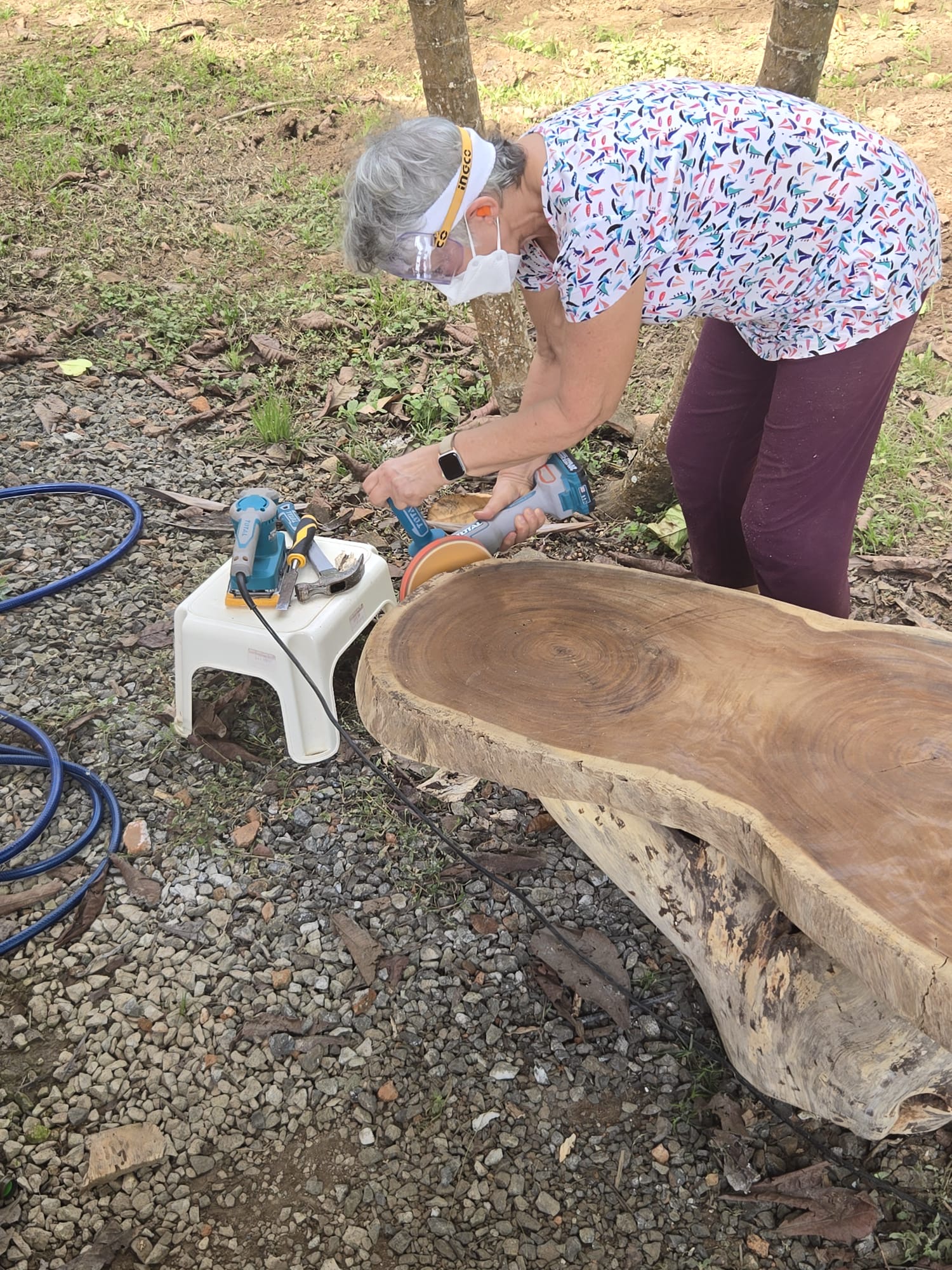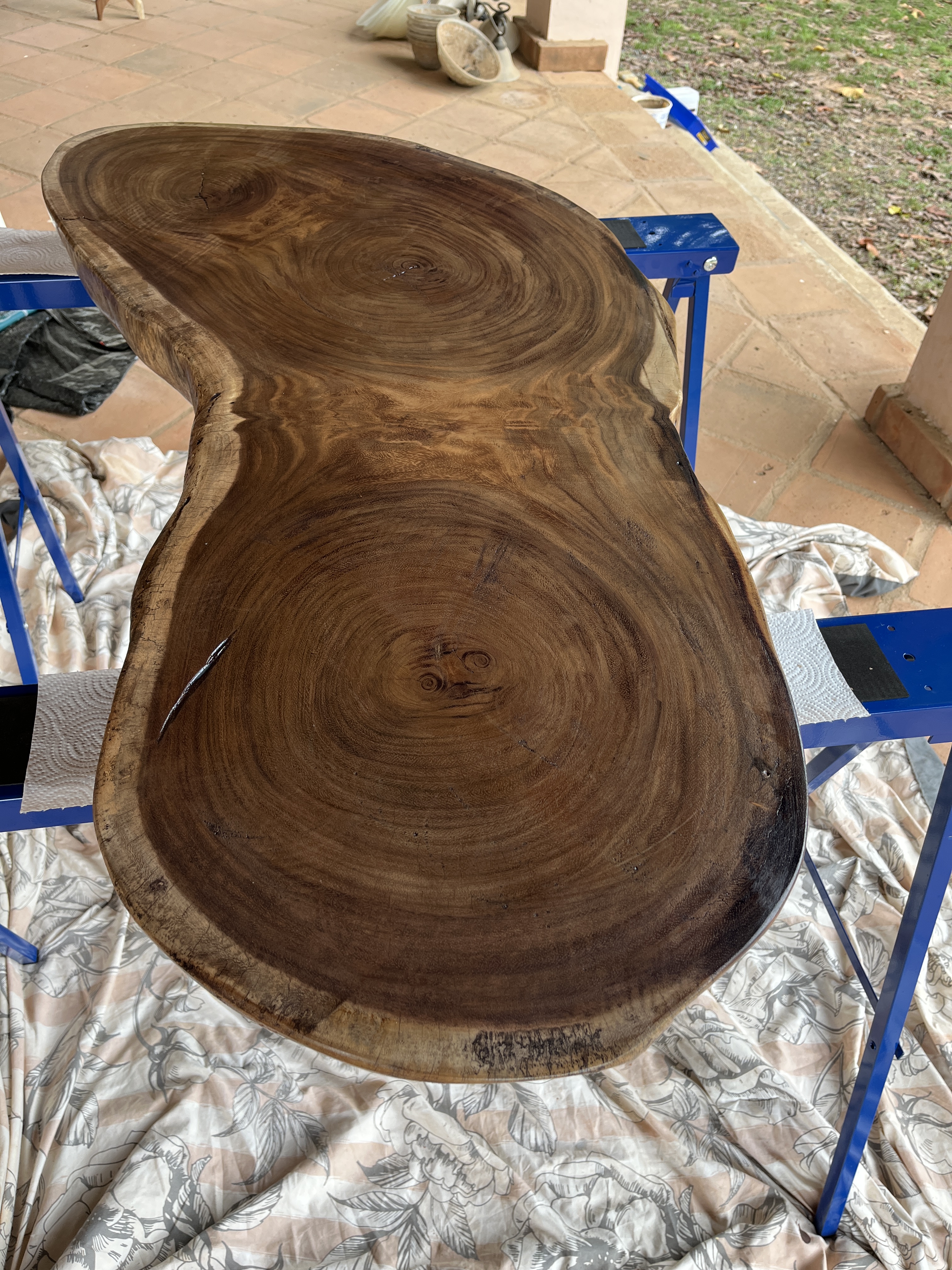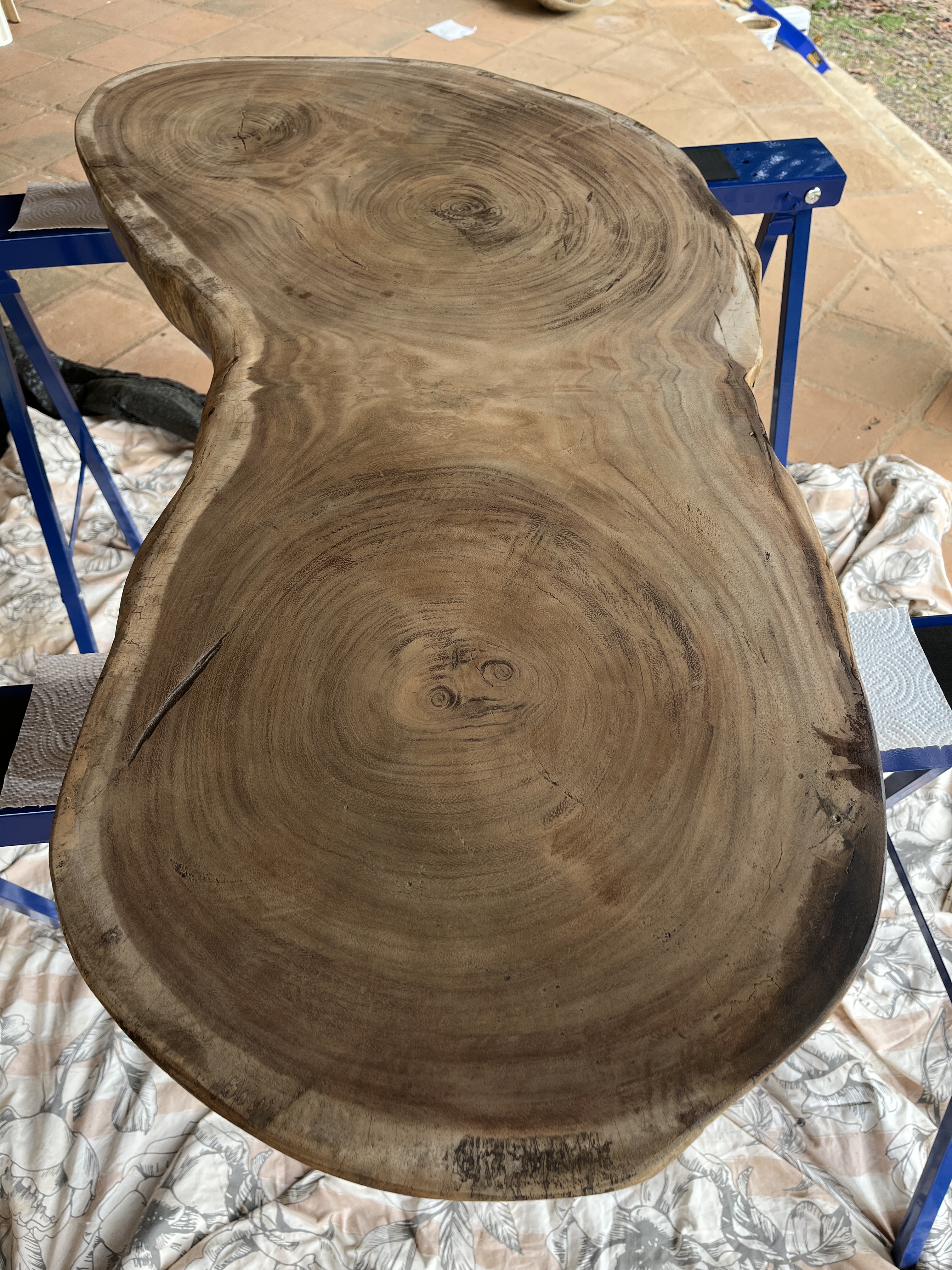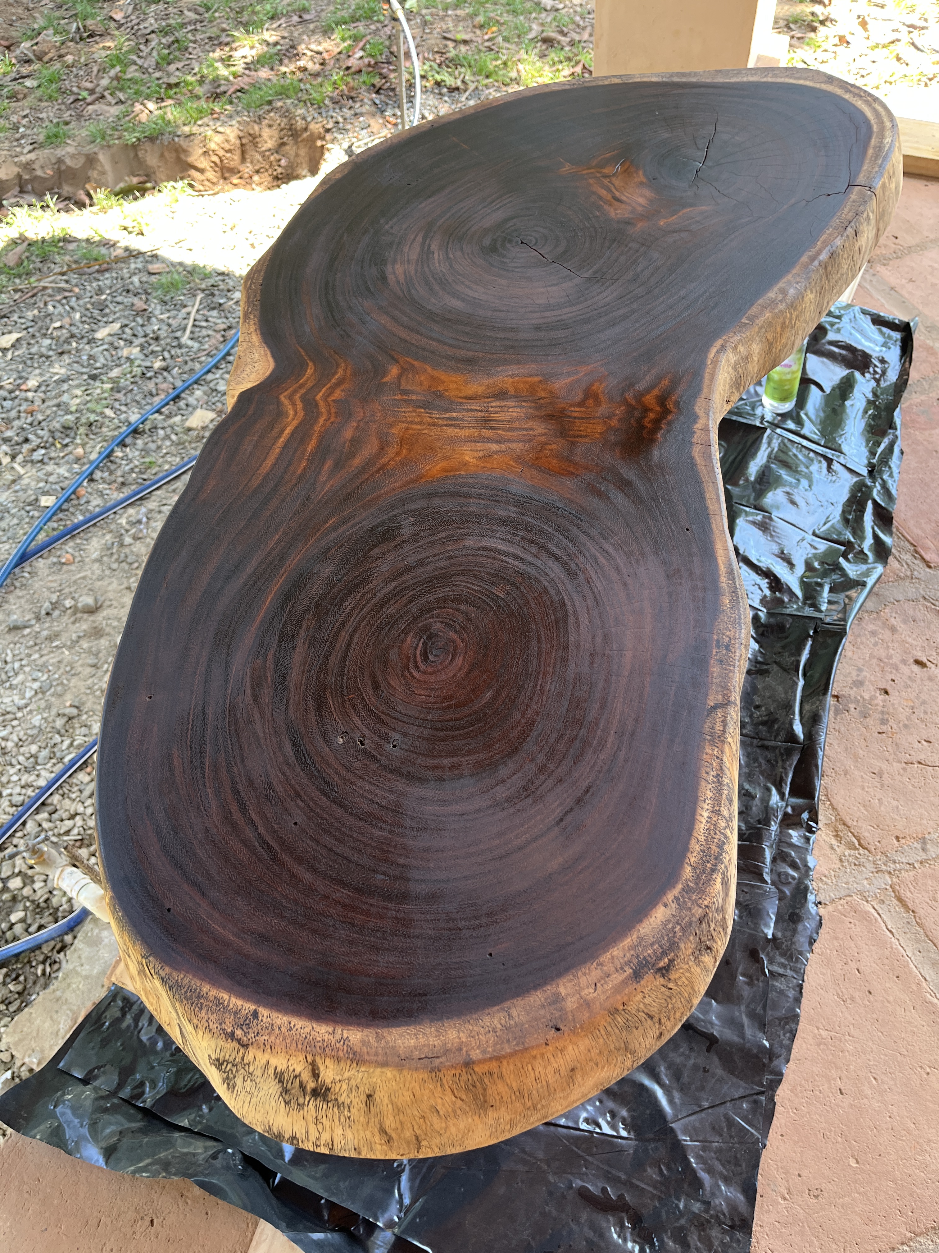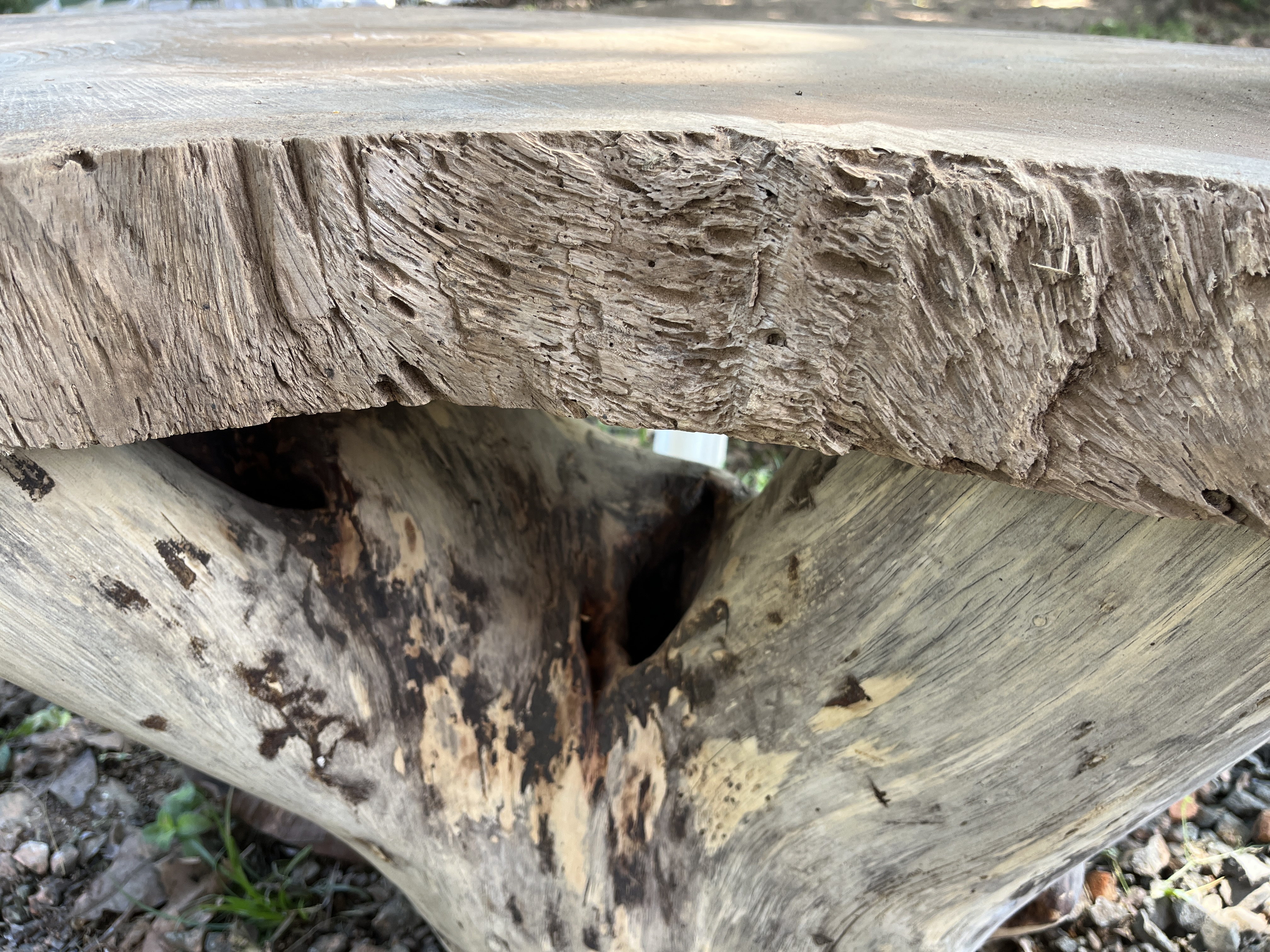 A year ago, March 2024, Daryl and I had the opportunity to purchase an old Corotu wood stump with a slab that could be used as a coffee table. We got the wood cut to height and brought it to our totally unliveable house.