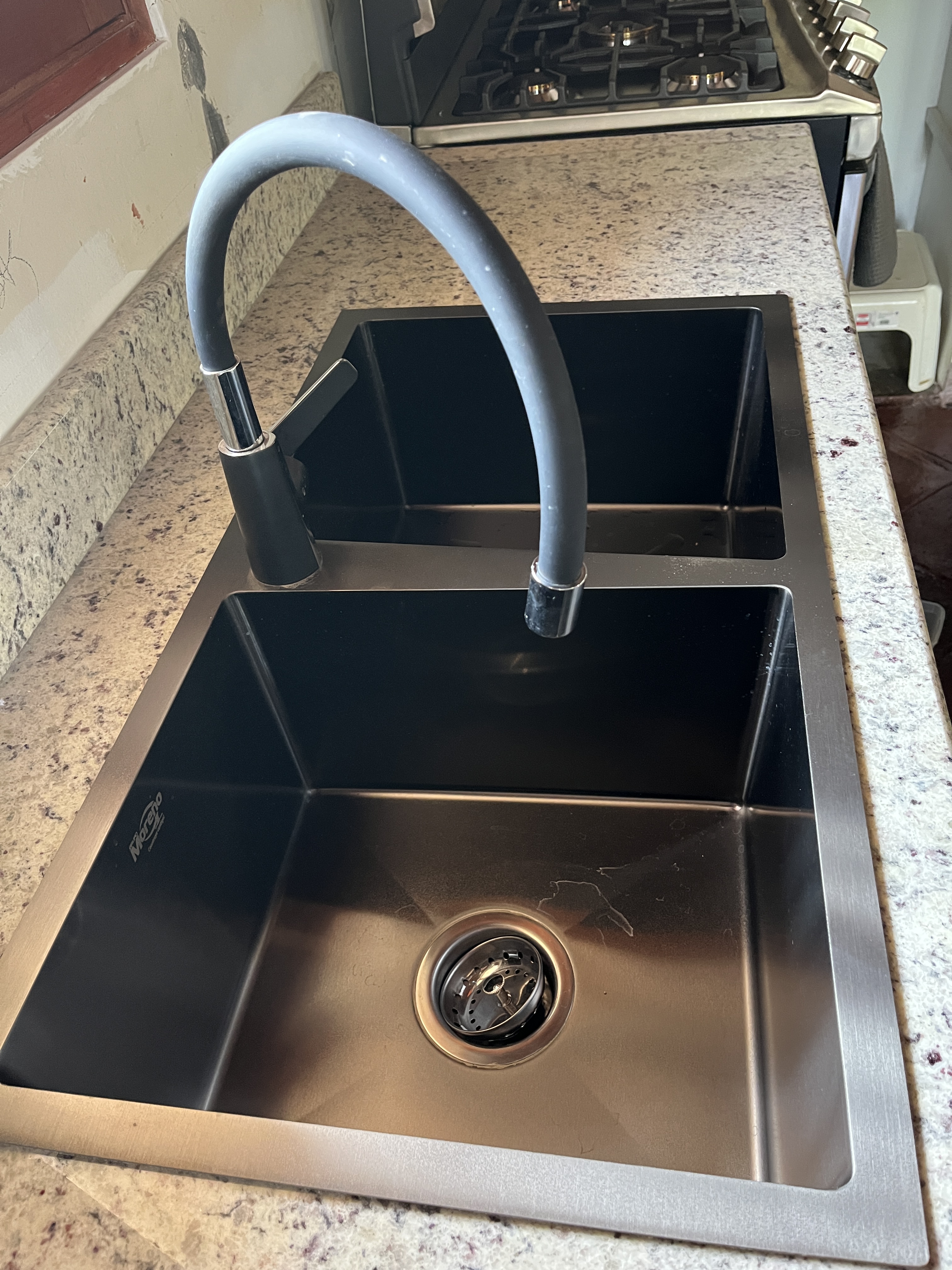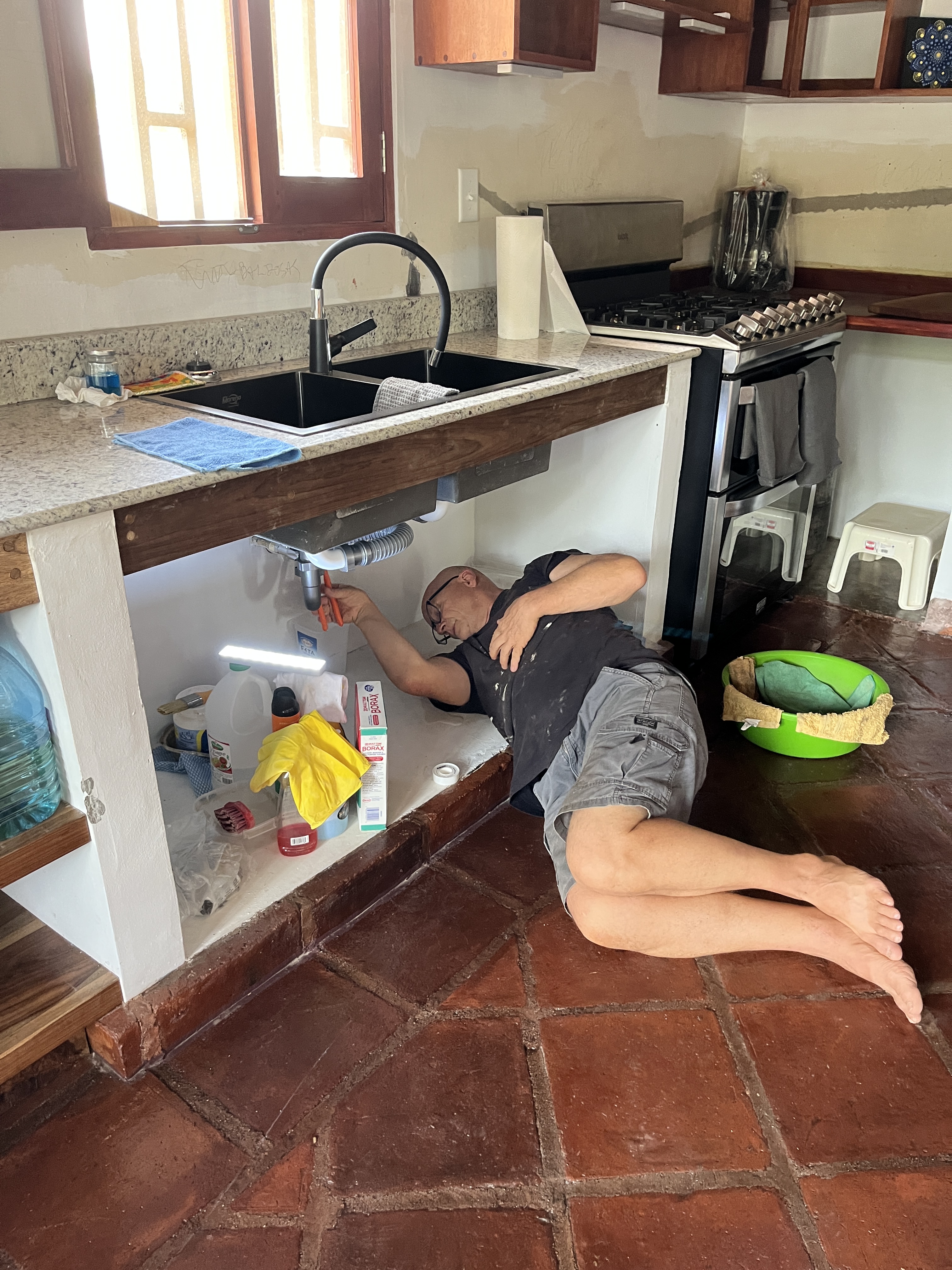 We have this lovely ‘European’ sink. At the shop we were told it was difficult to get the right sized parts here, but it is so pretty! Well the shop staff knew what they were talking about. Maybe it is a good thing we don’t have drawers and cupboards yet. Access is so much easier for the multiple attempts to stop leaks.