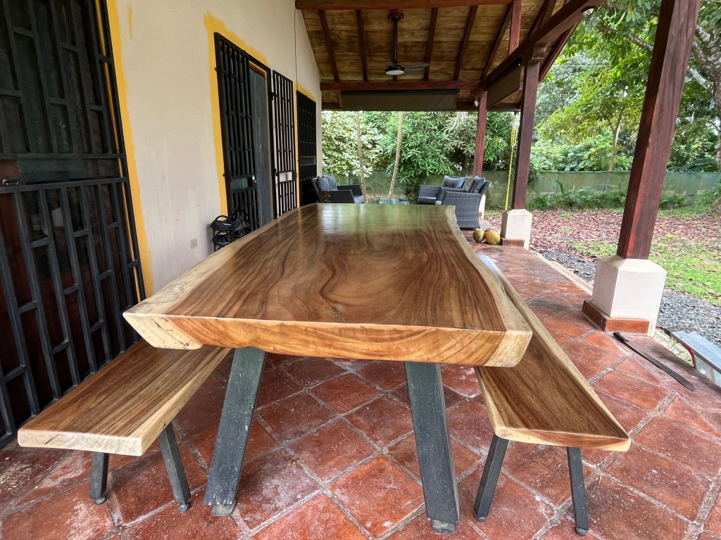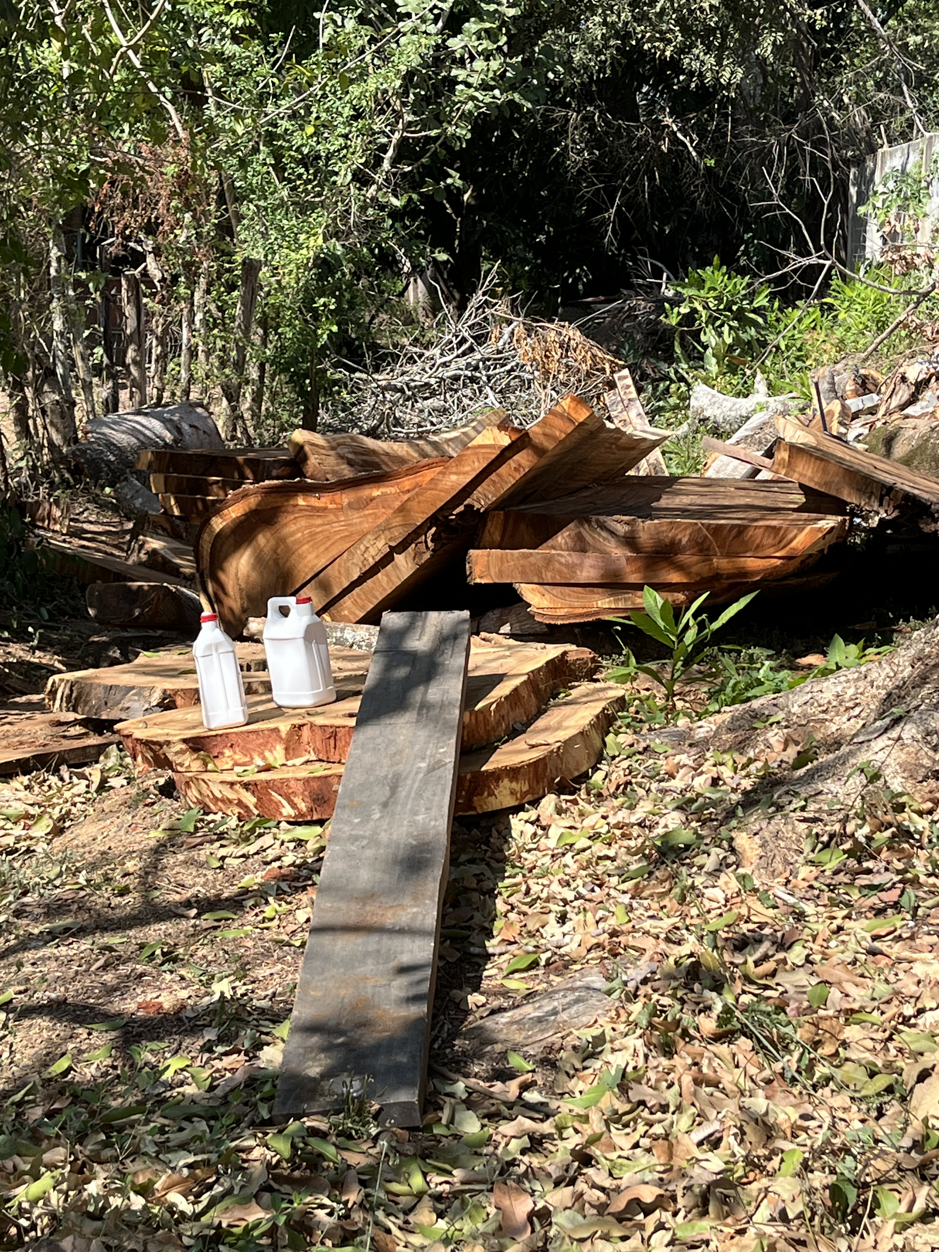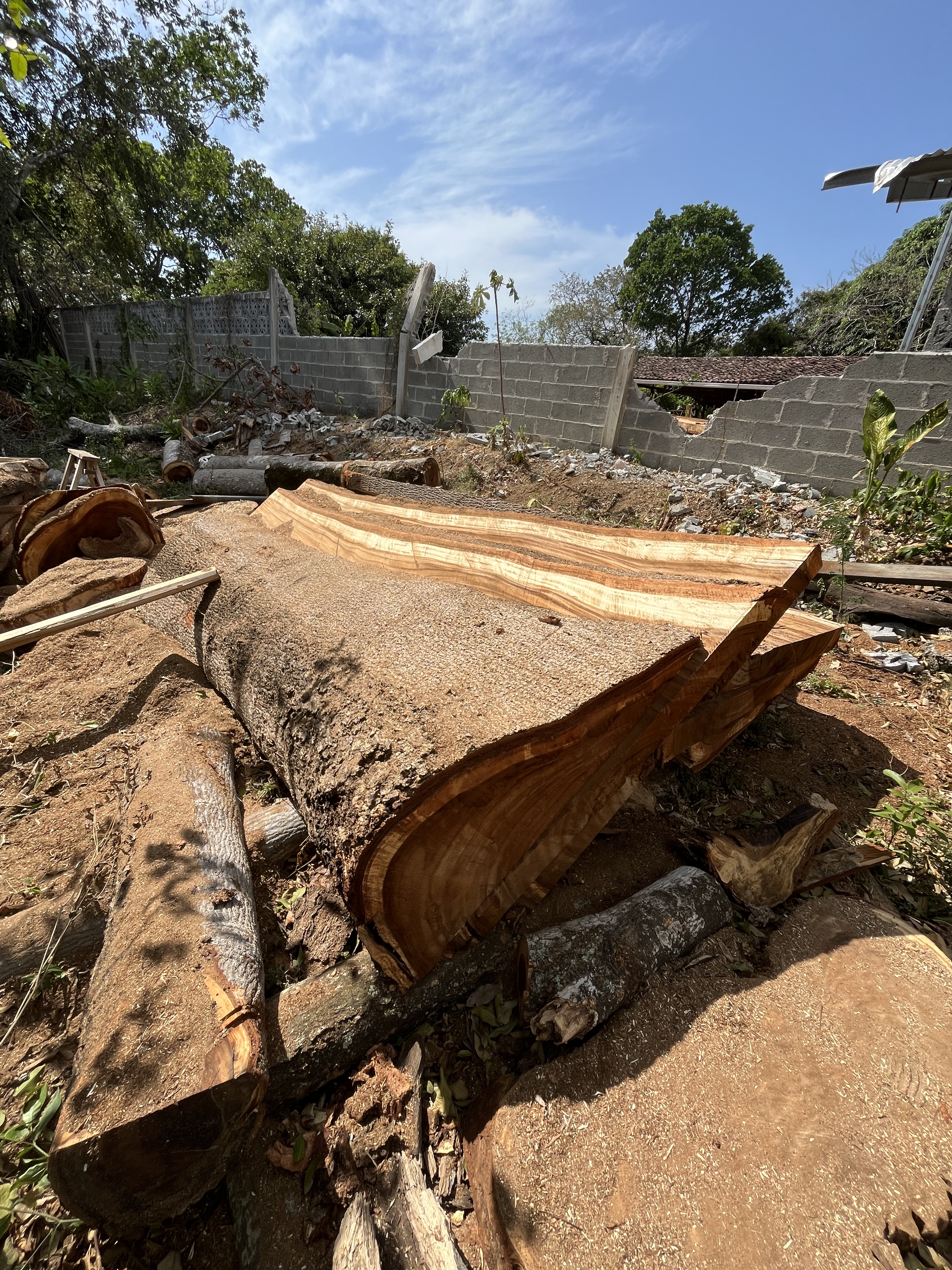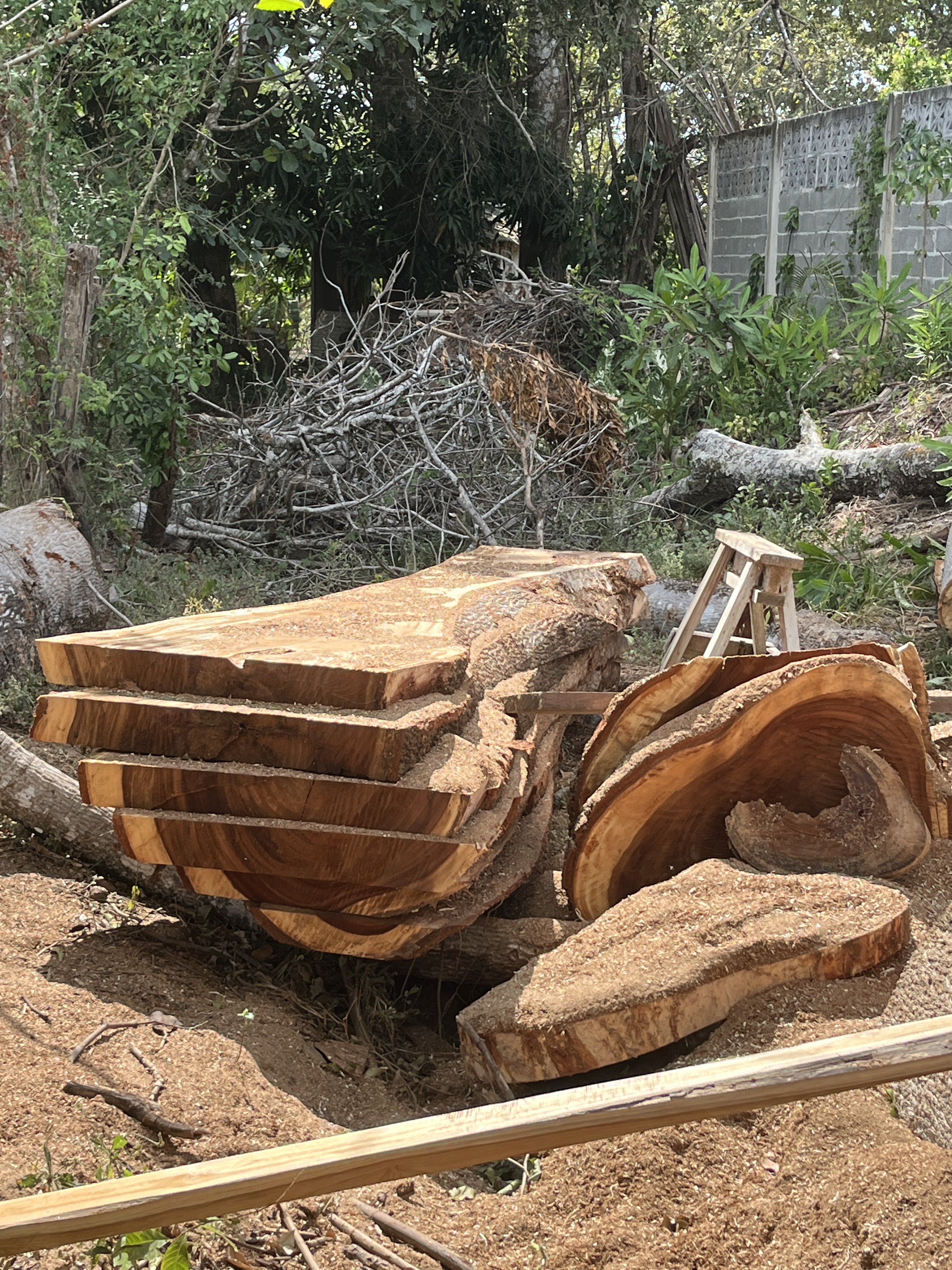 We really wanted a table top that was a solid piece of wood. We found they are not easy to come by but this tree just happened to fall down. Right time, right place! After purchasing the slab we wanted, it was treated with a gasoline smelling liquid to keep it from being eaten by termites.