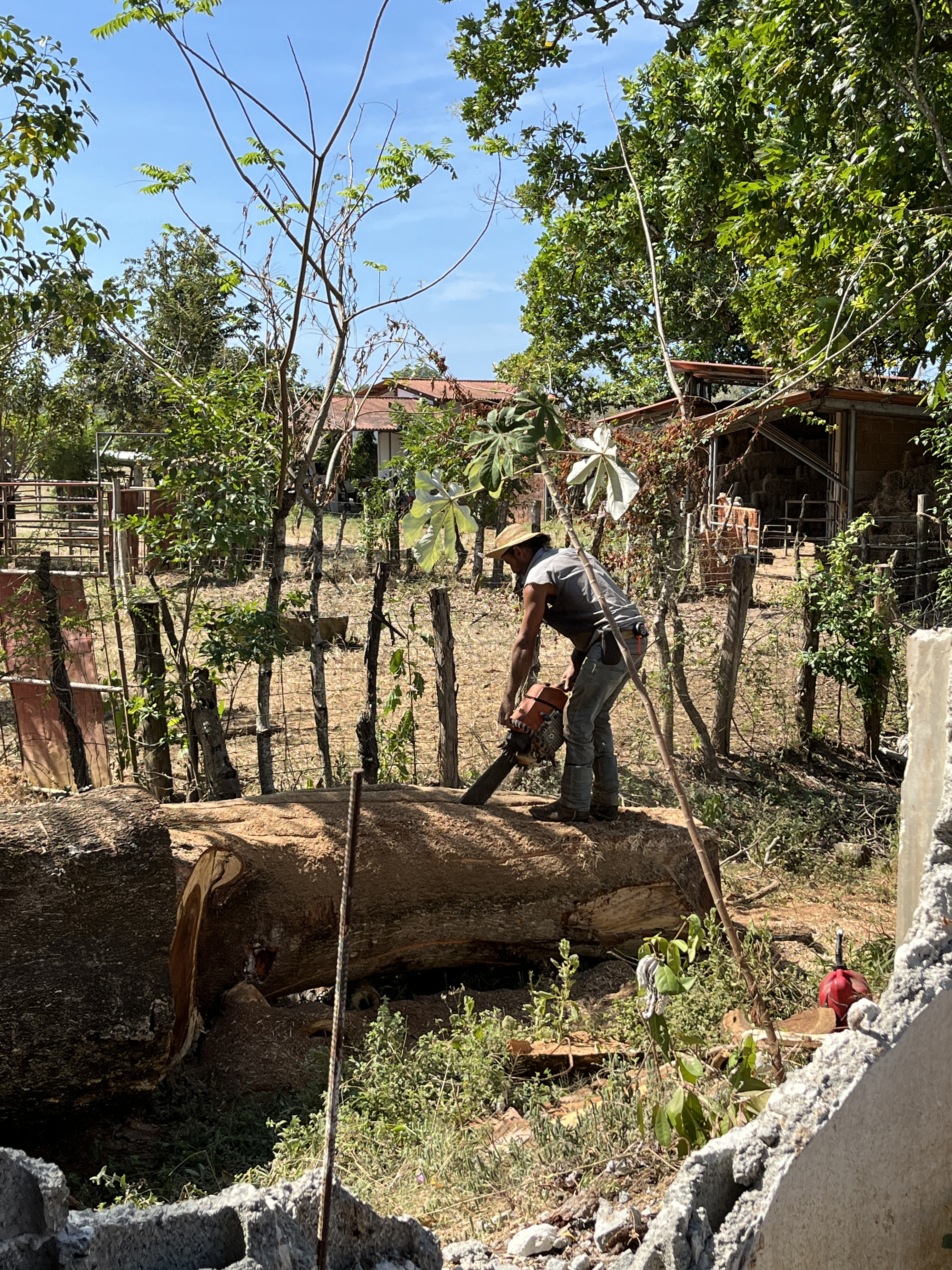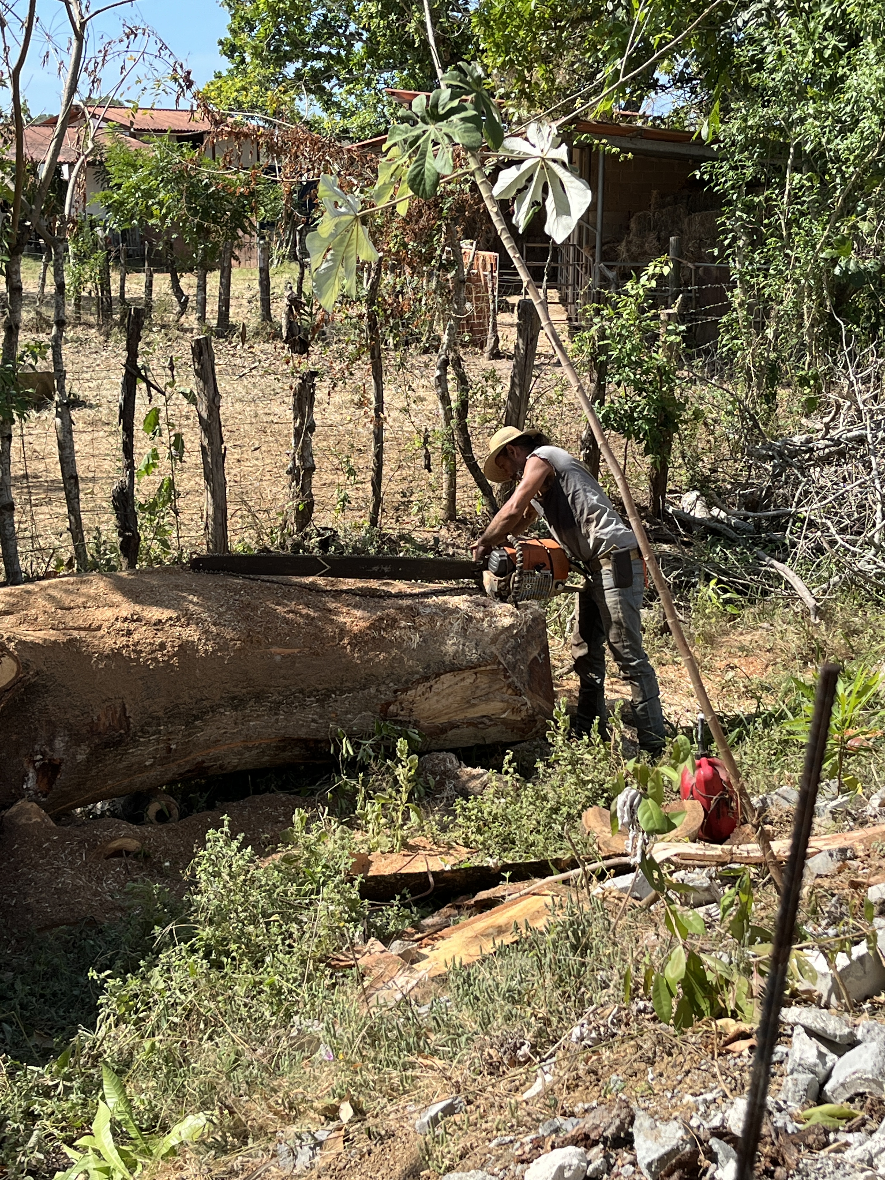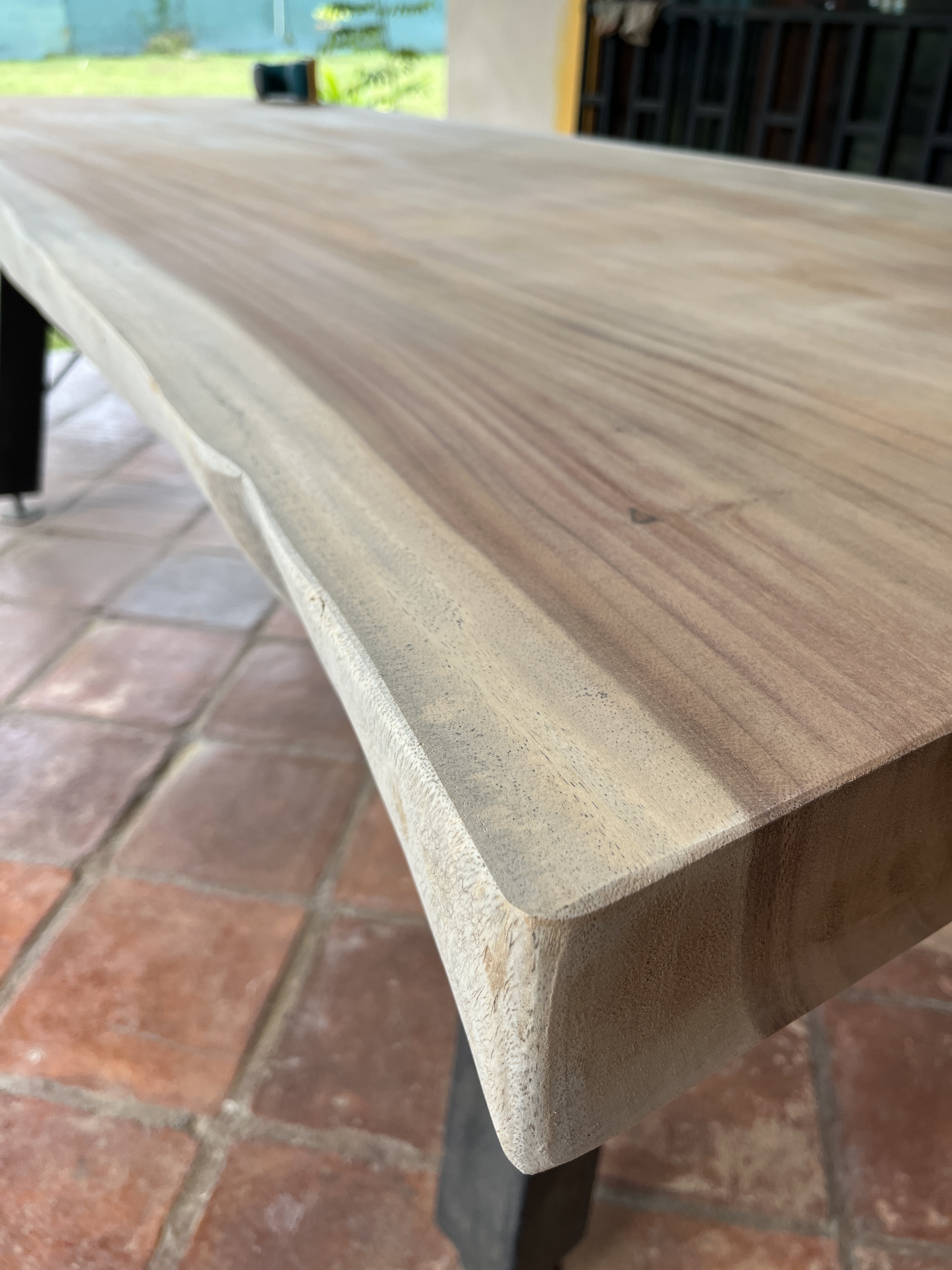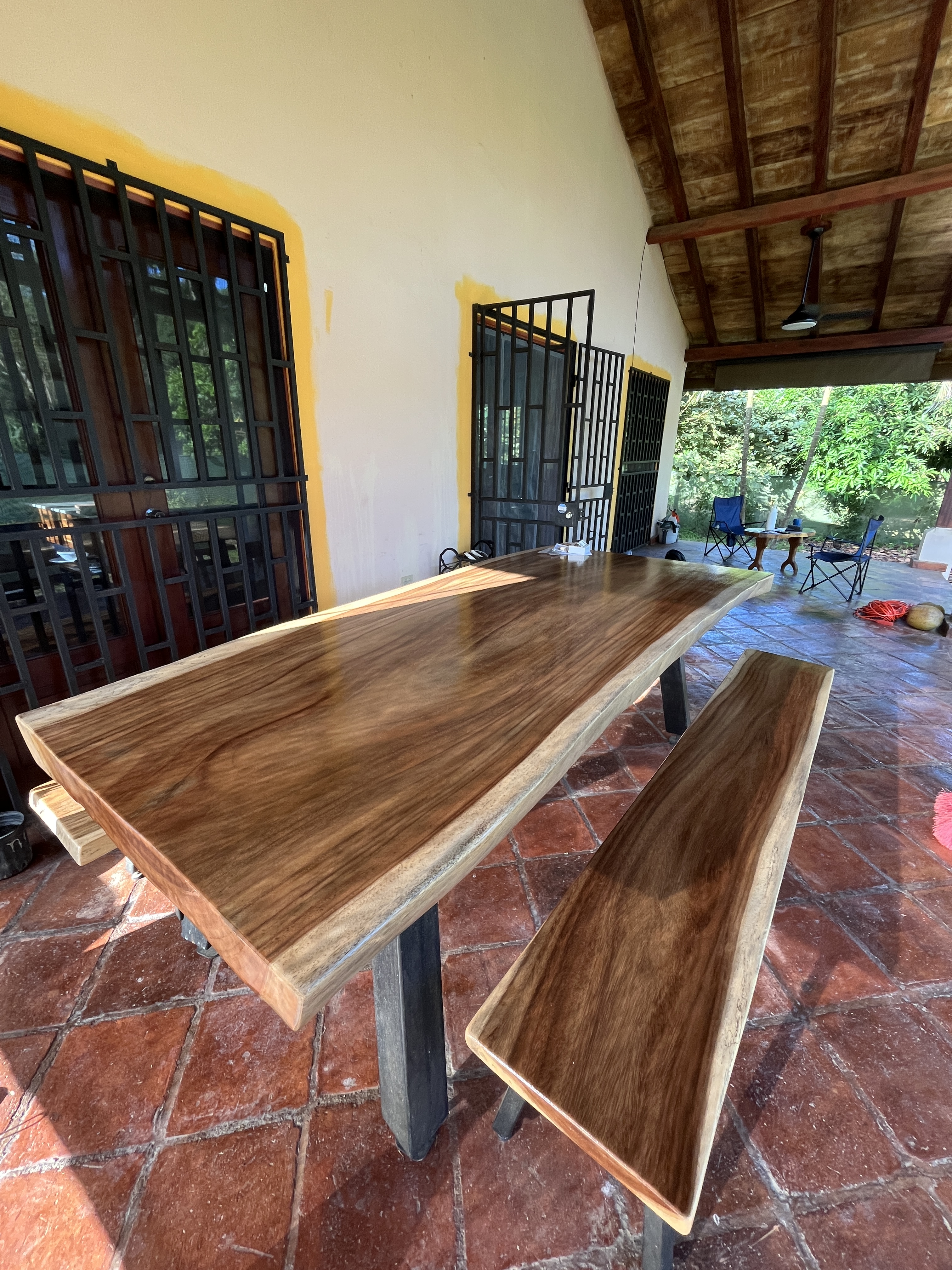 We really wanted a table top that was a solid piece of wood. We found they are not easy to come by but this tree just happened to fall down. Right time, right place! After purchasing the slab we wanted, it was treated with a gasoline smelling liquid to keep it from being eaten by termites.