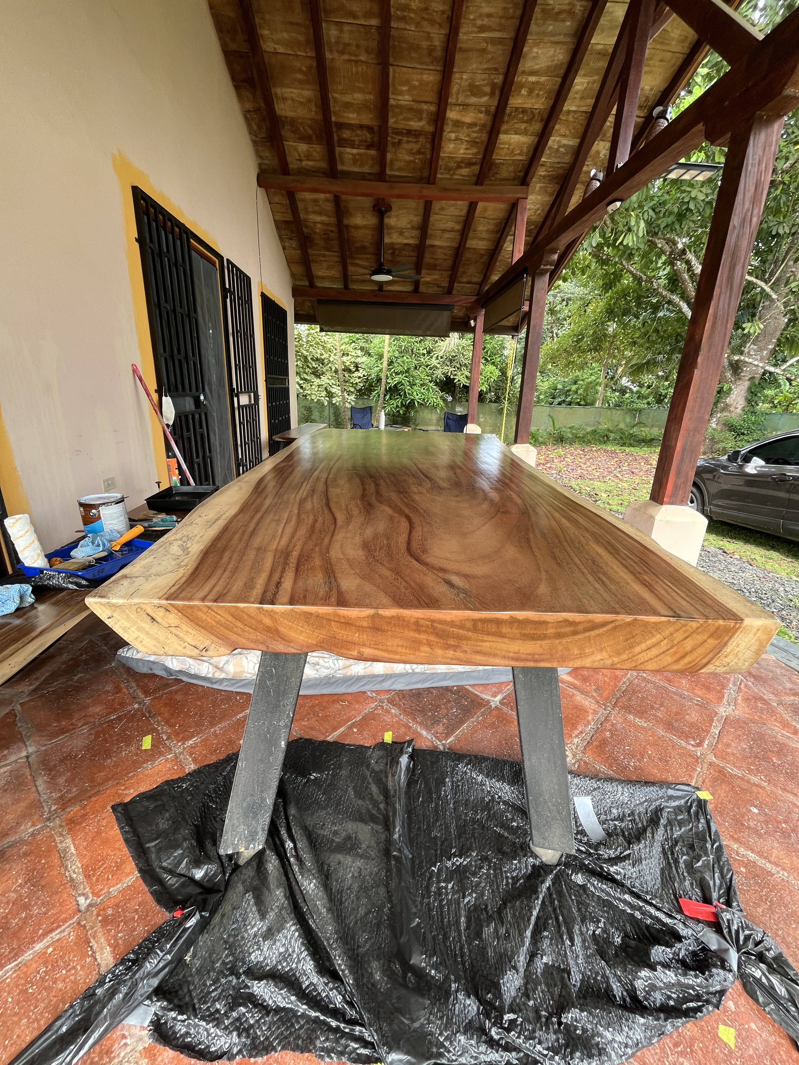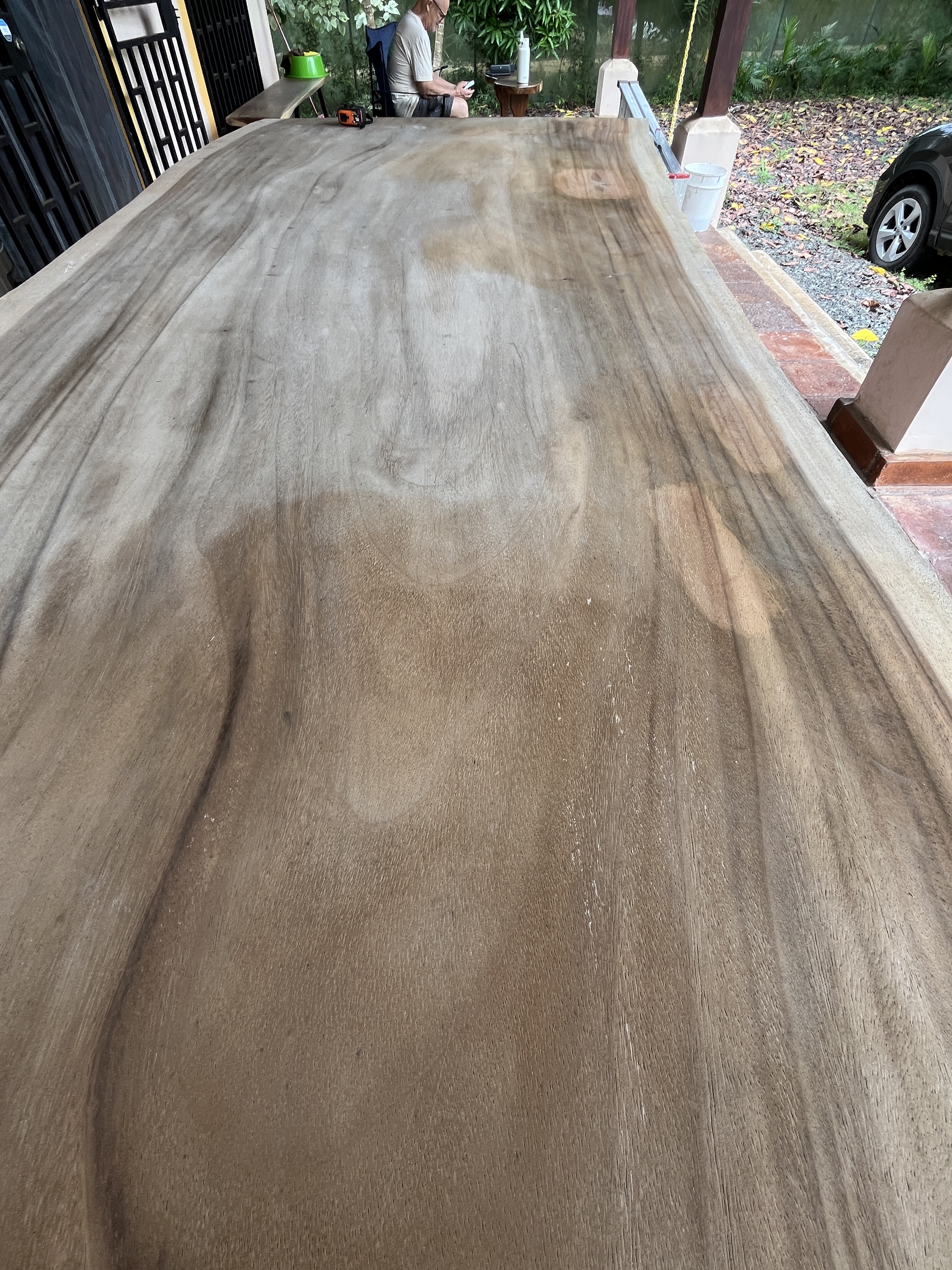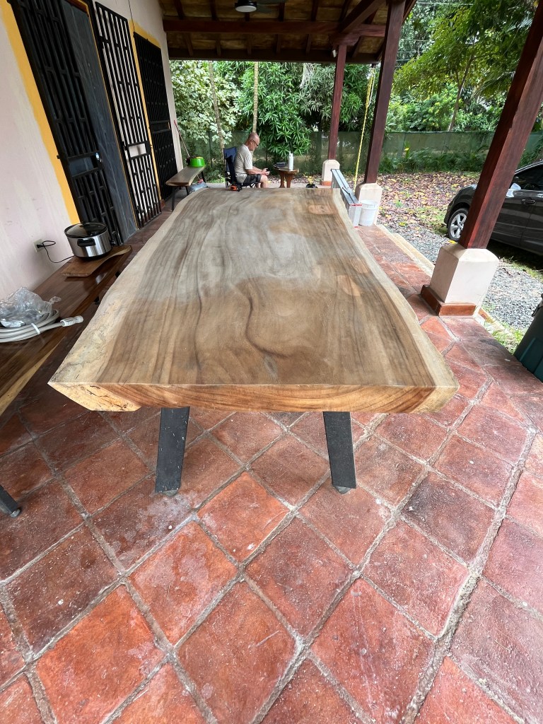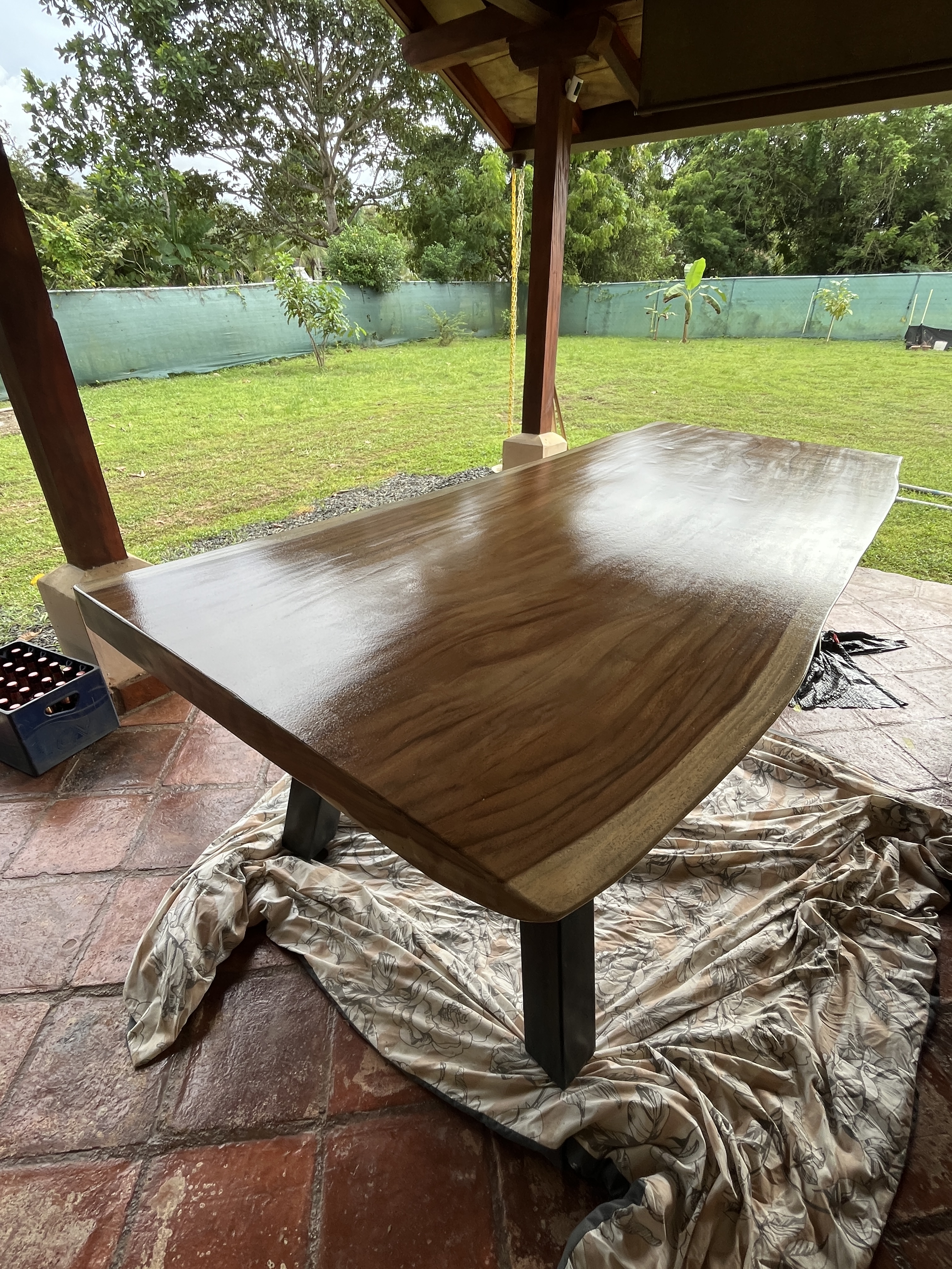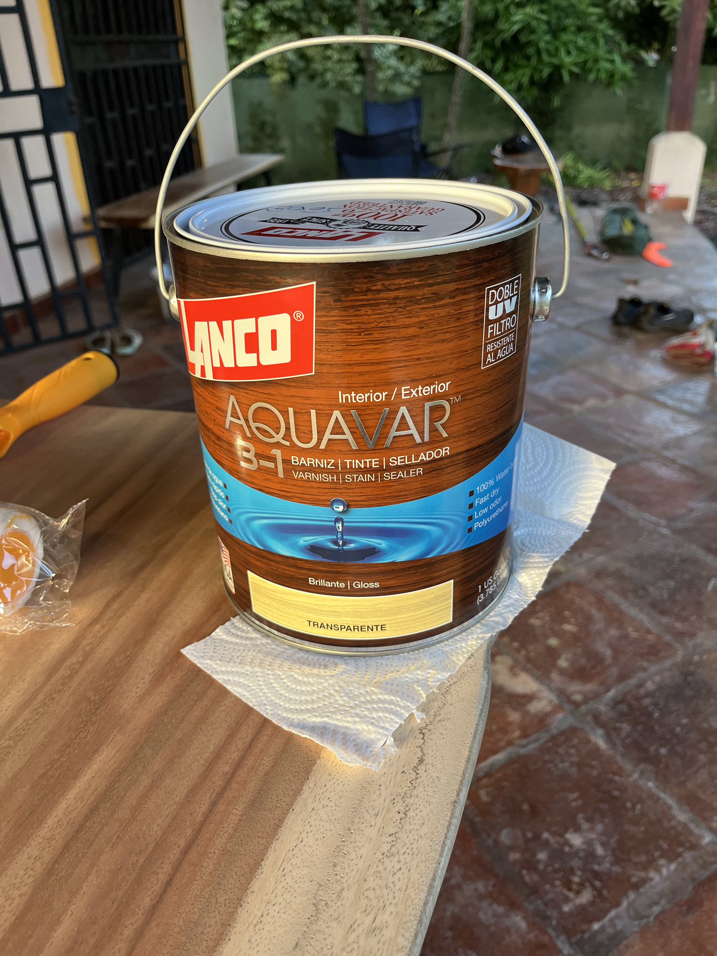 I applied 8 coats of Aquavar. It is still rainy season here, not the best time to be applying stain. I waited a couple of days between coats before lightly sanding and applying the next. Pretty good chance the table will need another sanding and staining when the dry season arrives to give it a proper finish. We just needed a table!