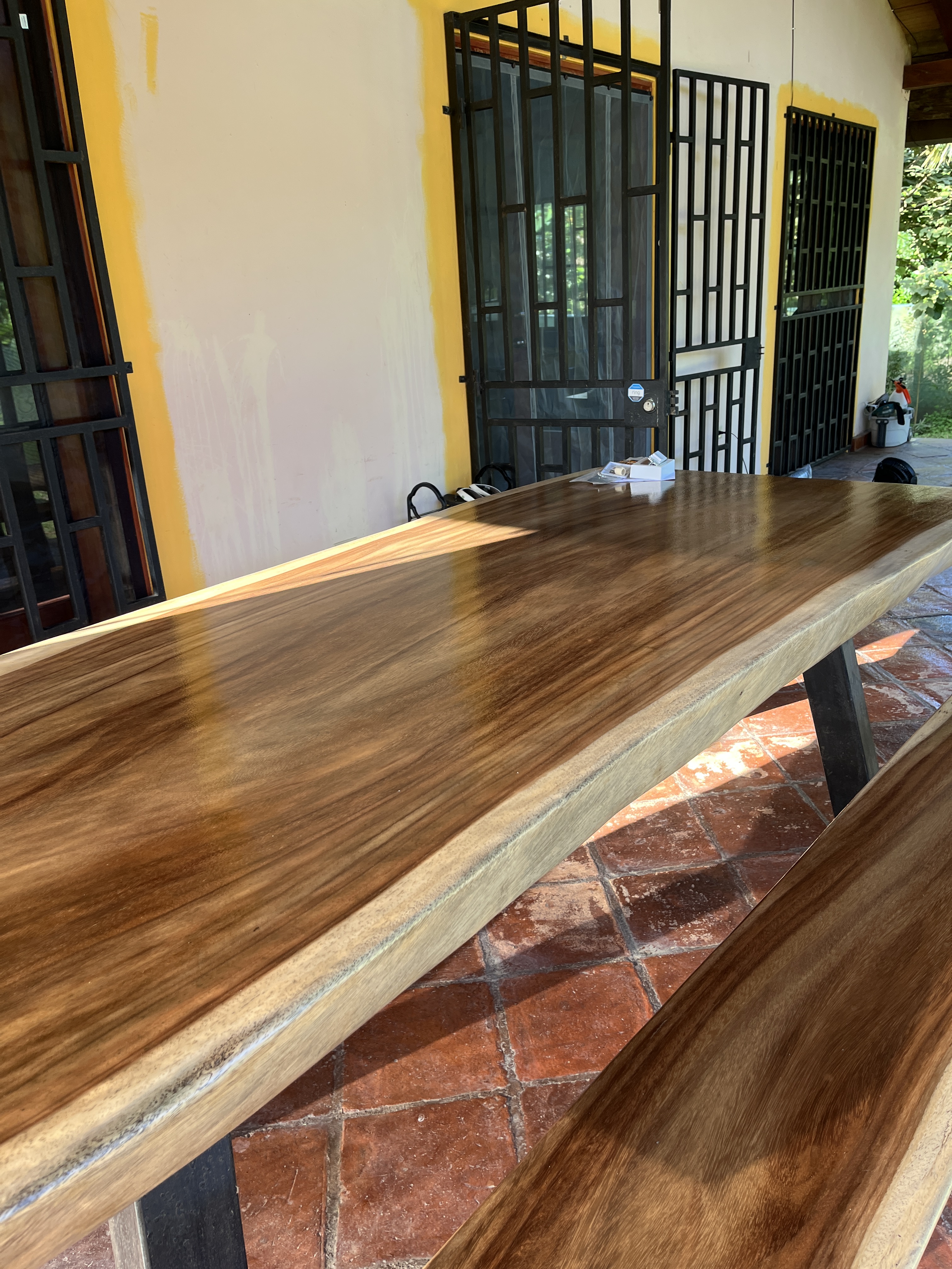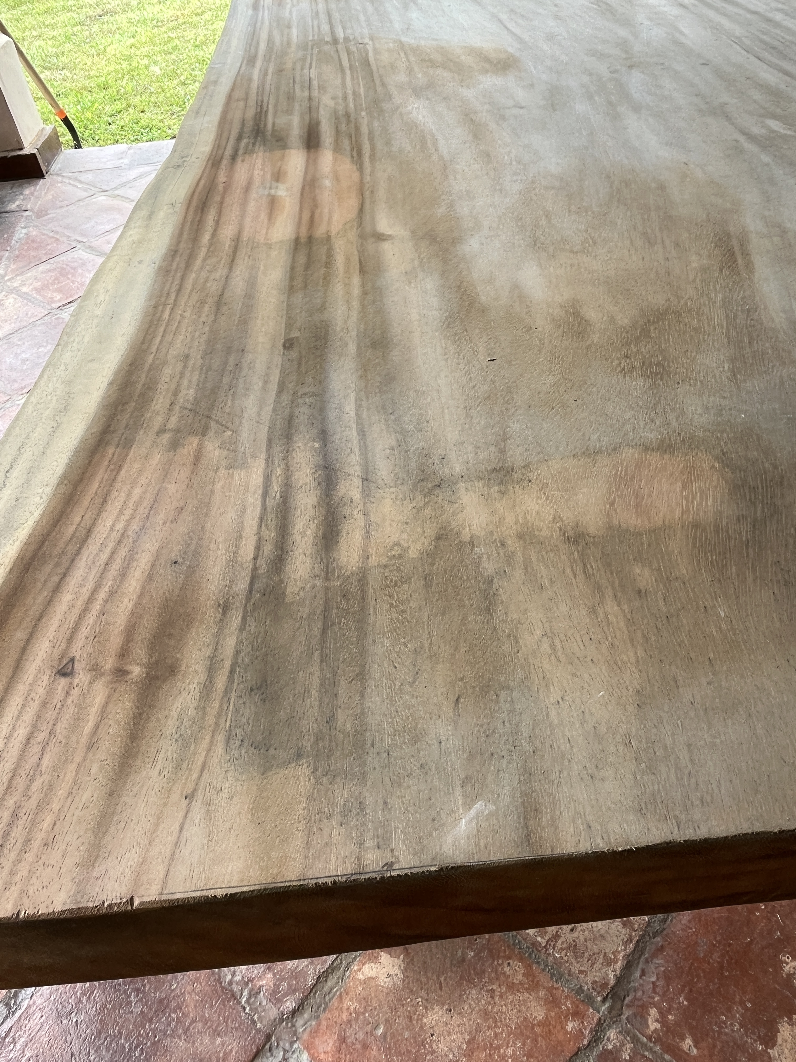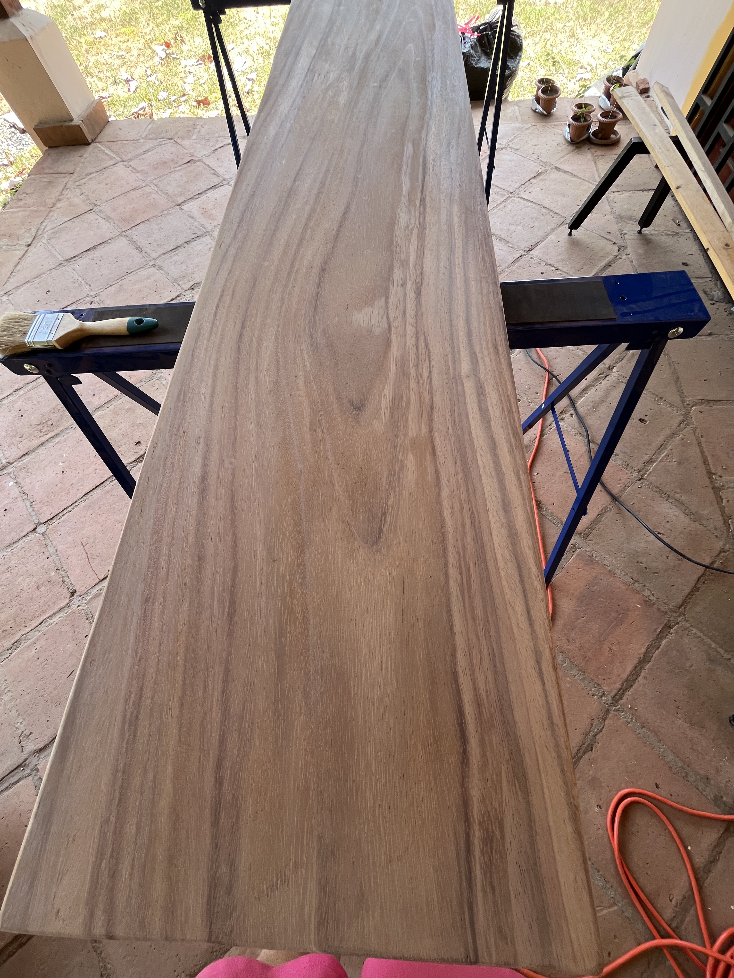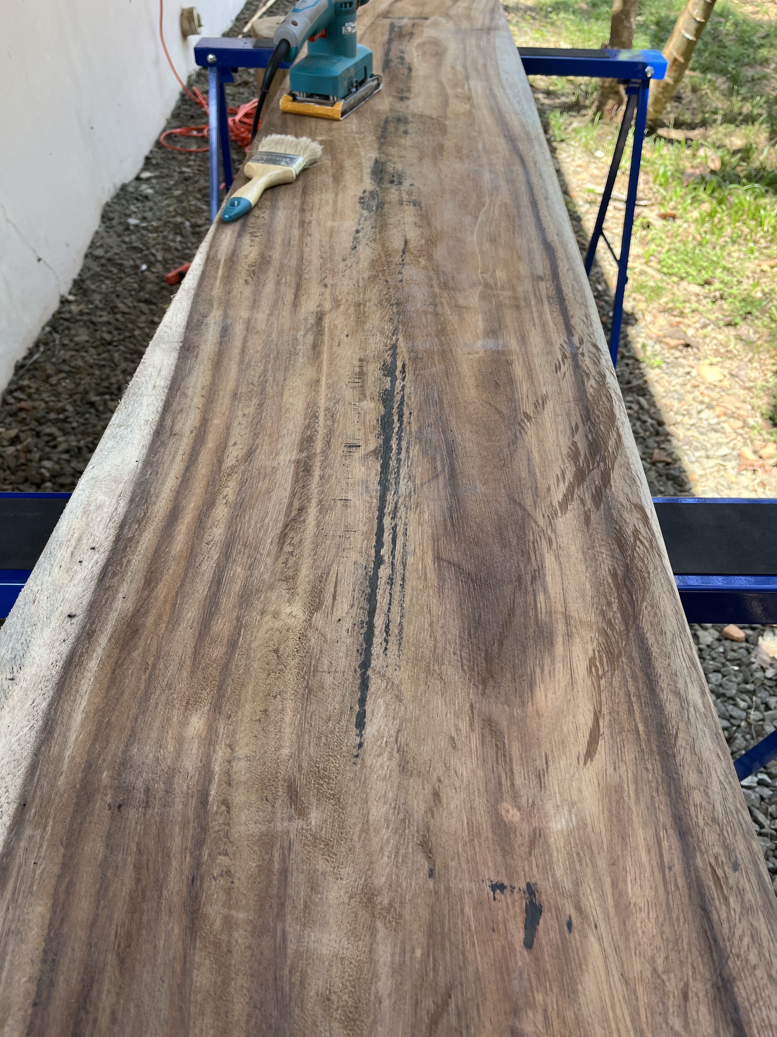 I applied 8 coats of Aquavar. It is still rainy season here, not the best time to be applying stain. I waited a couple of days between coats before lightly sanding and applying the next. Pretty good chance the table will need another sanding and staining when the dry season arrives to give it a proper finish. We just needed a table!