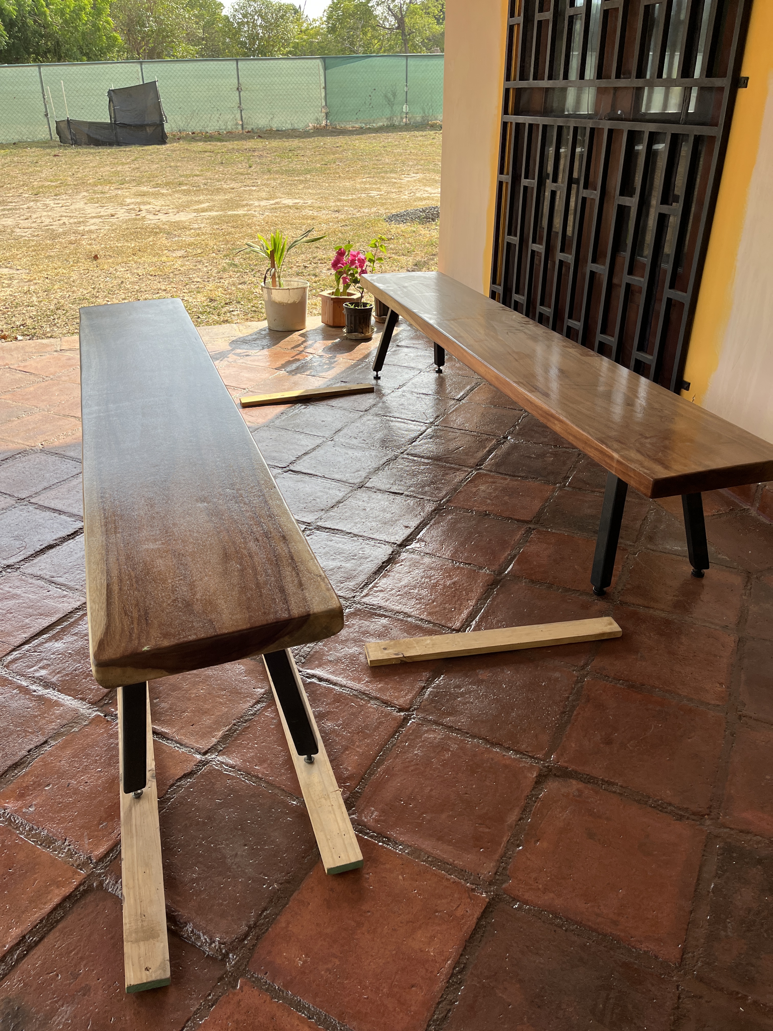 We also had two benches cut from the same tree. They did not need as much drying time as so much smaller. Last spring before going back to Canada, both bases and benches were delivered separately. There was quite a bit of staining from being stacked. After a lot of sanding and several coats of stain, the benches looked really good. Then Daryl put both pieces together.