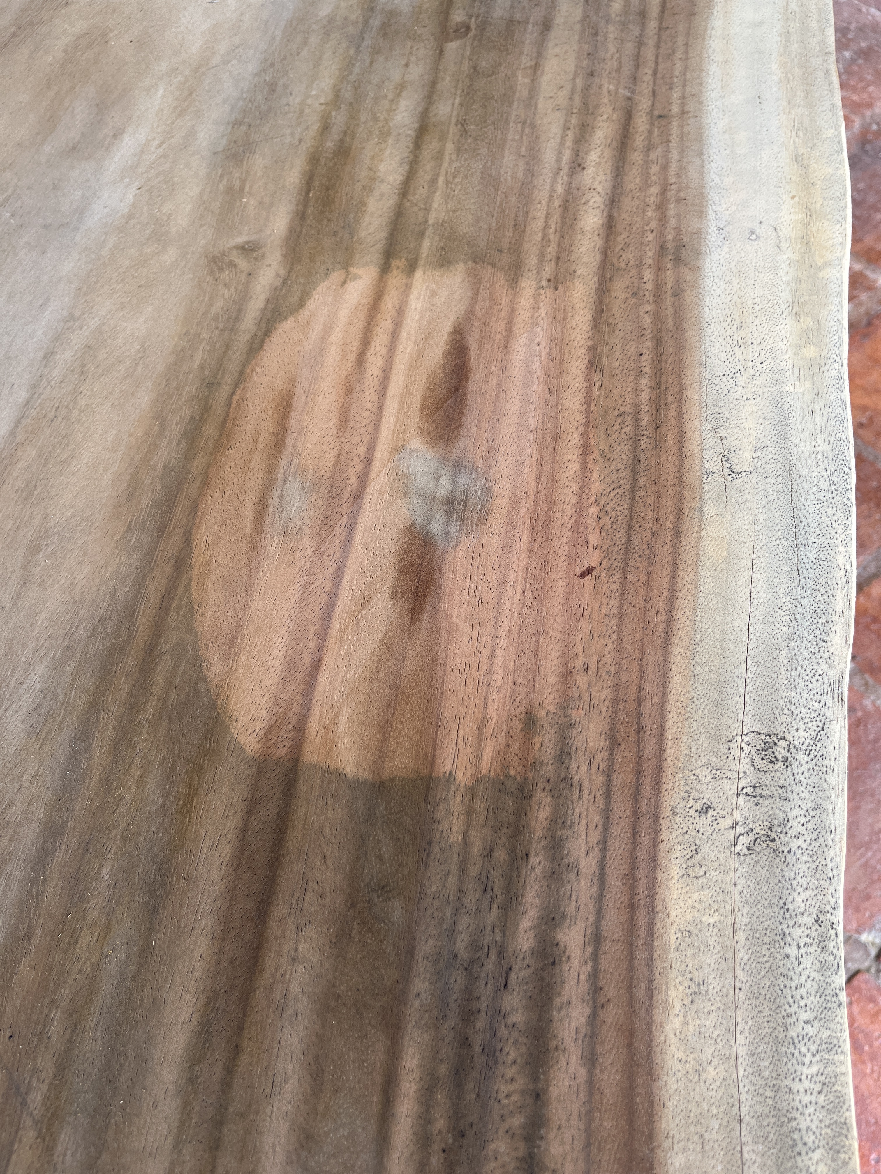 There was a fair amount of dark stains on the wood. Daryl used an acid wash that worked really well. The entire table top had to be done, otherwise we had a polk-a-dot table top.